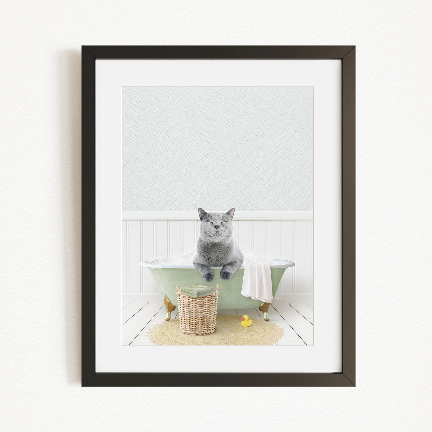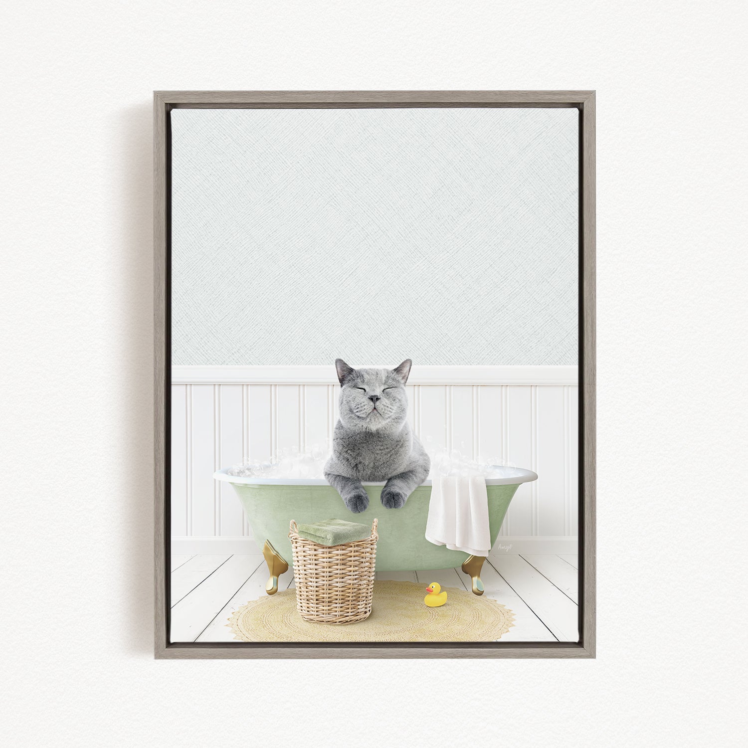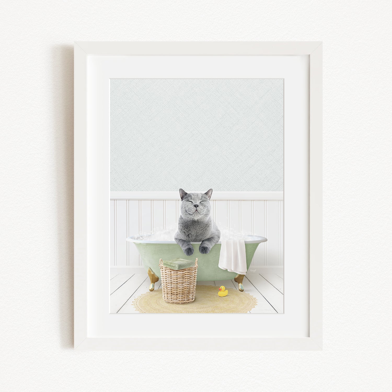 A gray cat sitting in a green bathtub filled with bubbles, surrounded by a basket of toys and a yellow rubber duck.