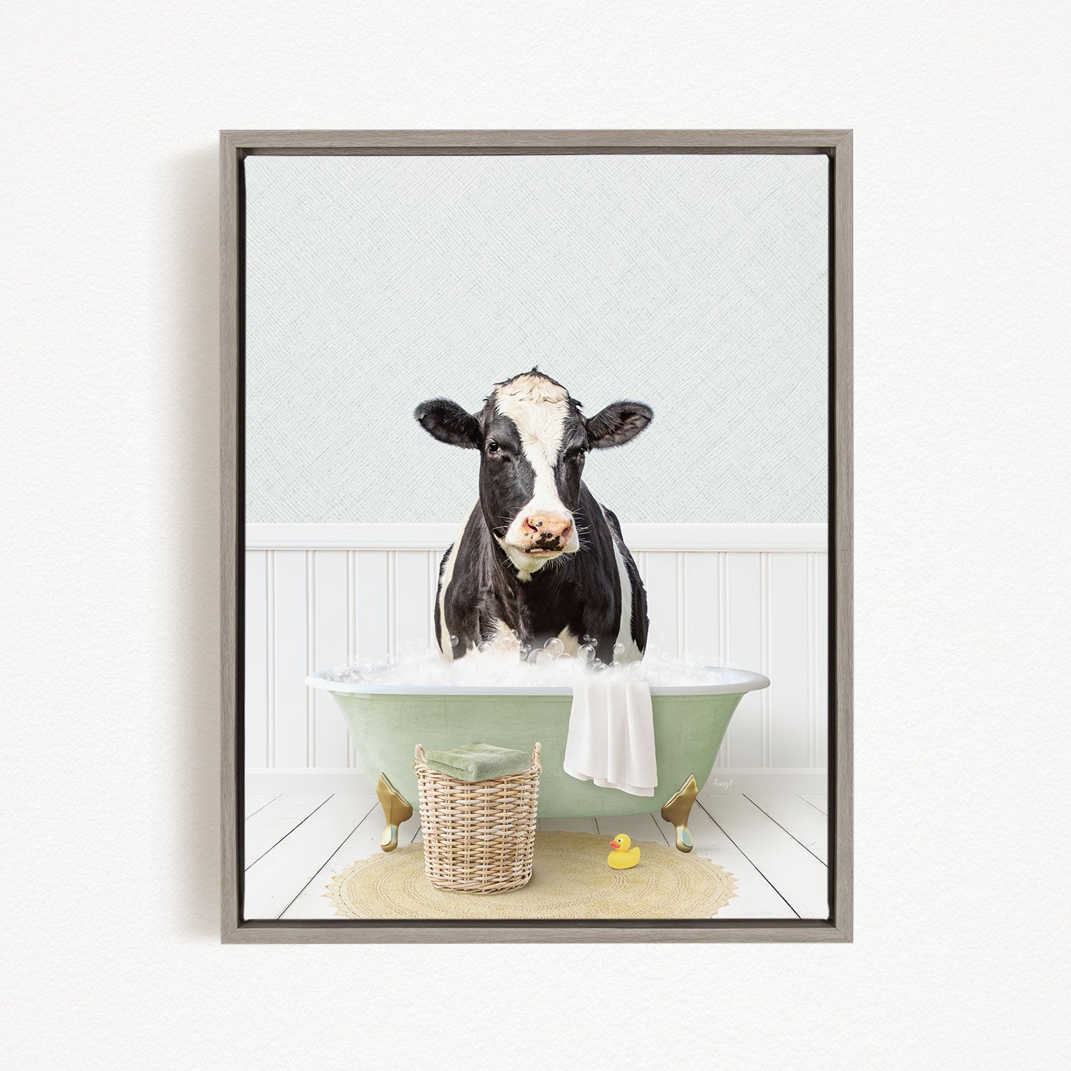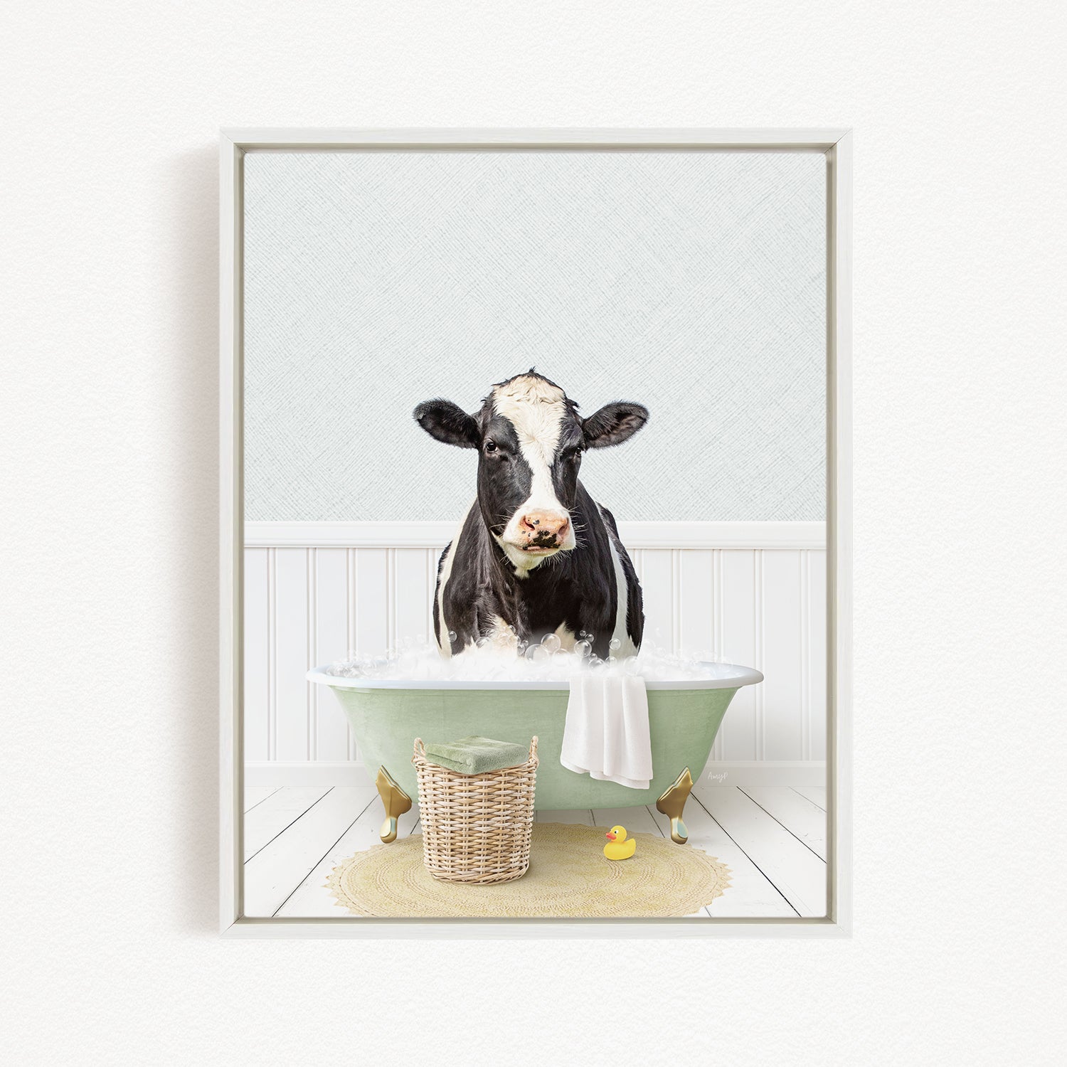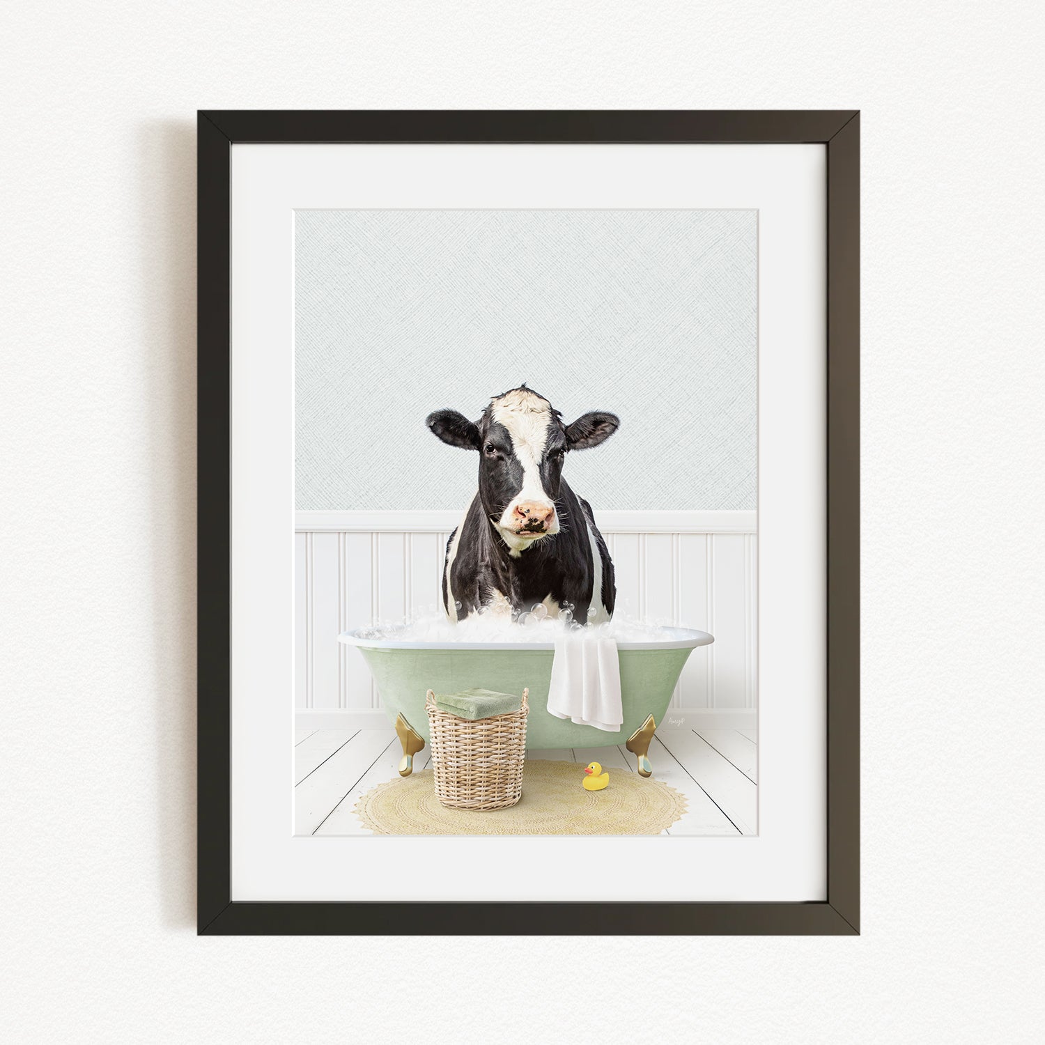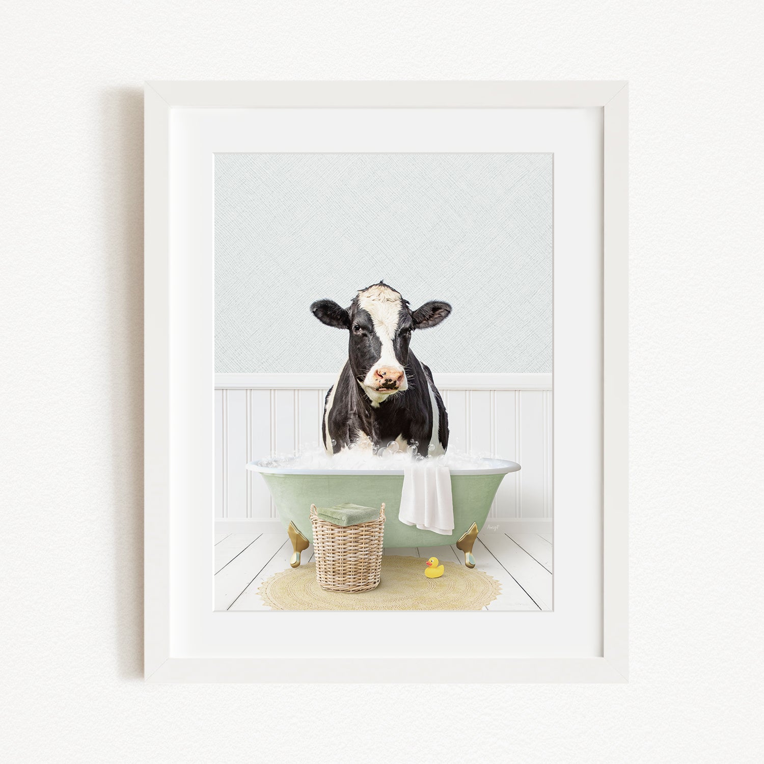 A black and white cow is sitting in a green bathtub filled with water, surrounded by a basket, a rubber duck, and a towel.