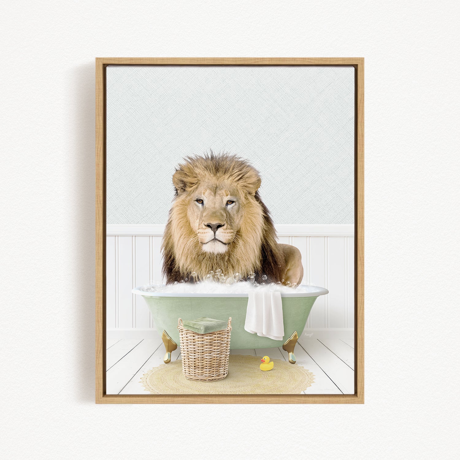 A lion sitting in a bathtub filled with water, surrounded by a basket of toys and a rubber duck.