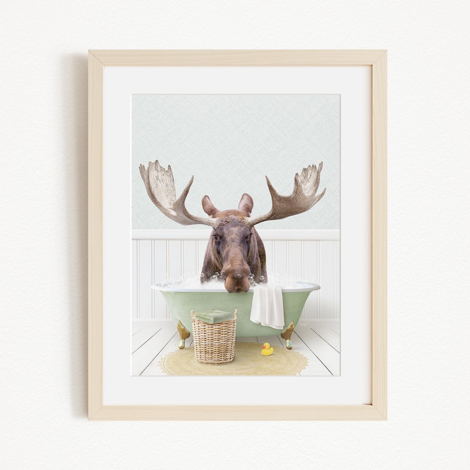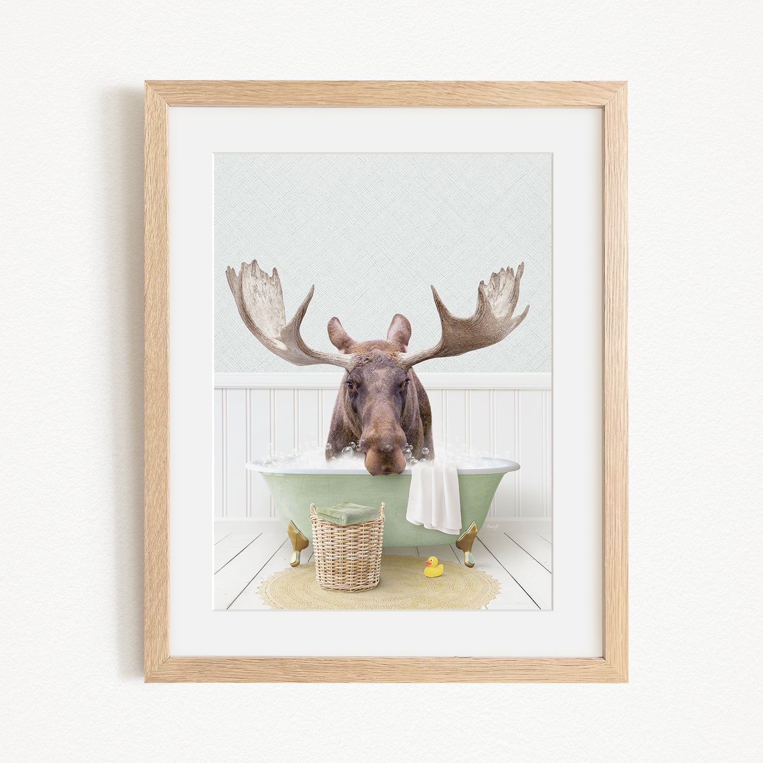 A framed image depicting a moose with large antlers sitting in a green bathtub, surrounded by a basket of rubber ducks and a yellow rubber ducky.