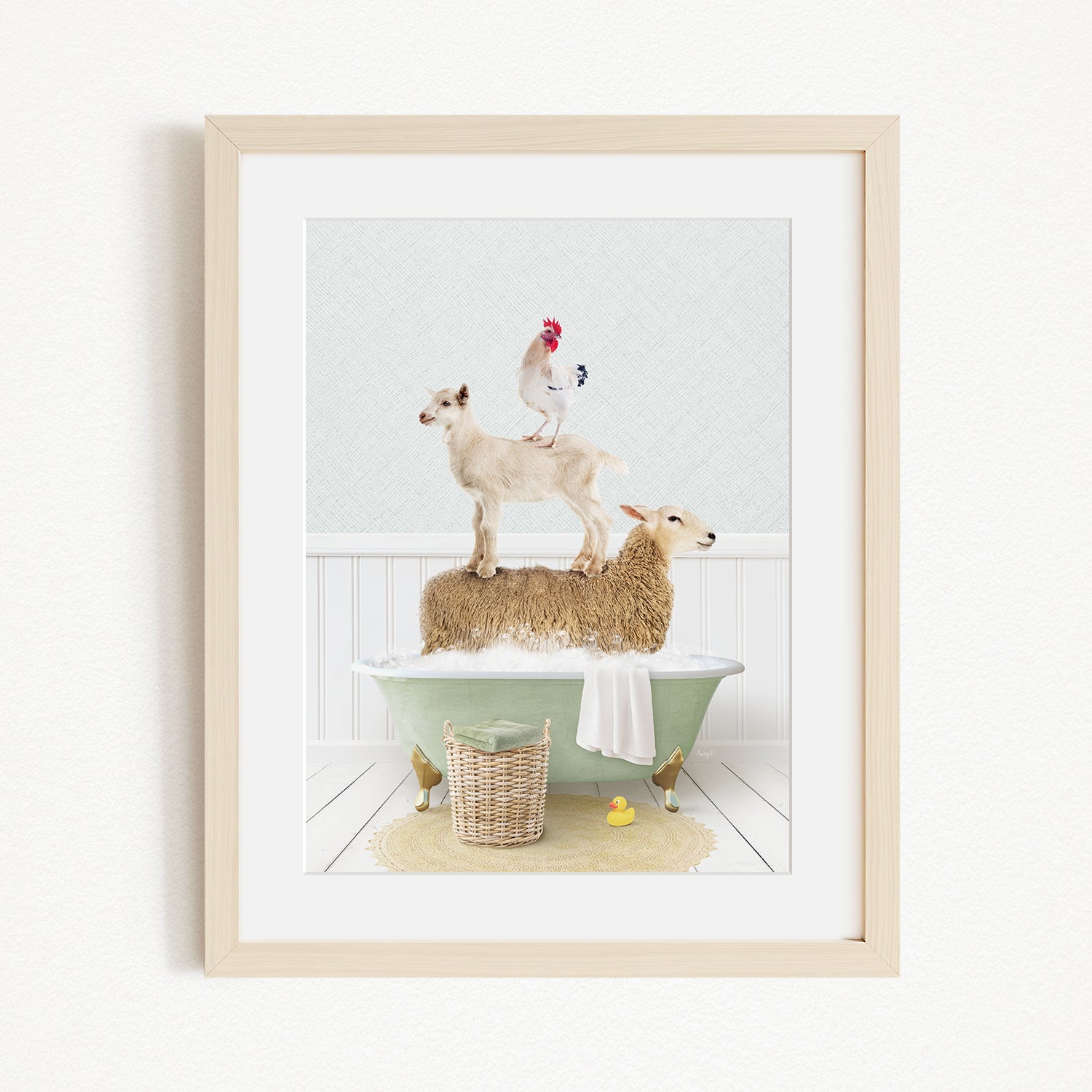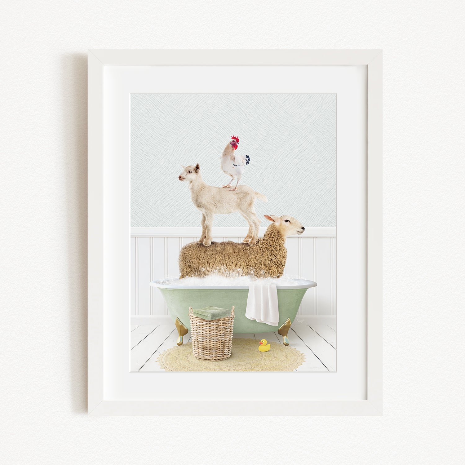 A framed image depicting a sheep standing on a tub filled with bubbles, with a chicken perched on top and a lamb lying on the tub's edge.