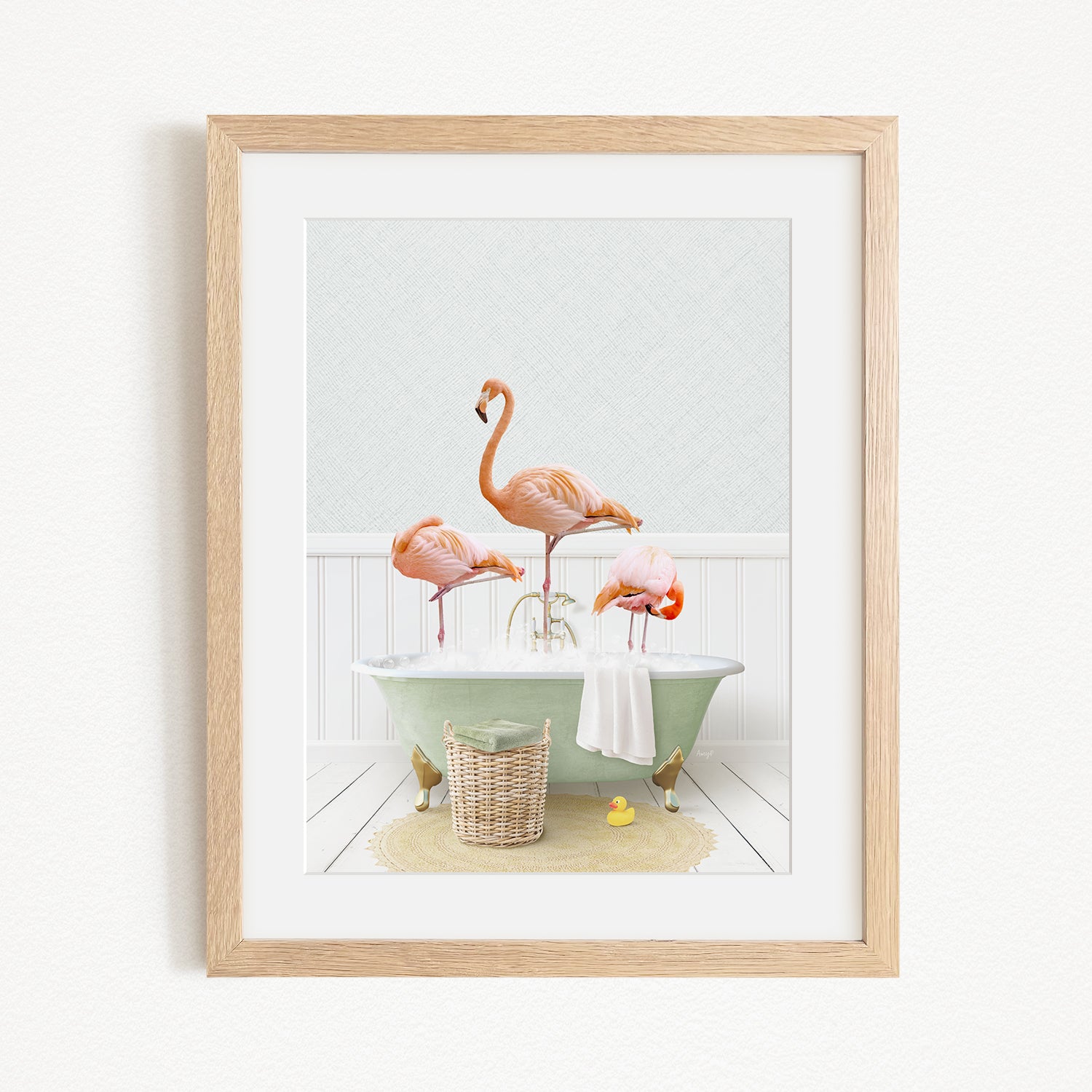 A framed image depicting three pink flamingos standing in a green bathtub filled with water, surrounded by a basket of bath toys and a yellow rubber duck.