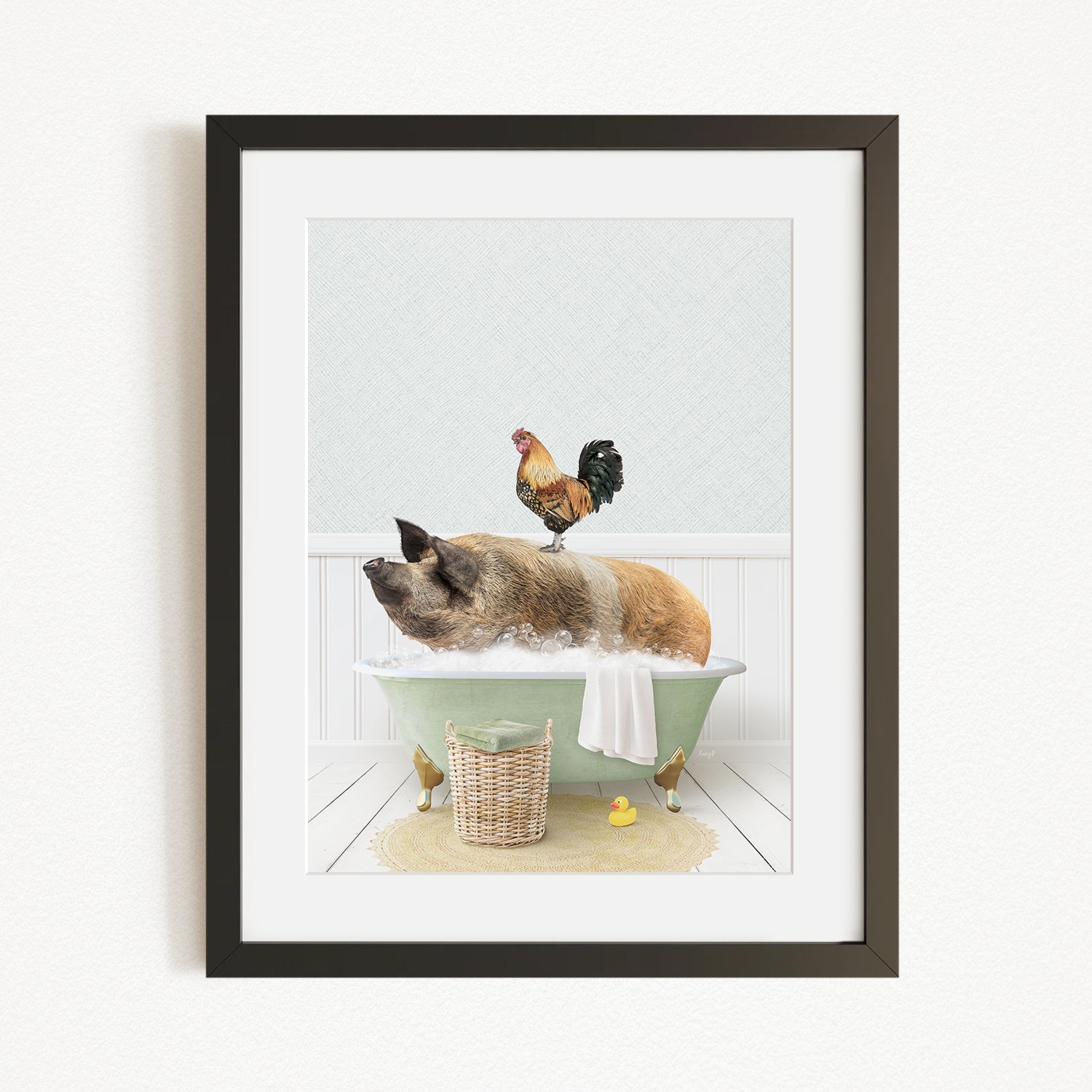 A framed image depicting a pig sitting in a bathtub, with a rooster perched on its back, and a basket of rubber ducks nearby.