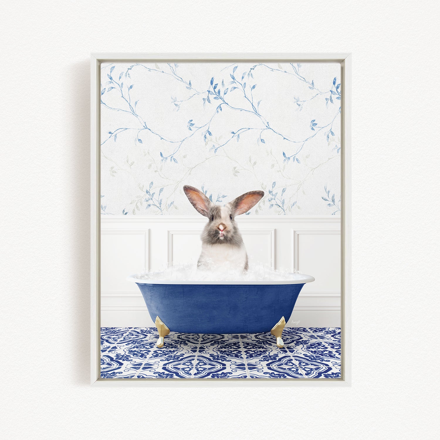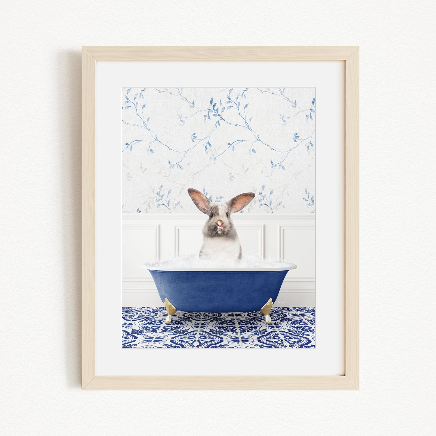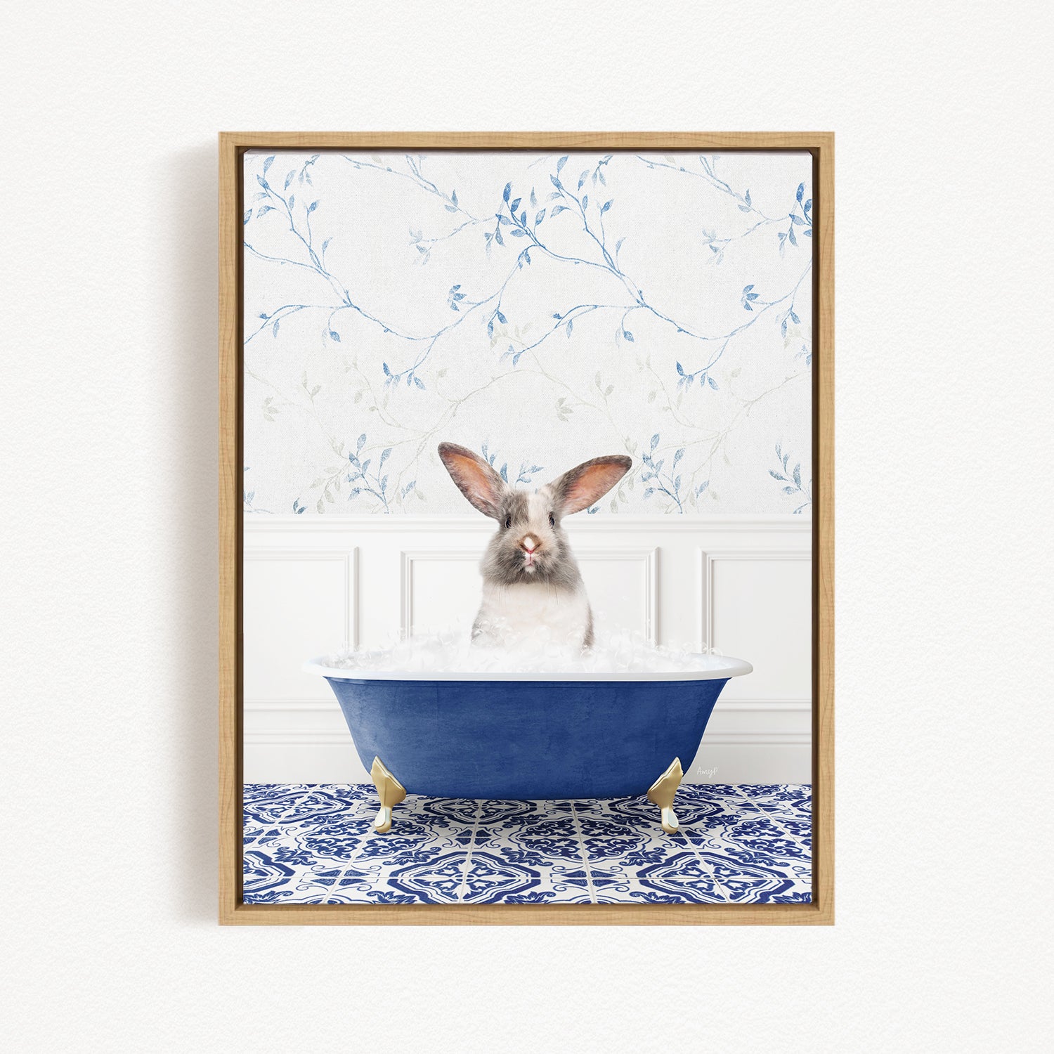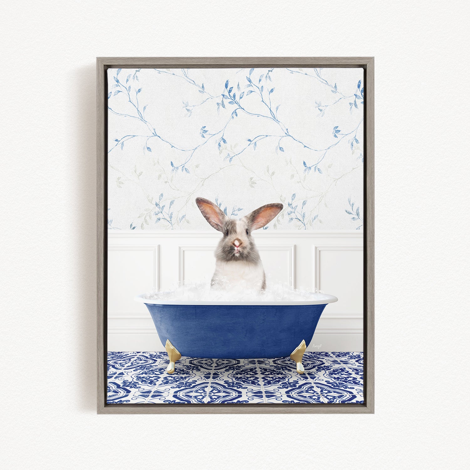 A gray and white rabbit sitting in a blue bathtub filled with water, with a patterned tile floor and a floral wallpaper in the background.