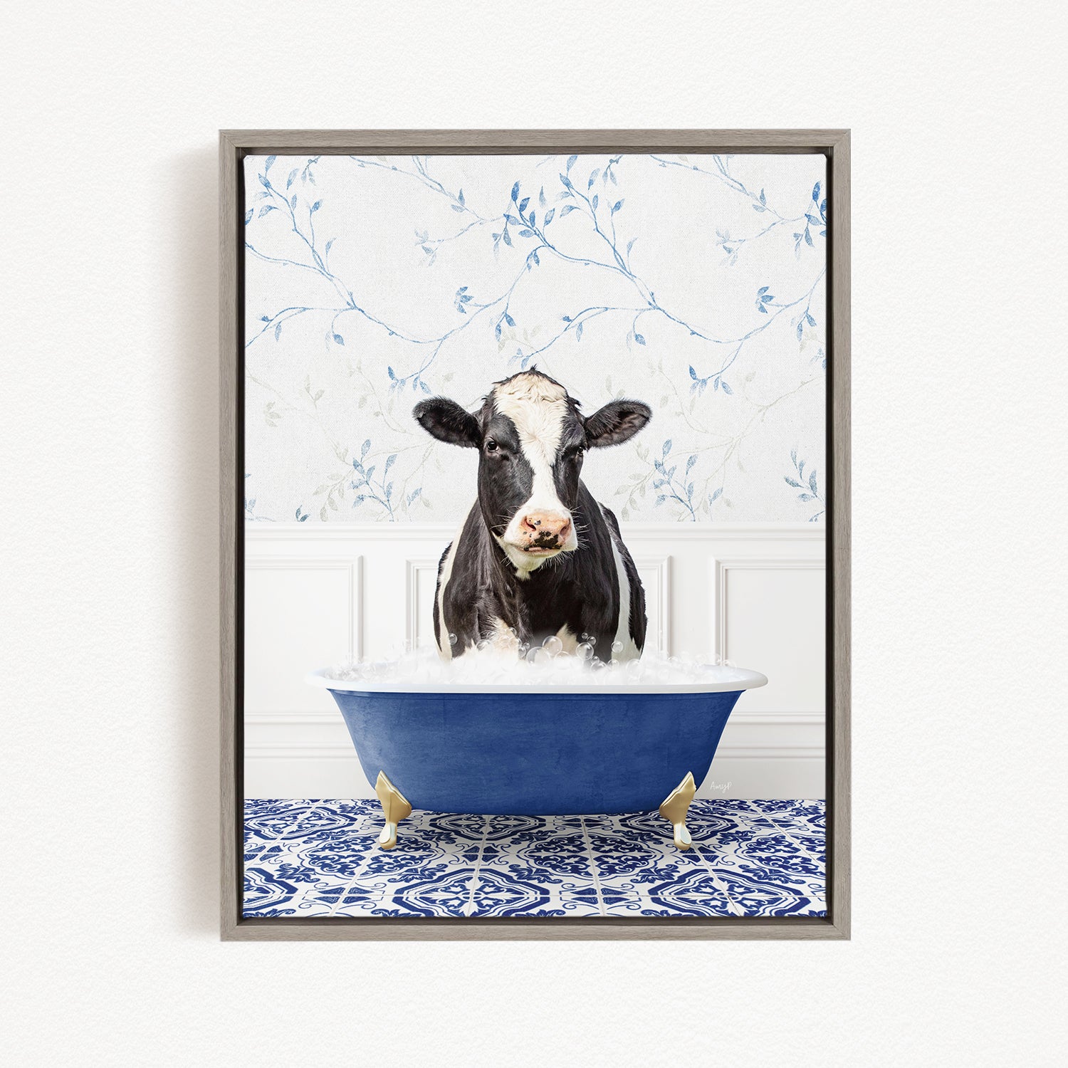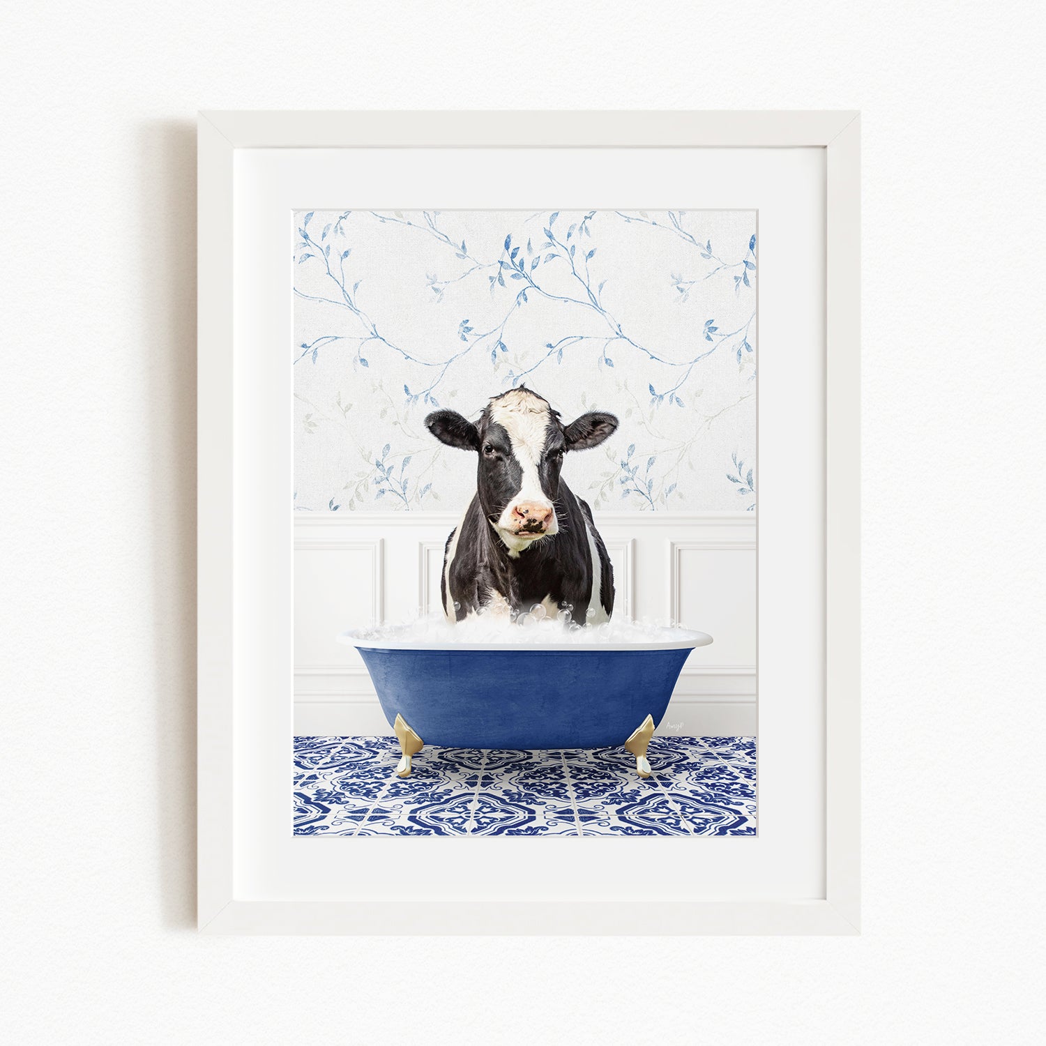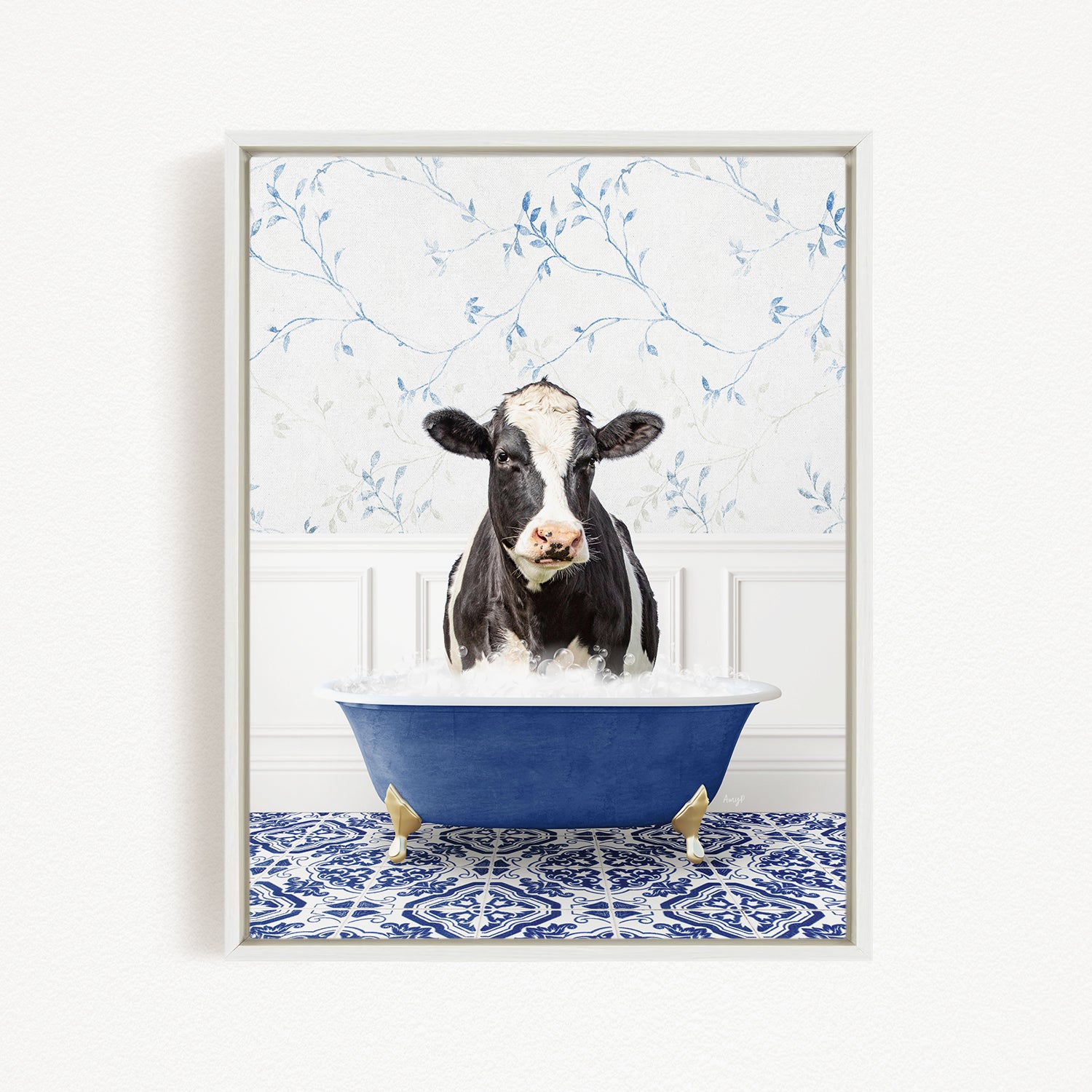 Black and White Cow in Eclectic Blue Bath