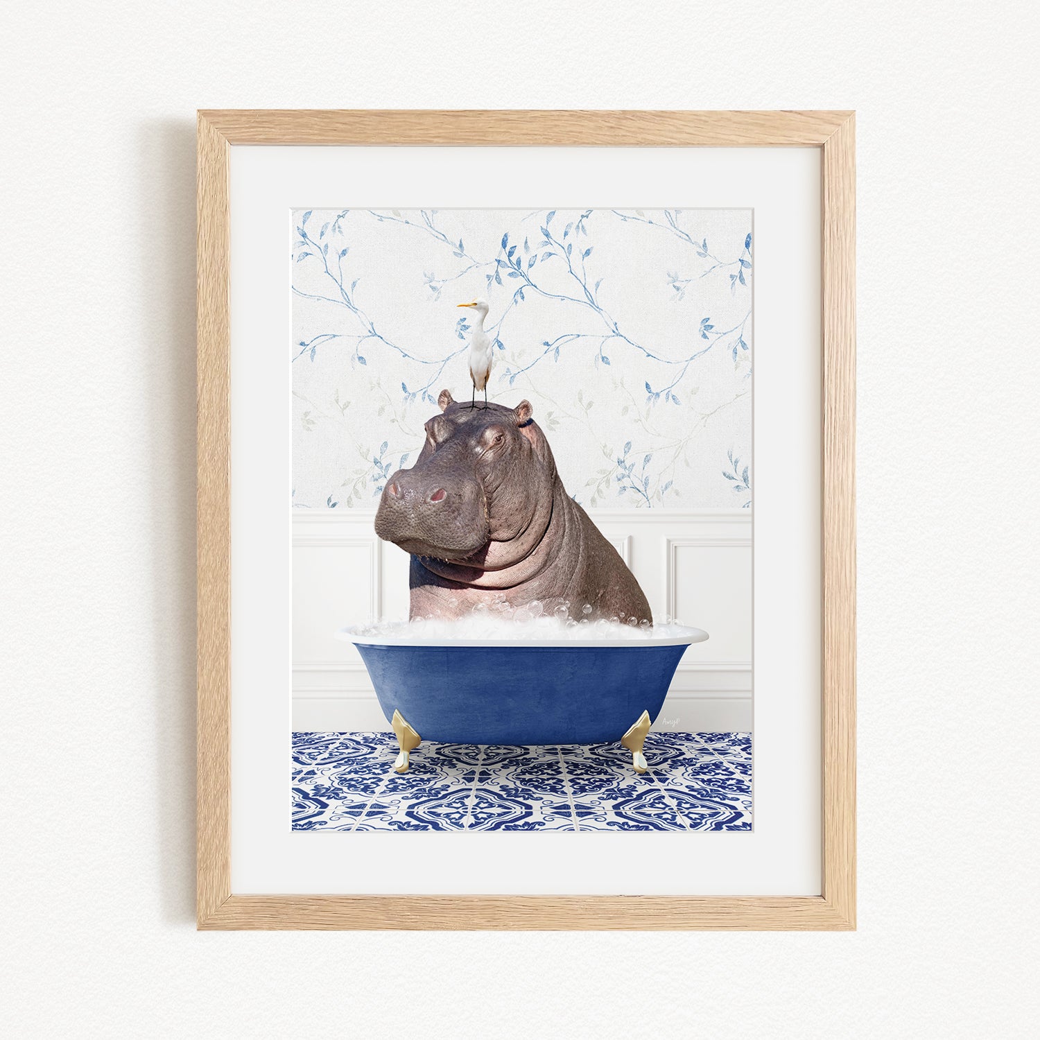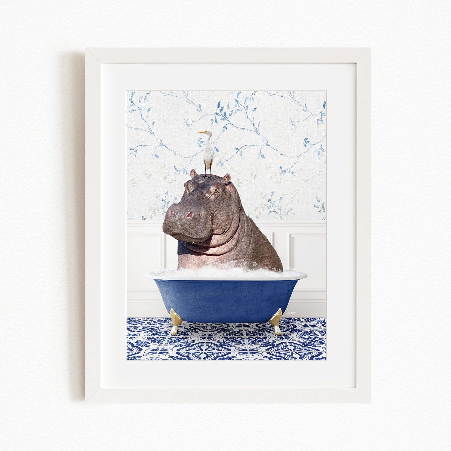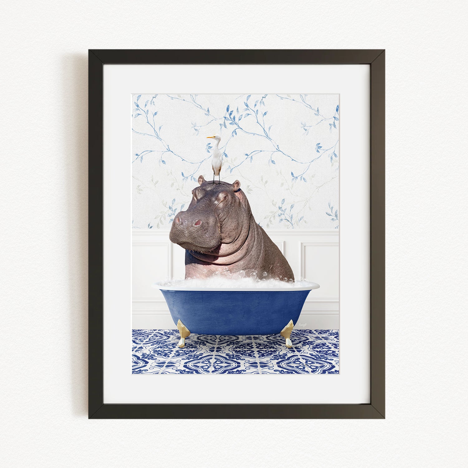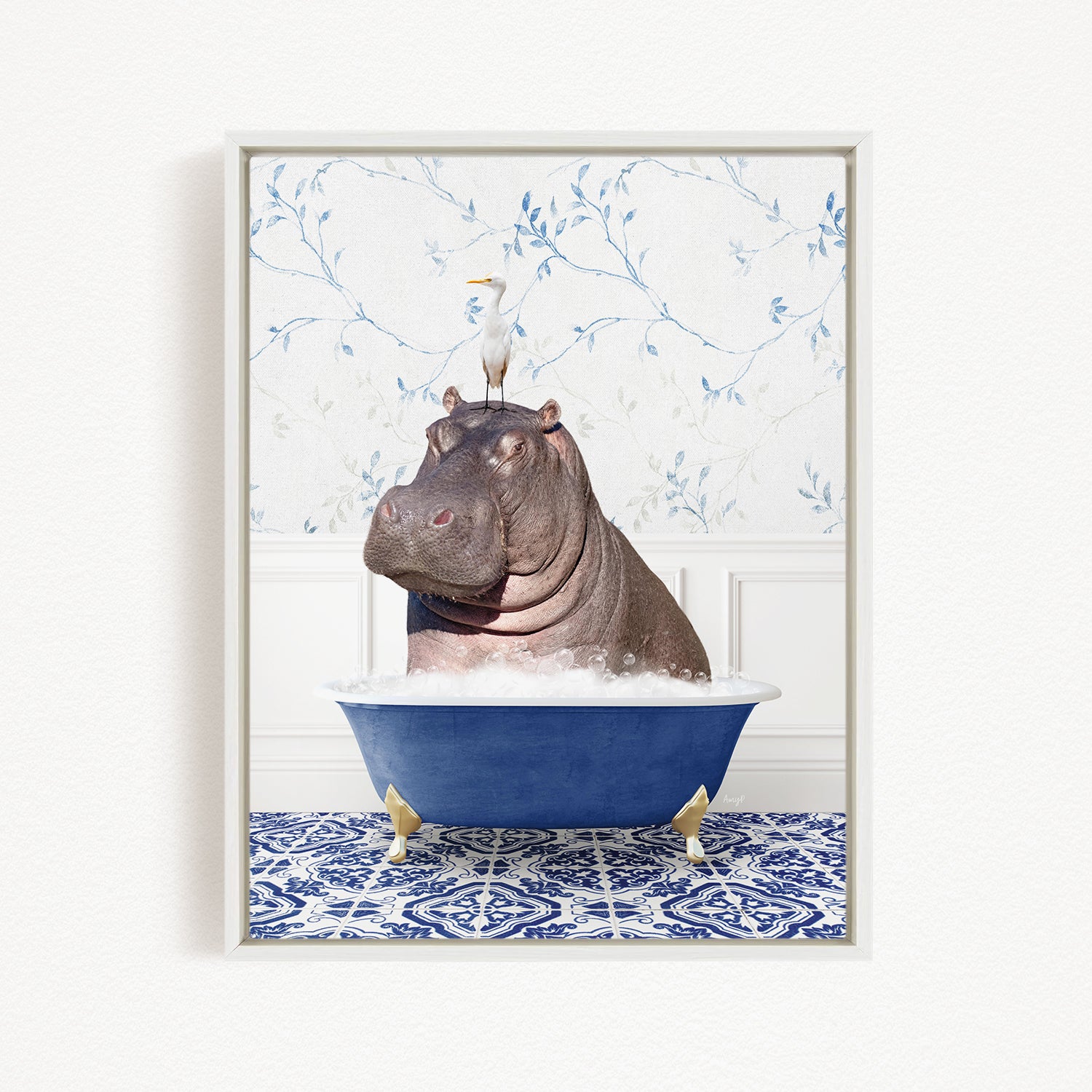 A framed image depicting a hippopotamus sitting in a blue bathtub, with a bird perched on its head.