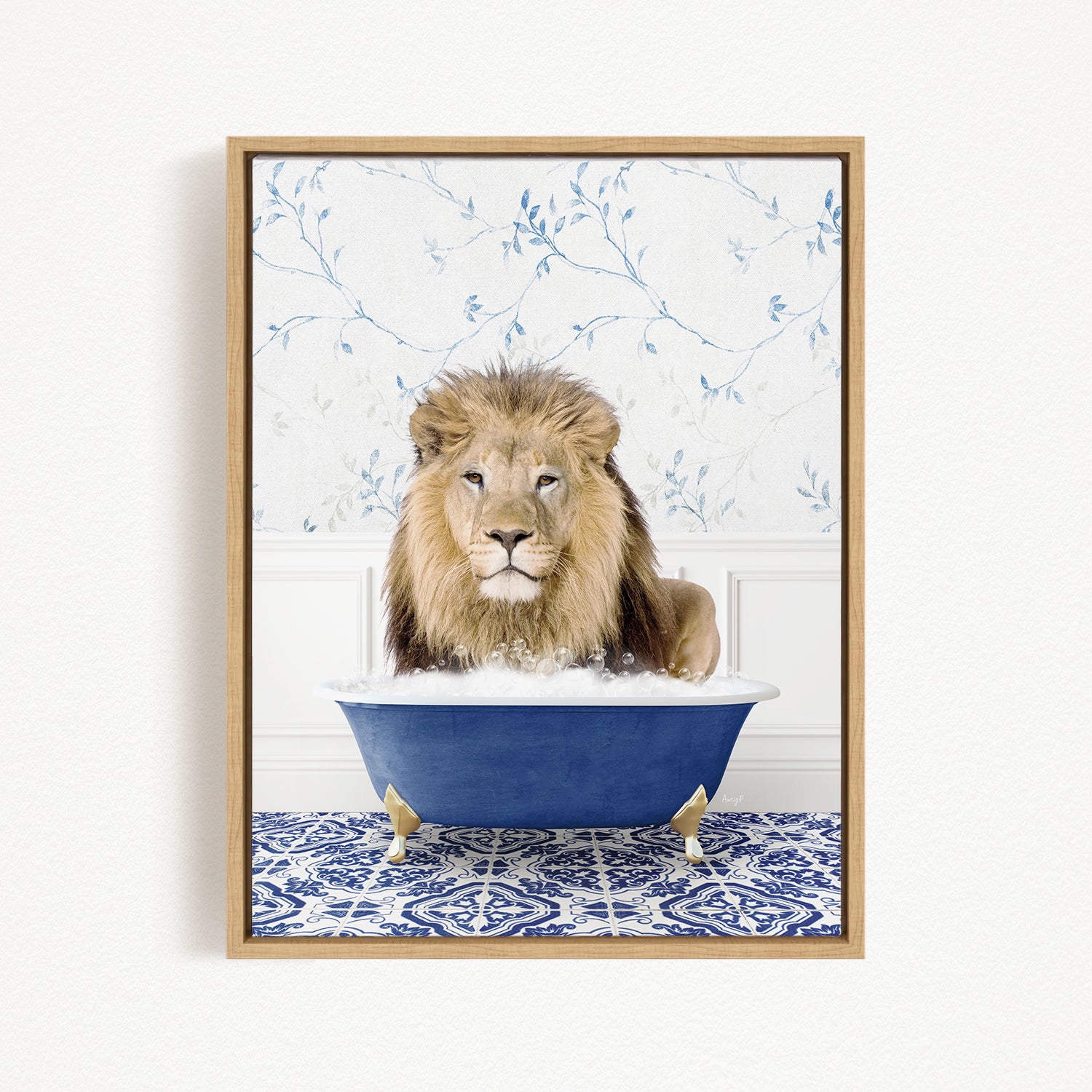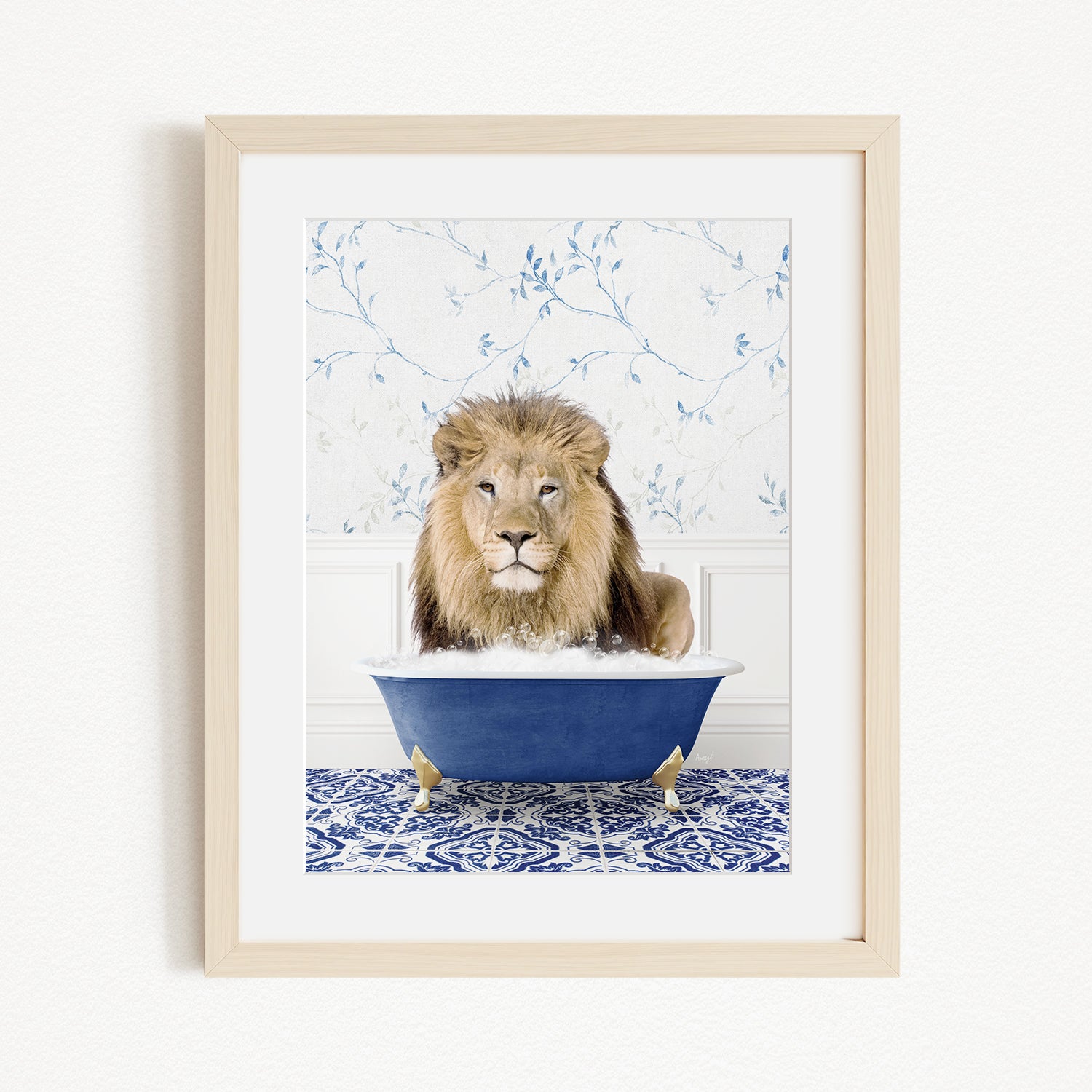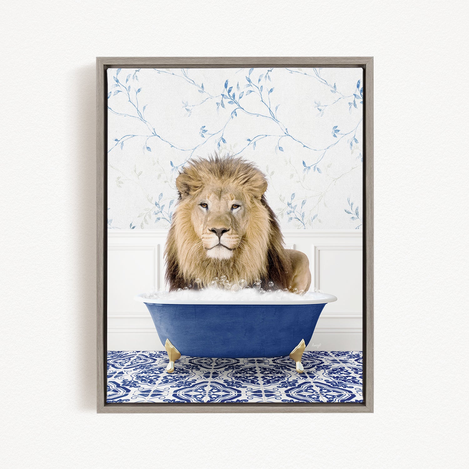 A lion sitting in a blue bathtub, surrounded by a blue and white floral patterned wall.
