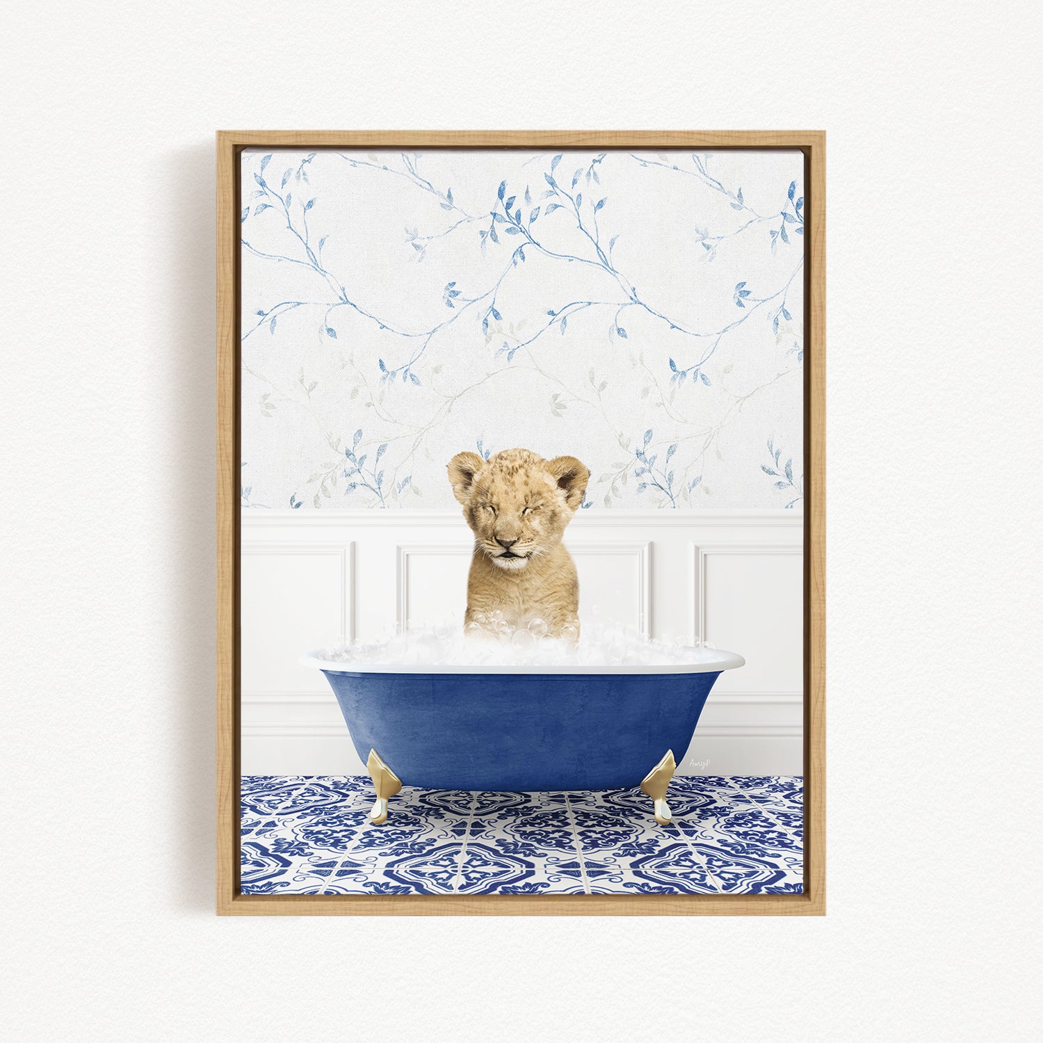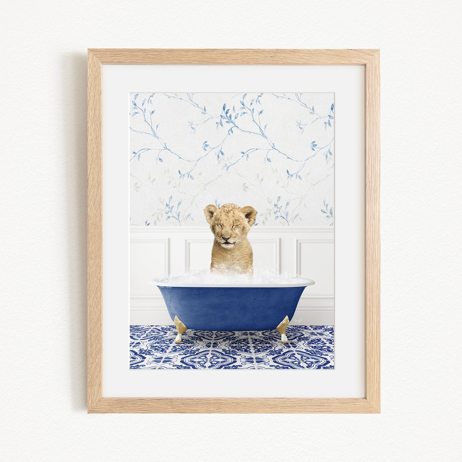 A young lion cub is sitting in a blue bathtub filled with water, surrounded by a blue and white patterned rug on the floor.