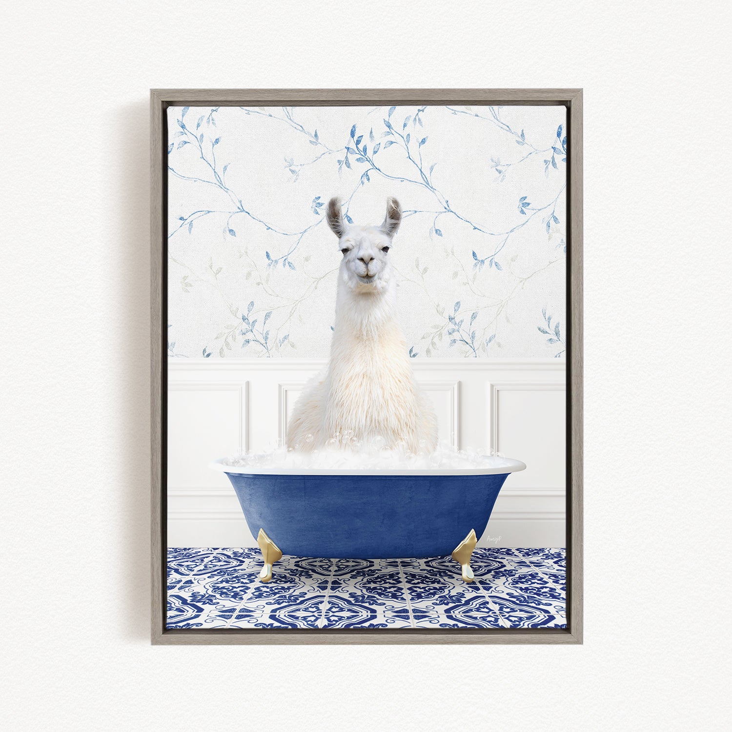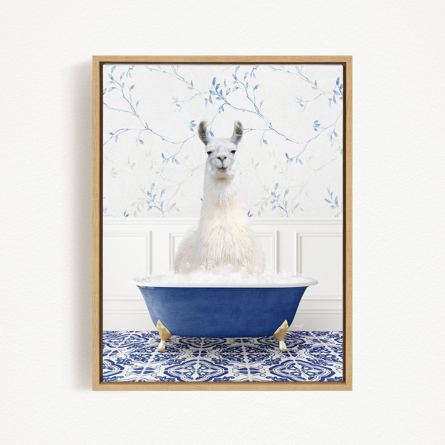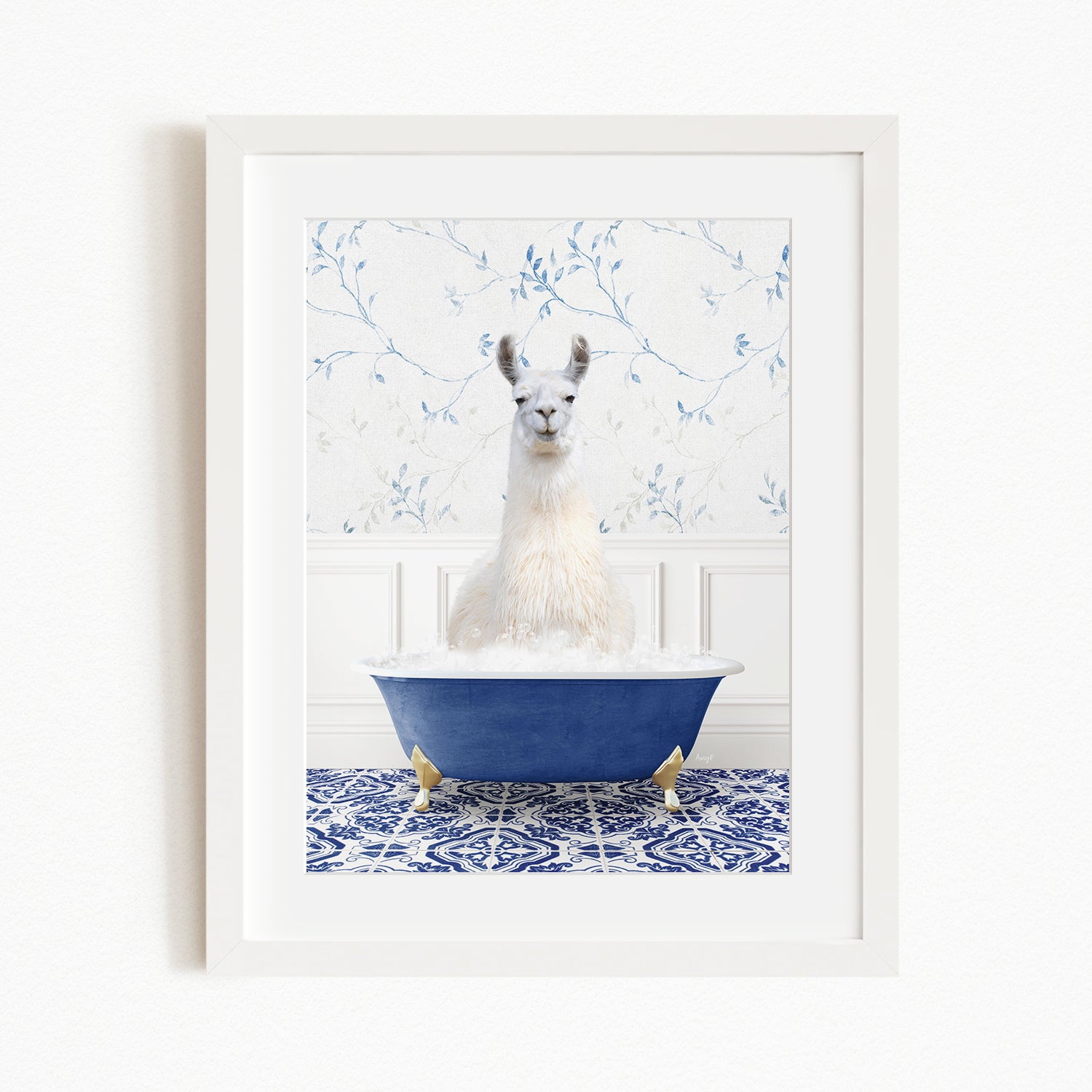 A white llama sitting in a blue bathtub filled with bubbles, with a blue and white floral patterned wall behind it.
