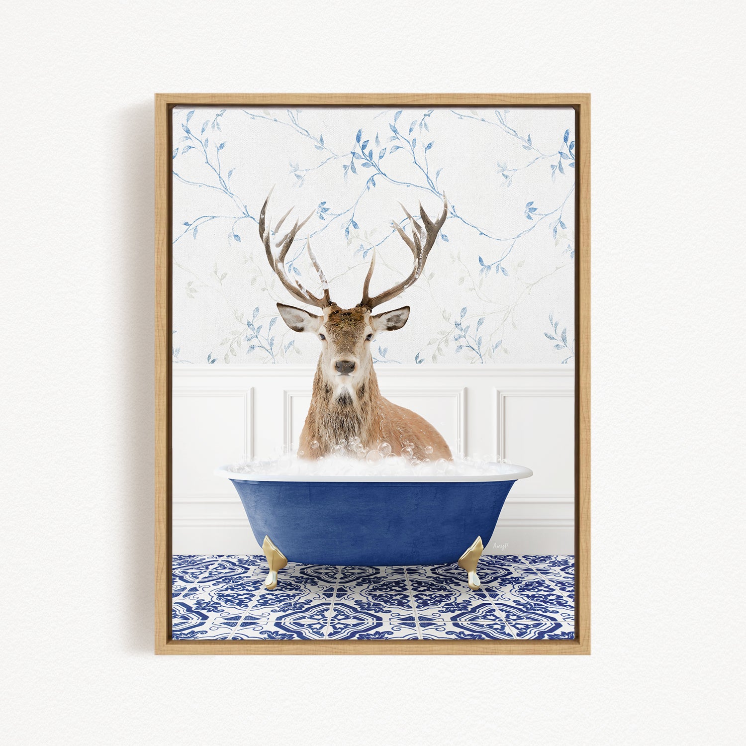 A deer with large antlers is sitting in a blue bathtub, surrounded by a patterned tile floor and a white wall with blue floral wallpaper.