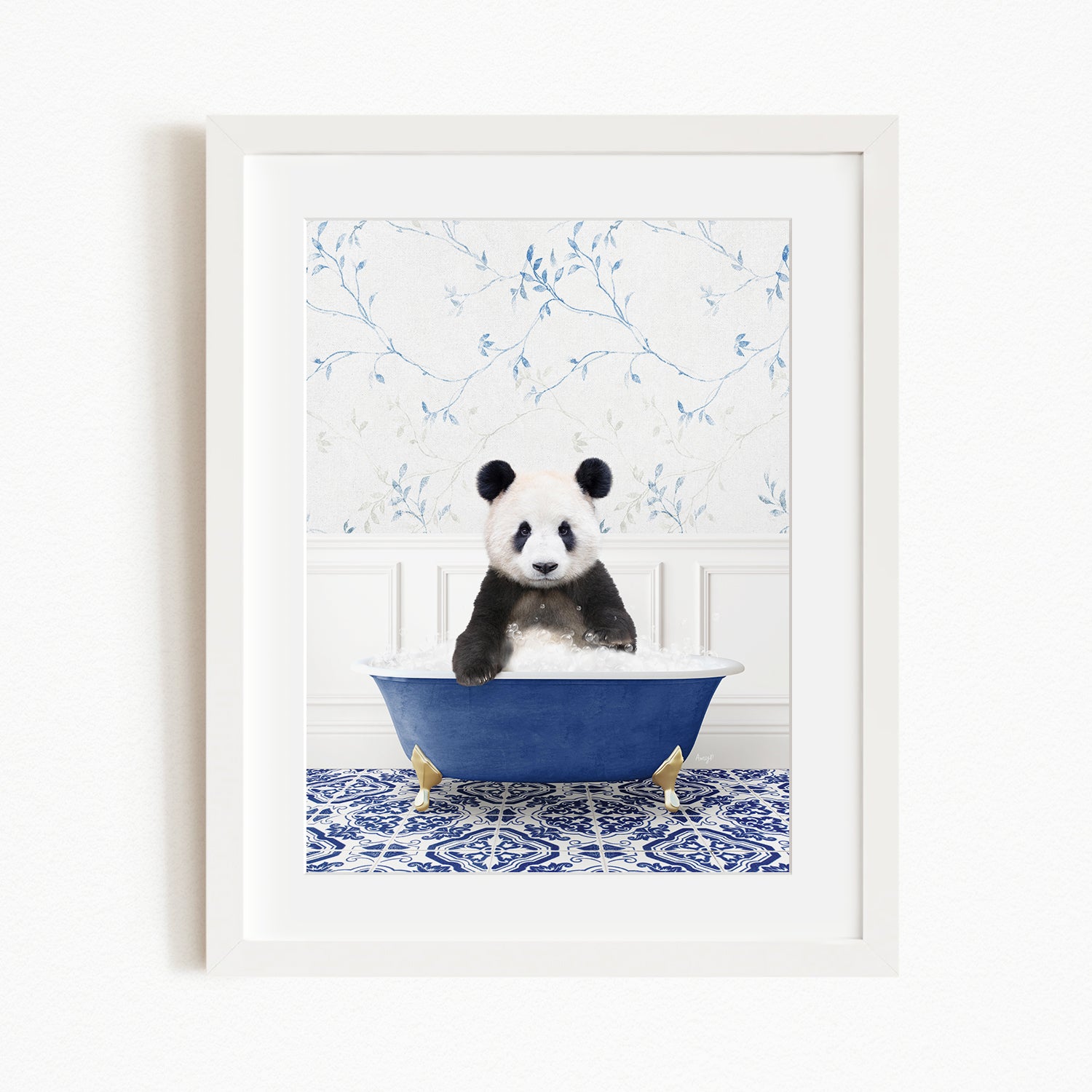 A panda bear sitting in a blue bathtub, surrounded by a blue and white floral patterned wall.