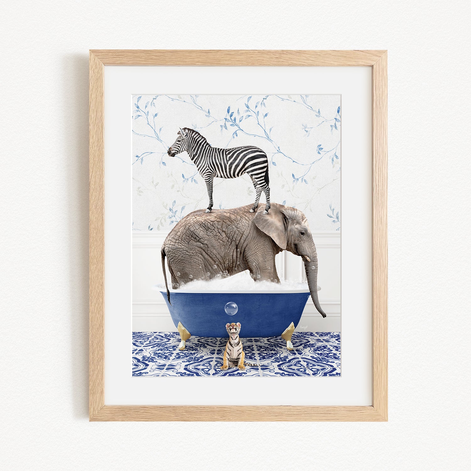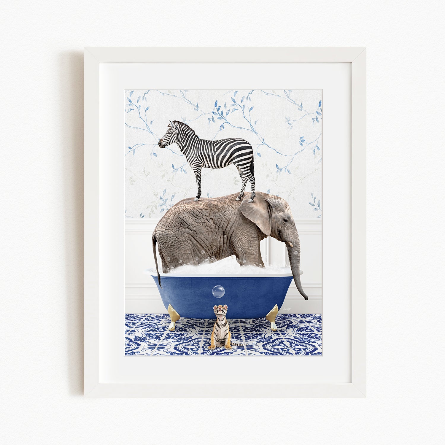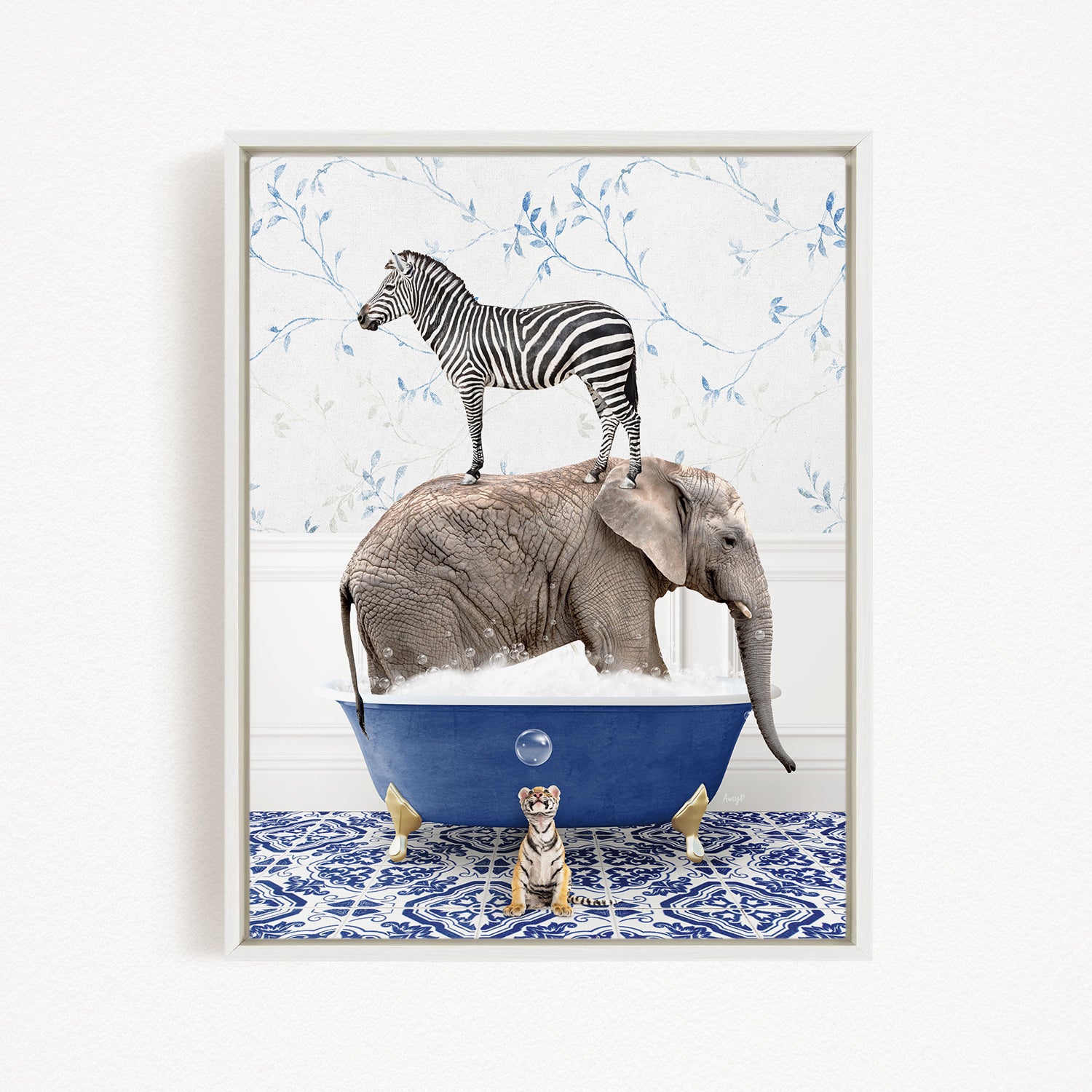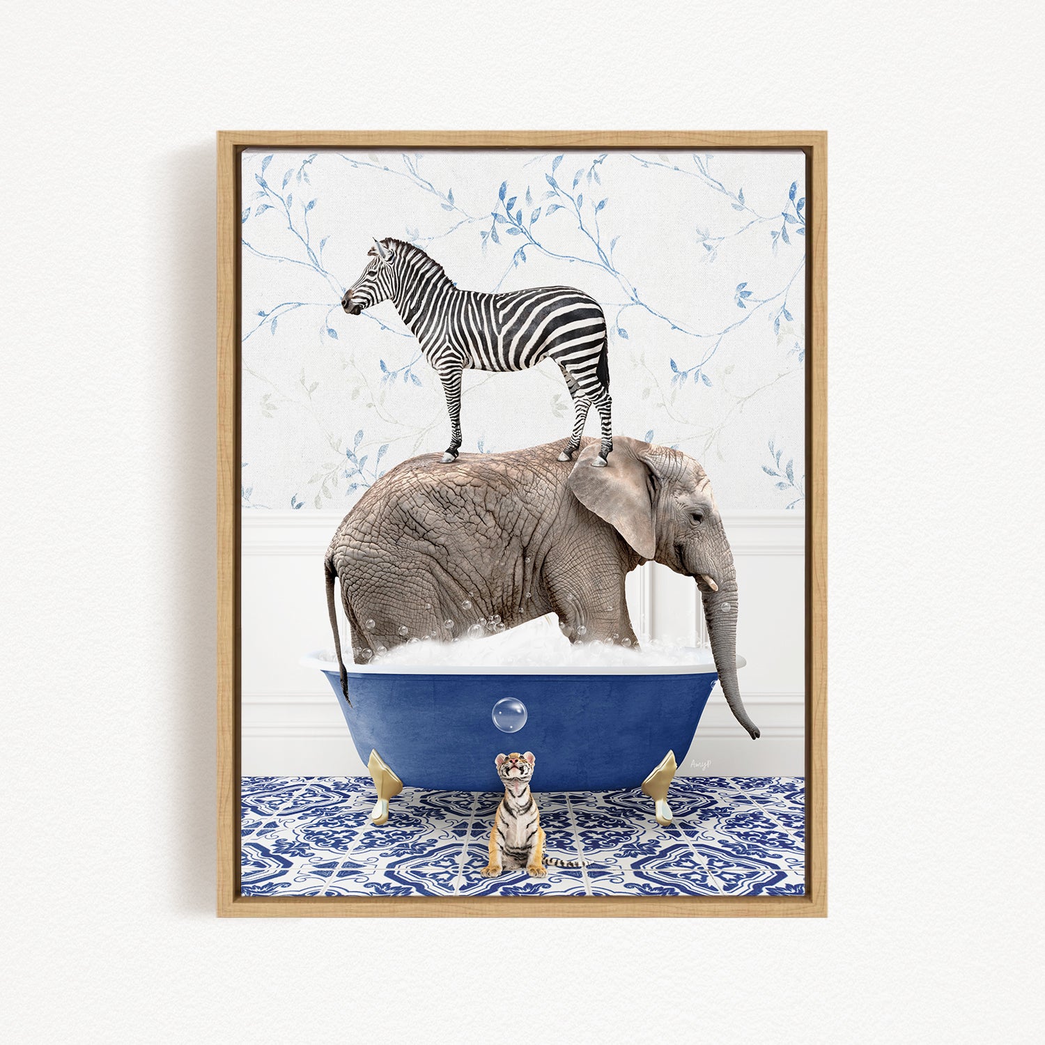 A framed image depicting a zebra standing on an elephant's back while the elephant is submerged in a blue bathtub, with a tiger sitting on the edge of the tub.
