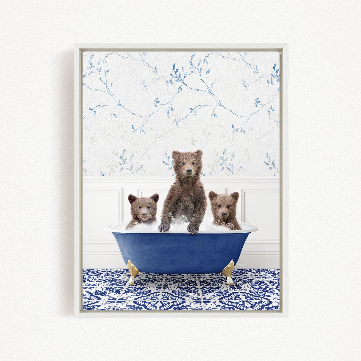 A framed image depicting three brown bears sitting in a blue bathtub, with a patterned tile floor and a floral wallpaper in the background.