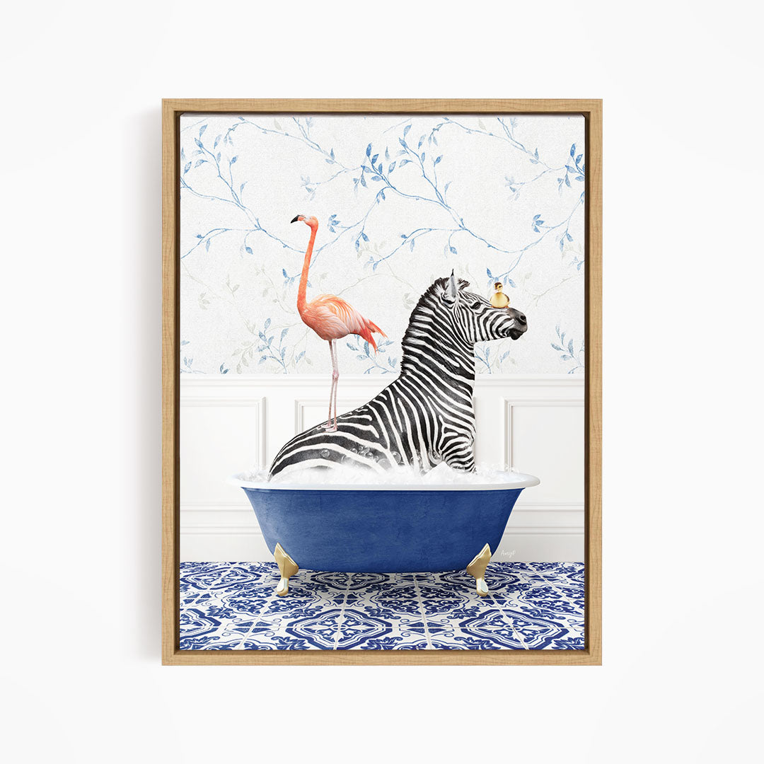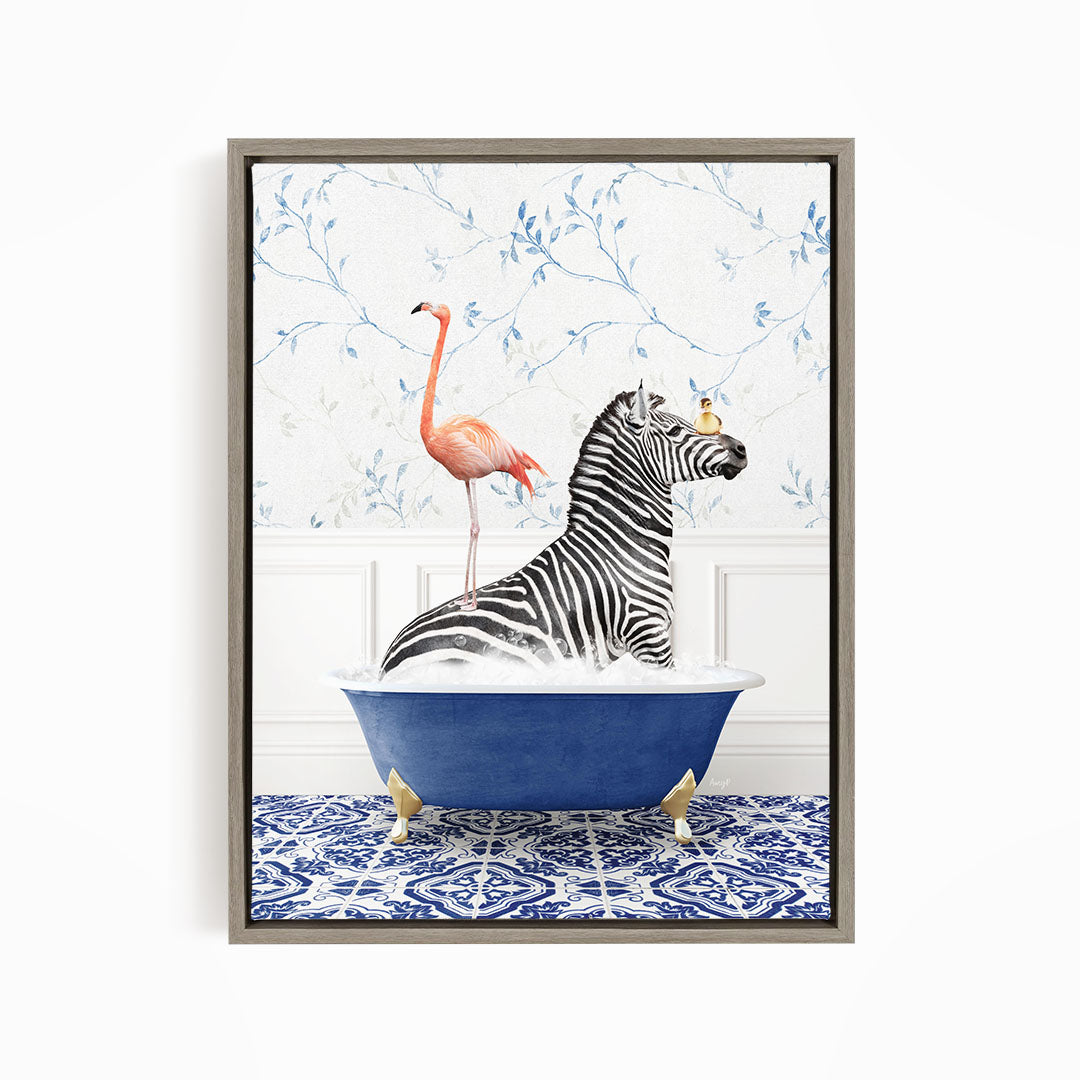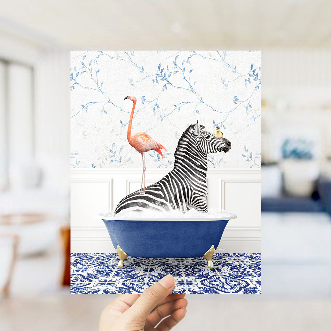 Zebra and Flamingo in Eclectic Blue Bath