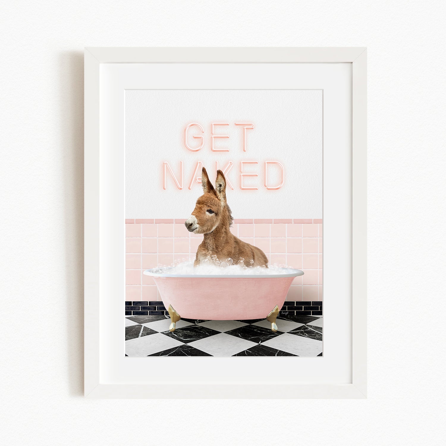 A donkey is sitting in a pink bathtub filled with bubbles, with the text "GET NAKED" displayed above it.