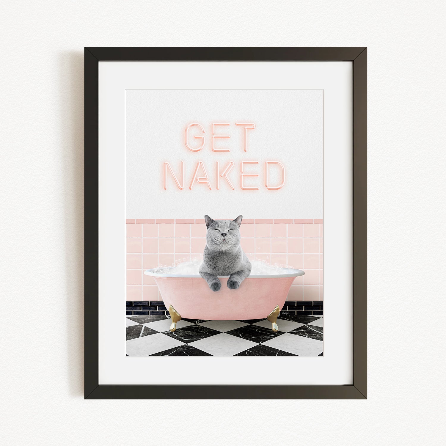 A framed image depicting a gray cat sitting in a pink bathtub, with the text "GET NAKED" displayed above it.