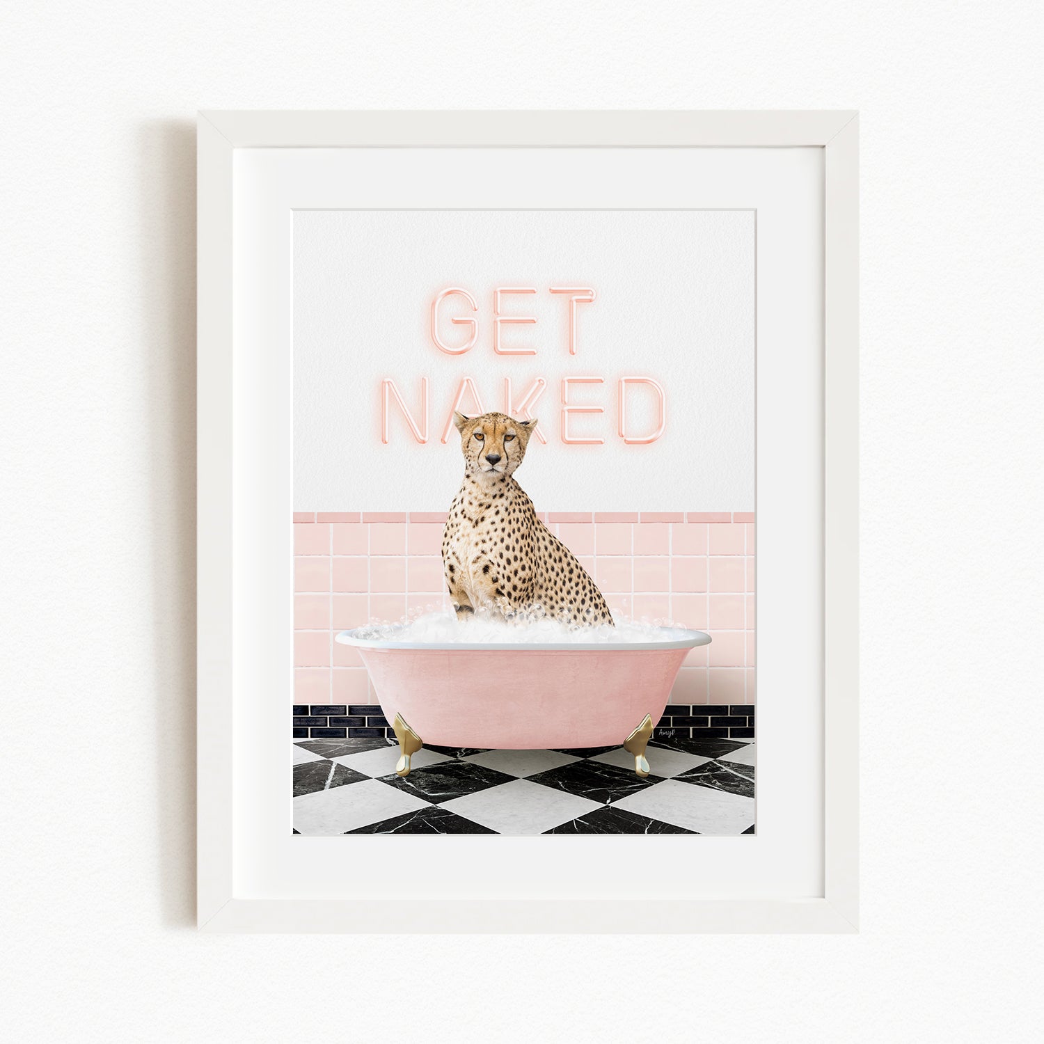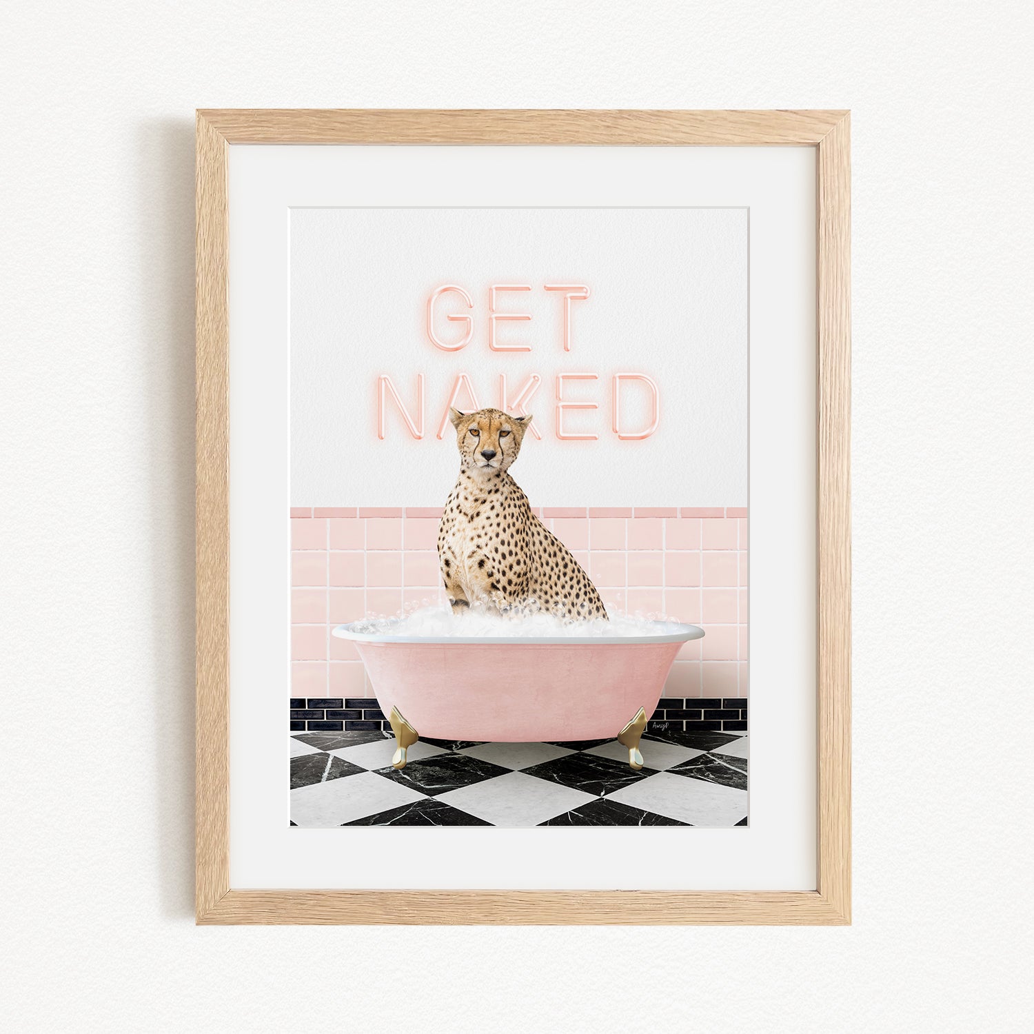 A cheetah sitting in a pink bathtub with the text "GET NAKED" displayed above it.