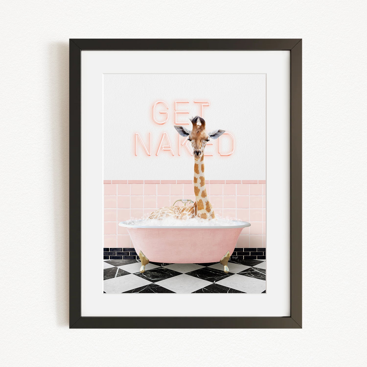 A giraffe sitting in a pink bathtub with the words "GET NAKED" written on the wall behind it.