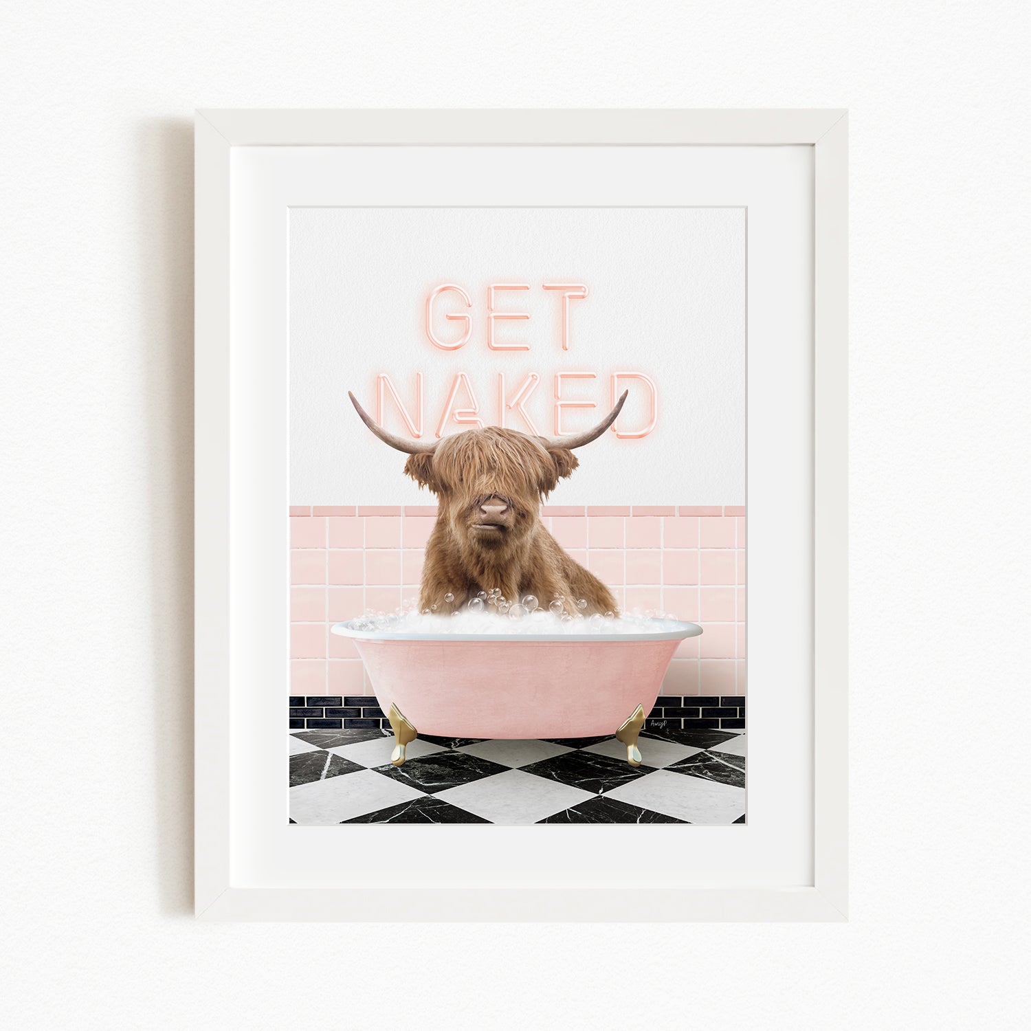 A framed image depicting a Highland cow sitting in a pink bathtub with the text "GET NAKED" written above it.
