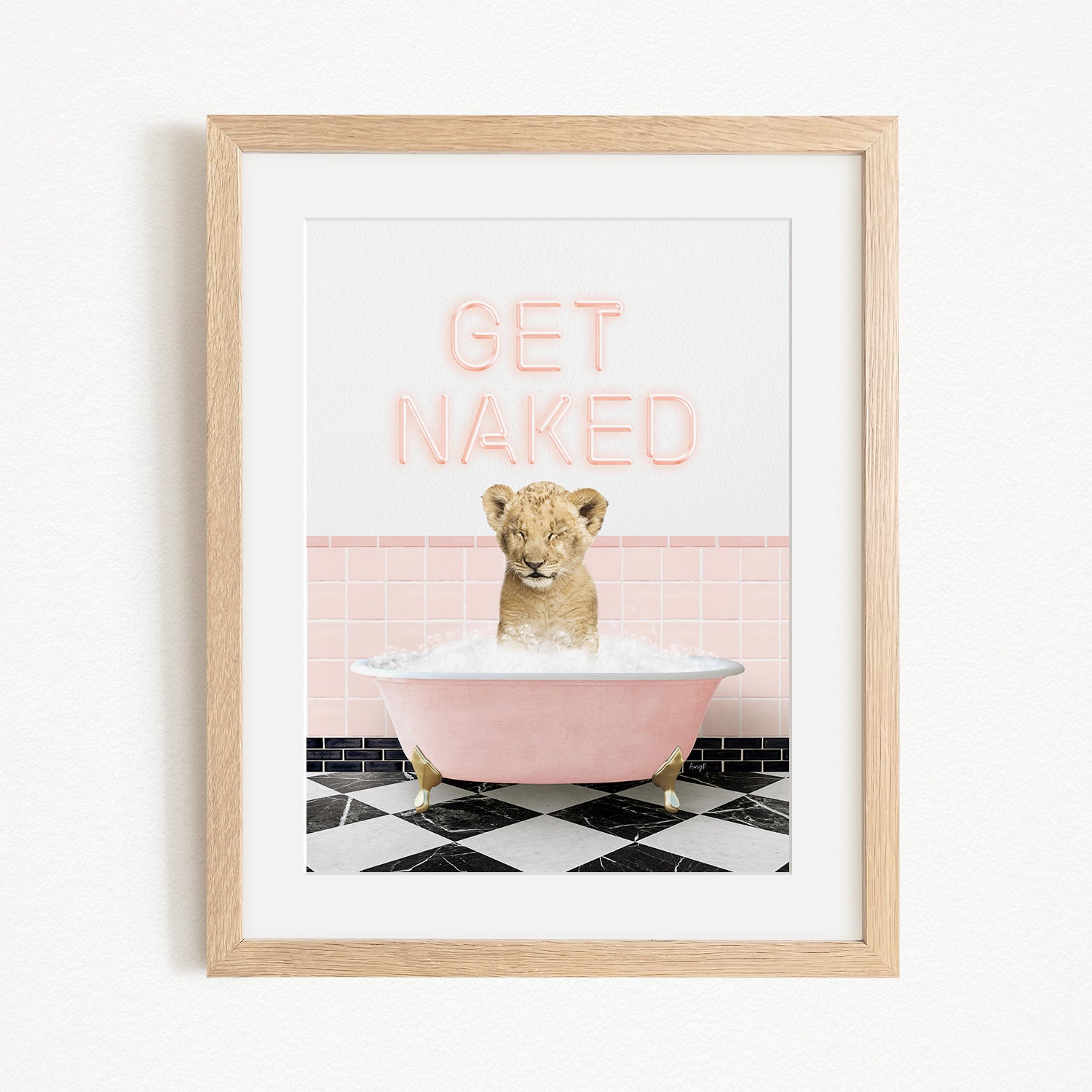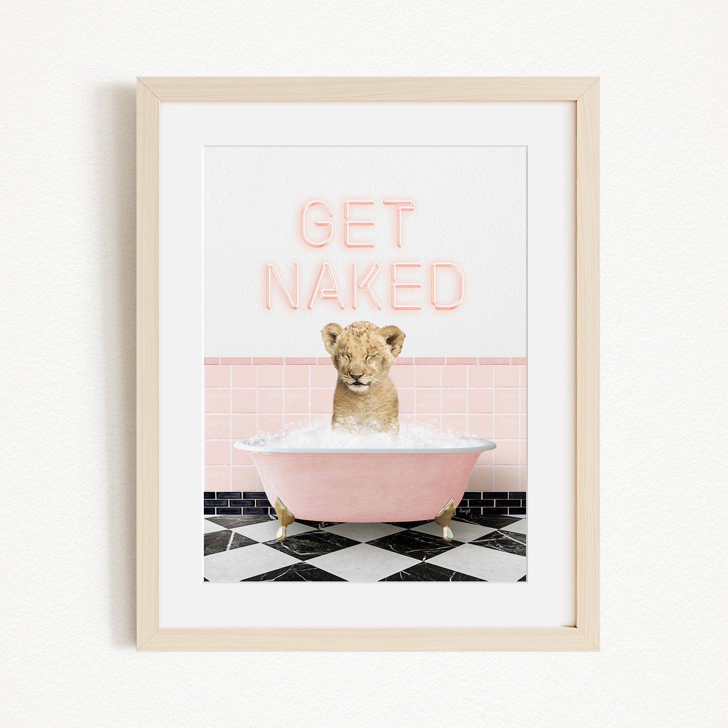 A framed image depicting a young lion cub sitting in a pink bathtub filled with bubbles, with the text "GET NAKED" displayed above it.