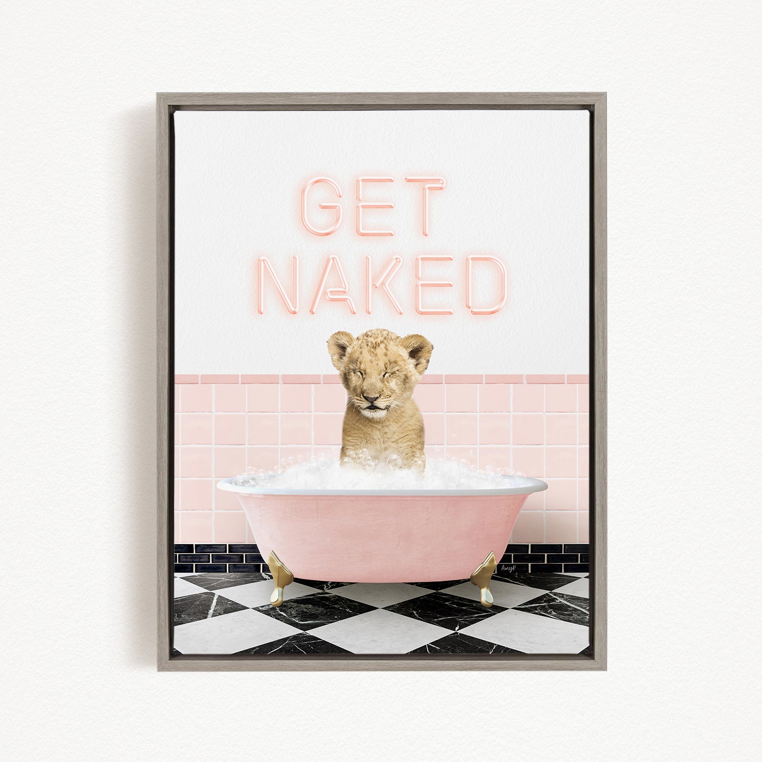 A framed image depicting a young lion cub sitting in a pink bathtub filled with water, with the text "GET NAKED" displayed above it.