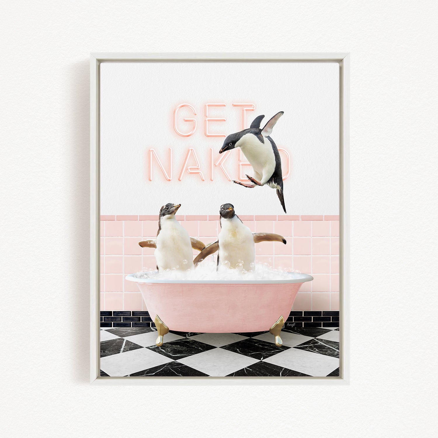 A framed image depicting two penguins sitting in a pink bathtub, with one penguin jumping out of the tub and the other penguin sitting in the tub. The background features a pink wall with a neon sign that says "GET NAKED".