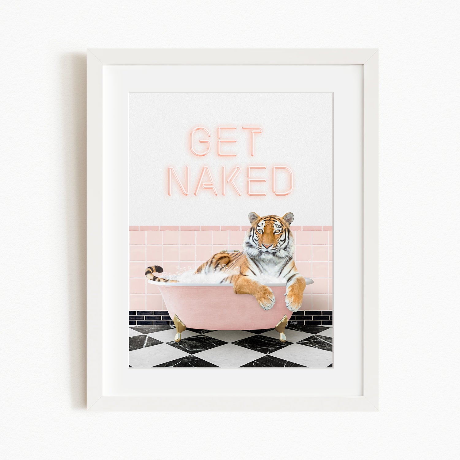 A framed print featuring a tiger sitting in a pink bathtub with the text "GET NAKED" displayed above it.