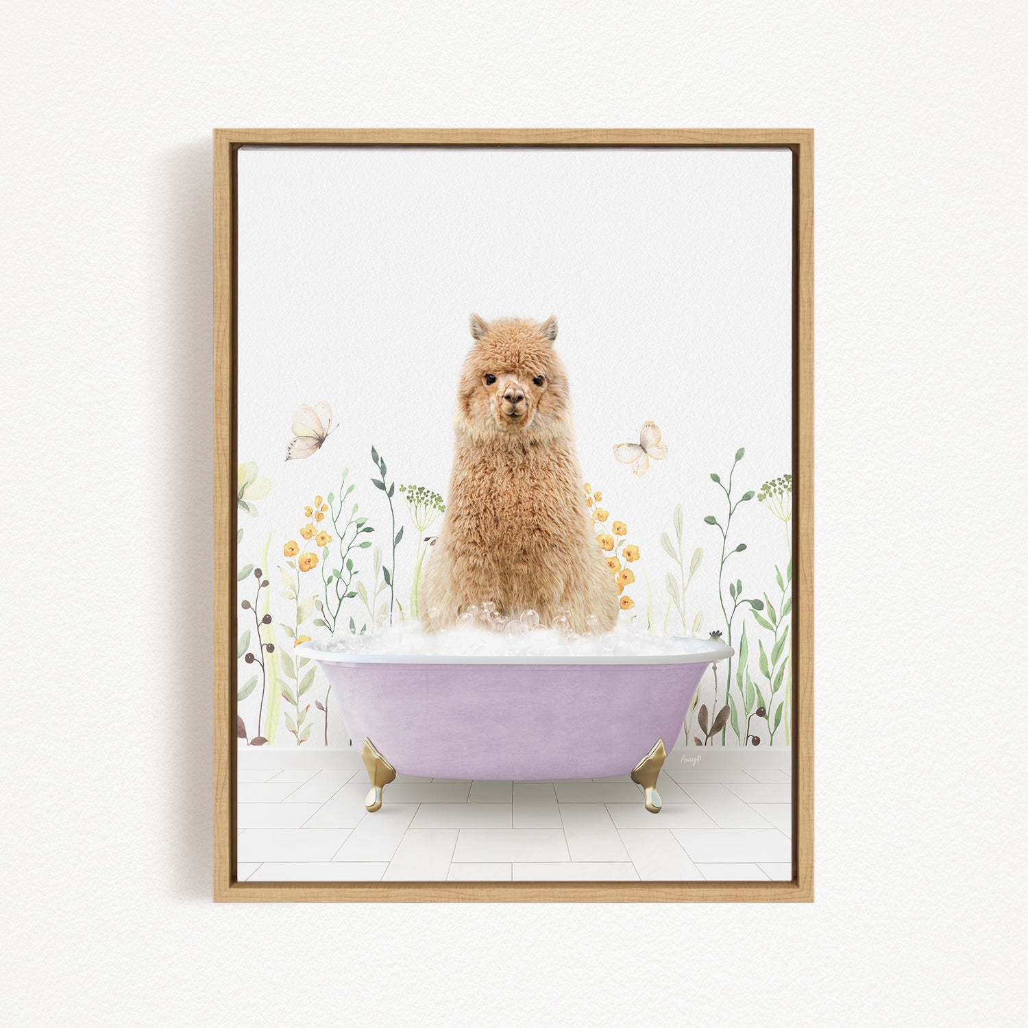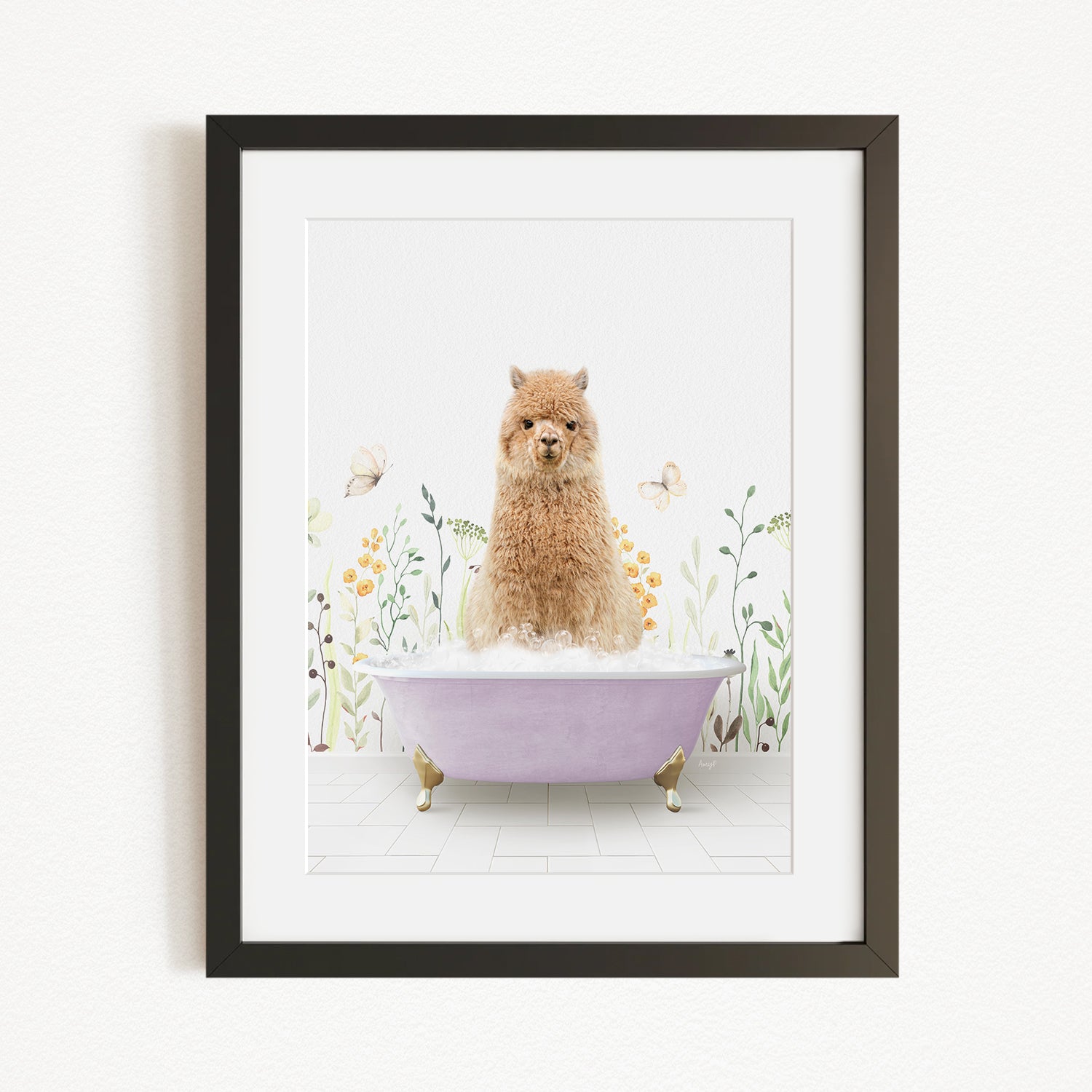 A fluffy brown dog sitting in a purple bathtub filled with bubbles, surrounded by flowers and butterflies.