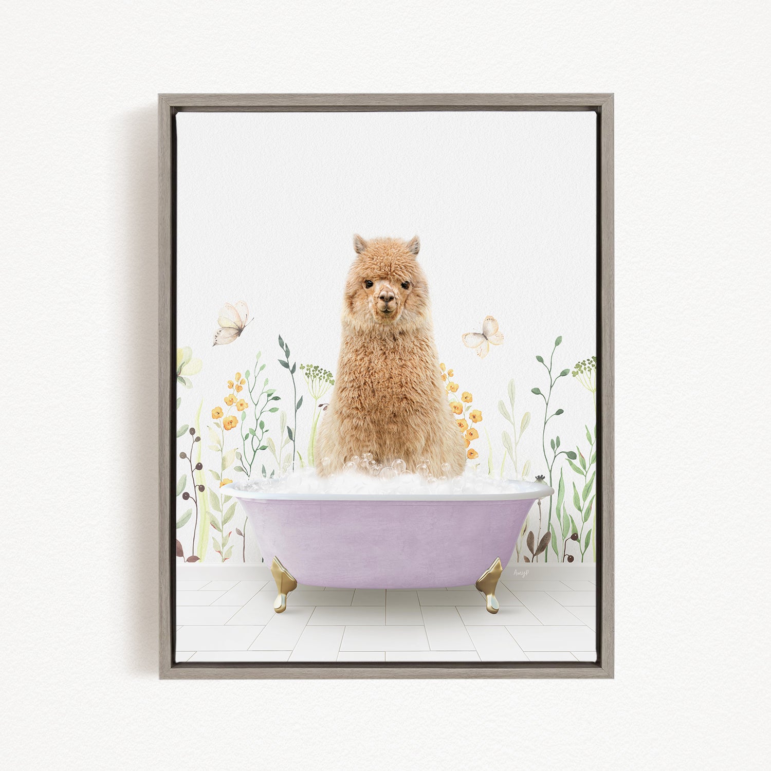 A fluffy brown dog sitting in a purple bathtub filled with bubbles, surrounded by a floral background.