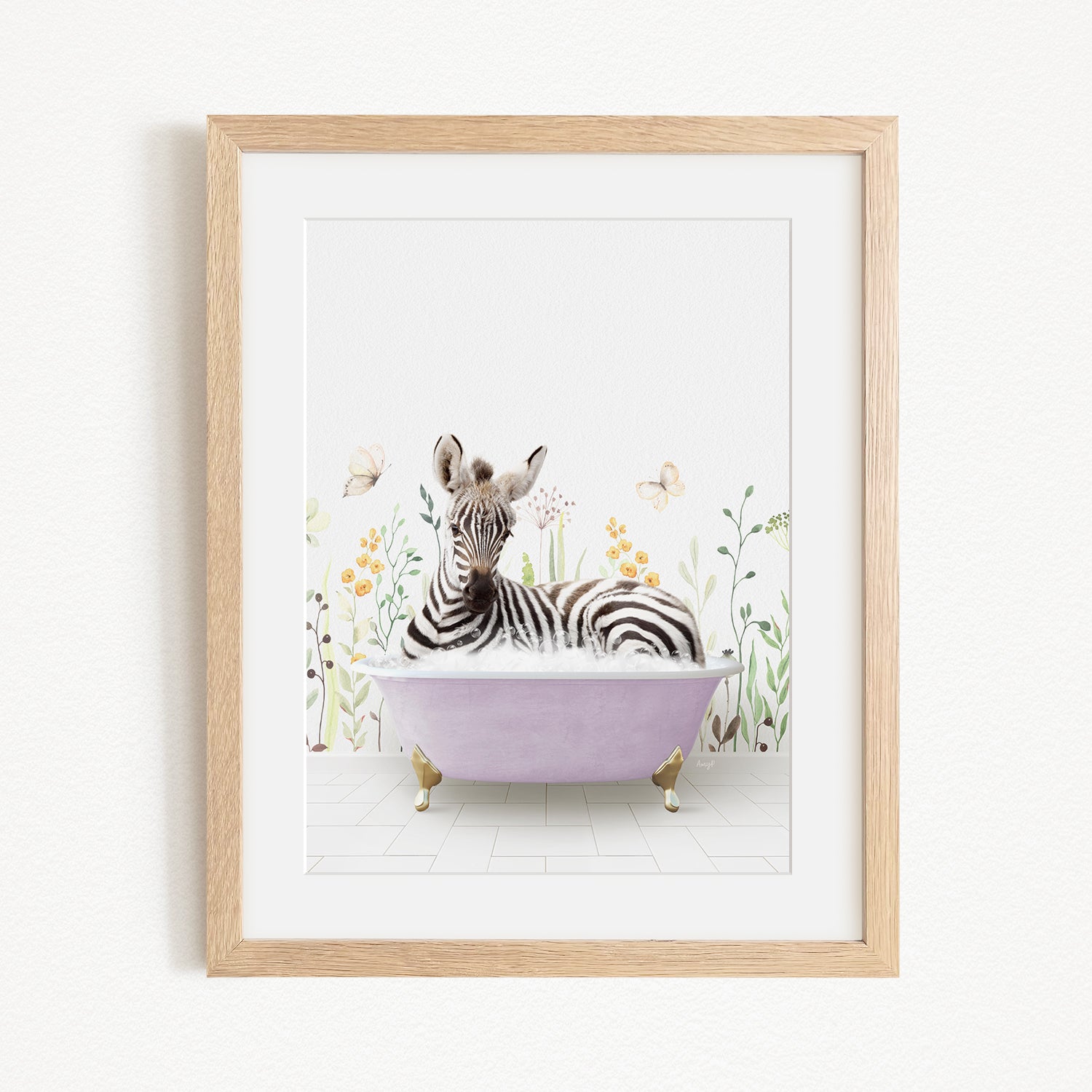 A zebra is sitting in a purple bathtub, surrounded by flowers and butterflies, in a framed artwork.