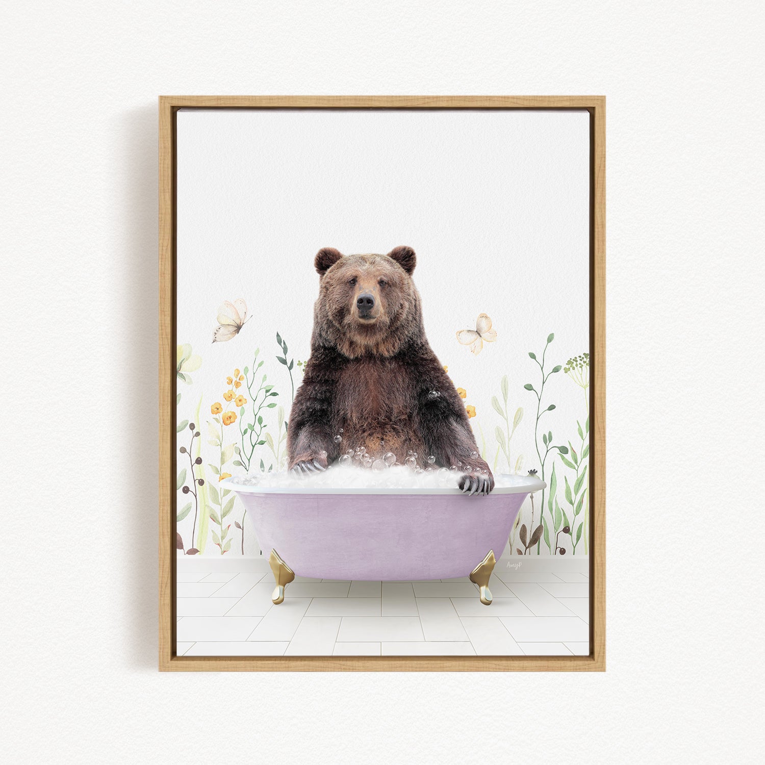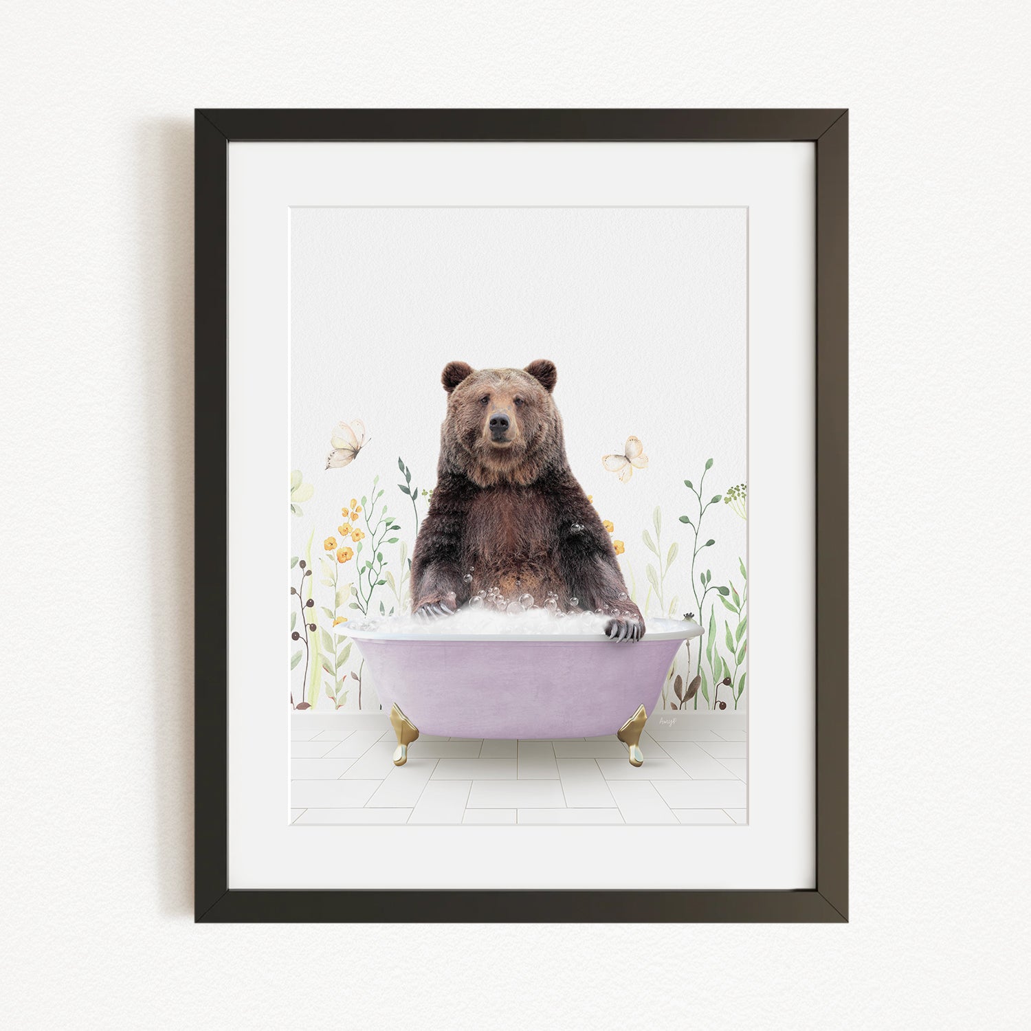 A brown bear sitting in a purple bathtub, surrounded by flowers and butterflies.