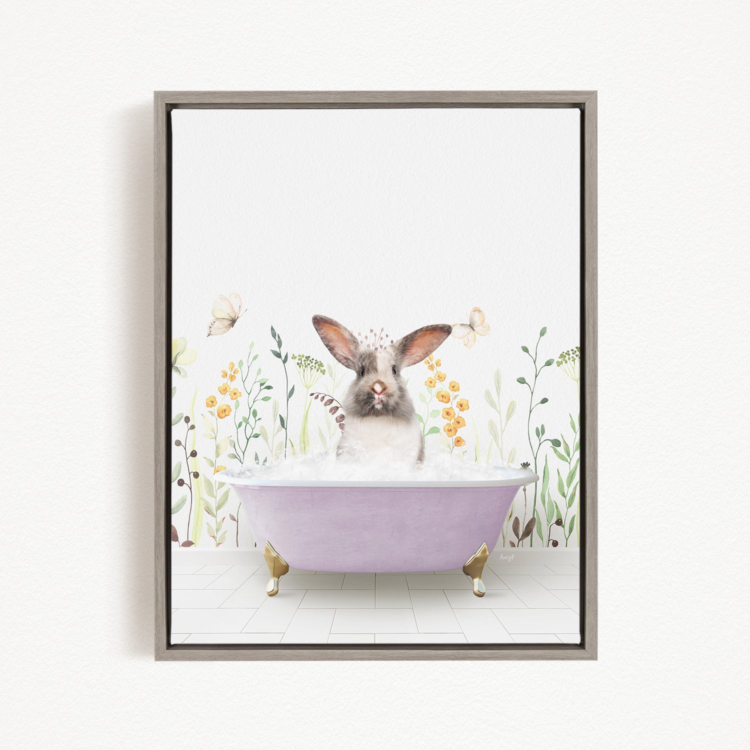 A framed print depicting a rabbit sitting in a purple bathtub filled with bubbles, surrounded by flowers and butterflies.