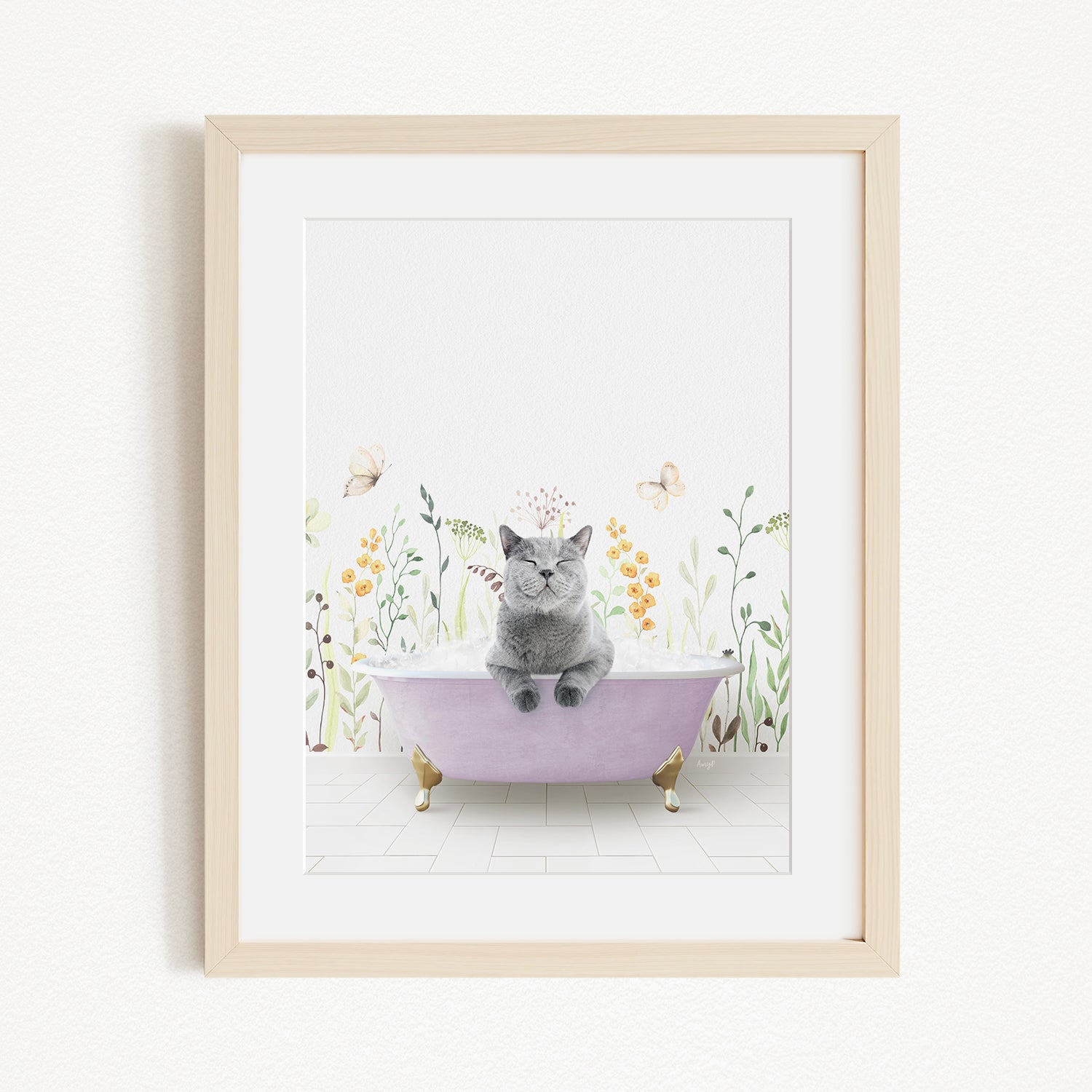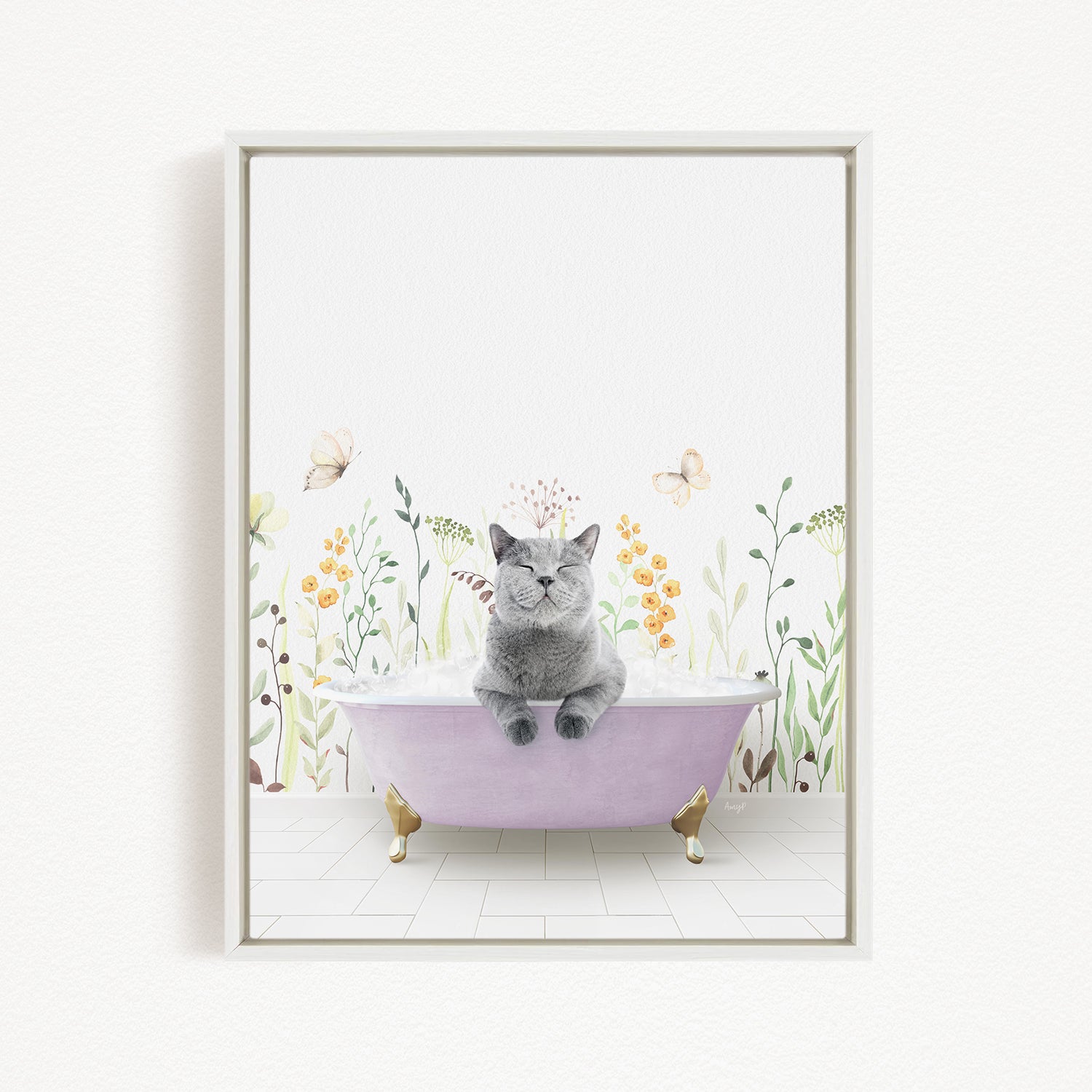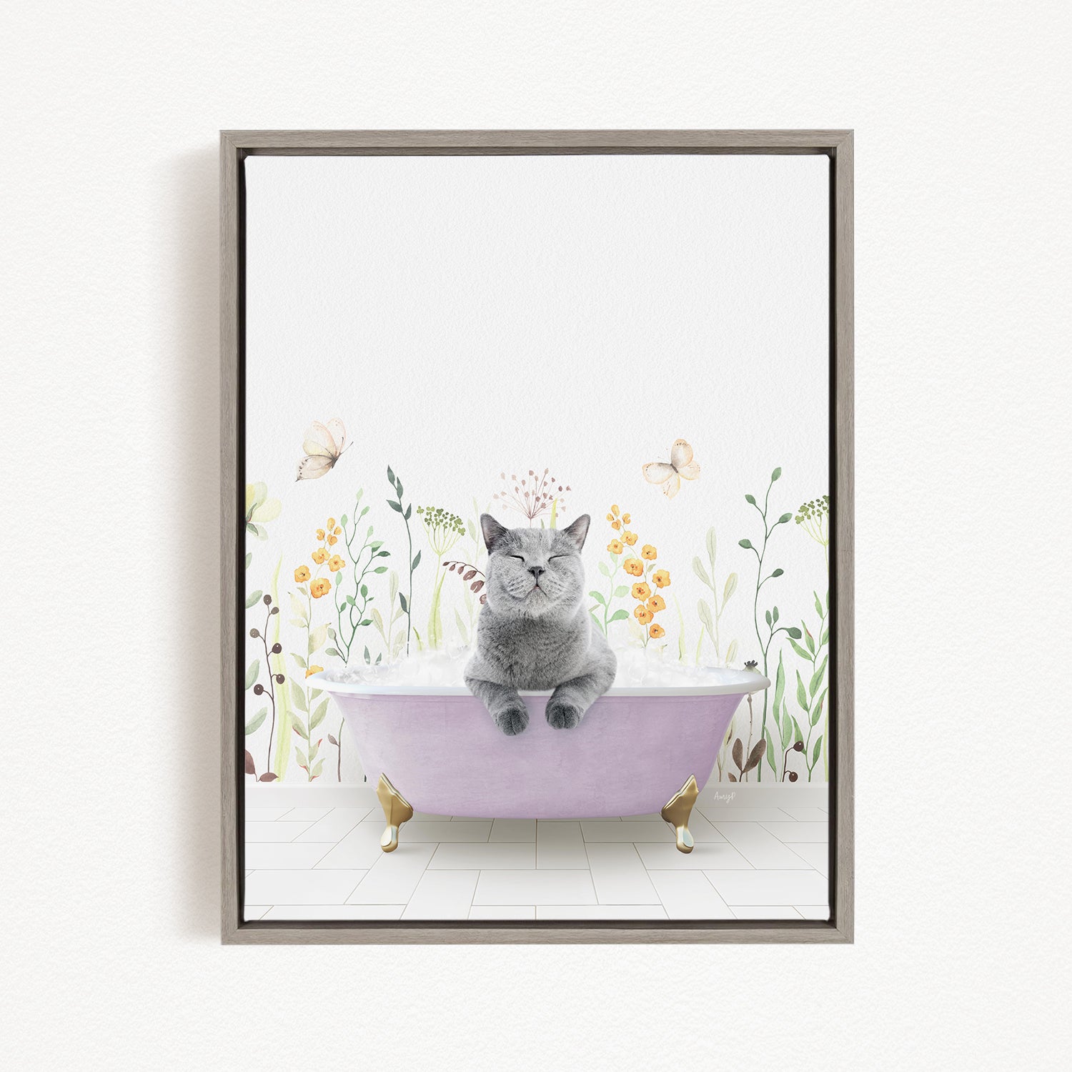 A gray cat sitting in a purple bathtub, surrounded by flowers and butterflies, in a framed artwork.