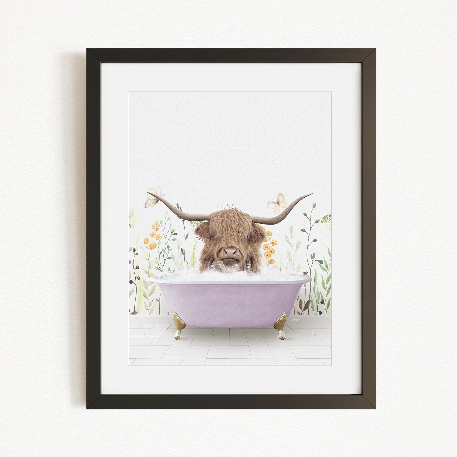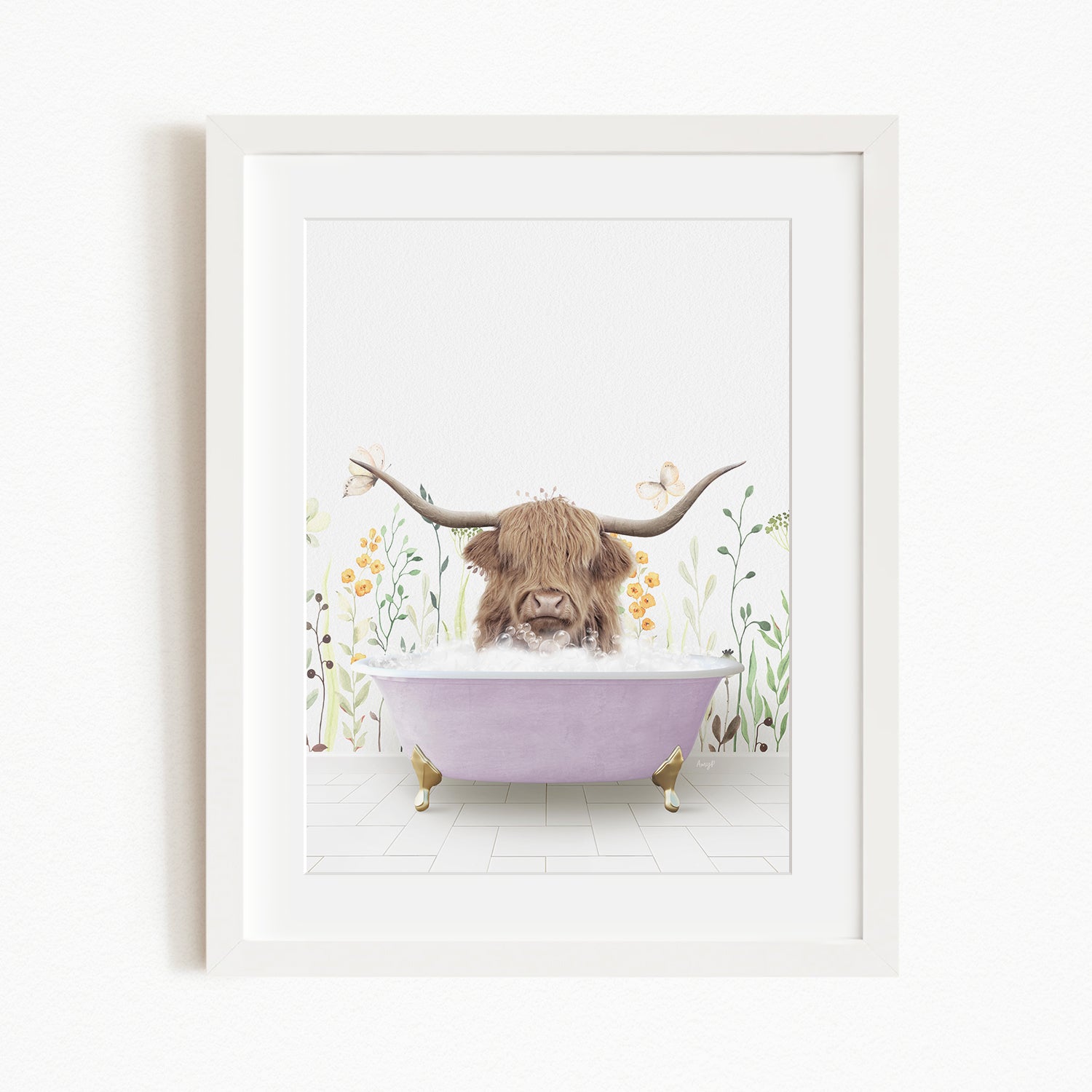 A framed illustration depicting a Highland cow with large curved horns sitting in a pink bathtub, surrounded by flowers and butterflies.