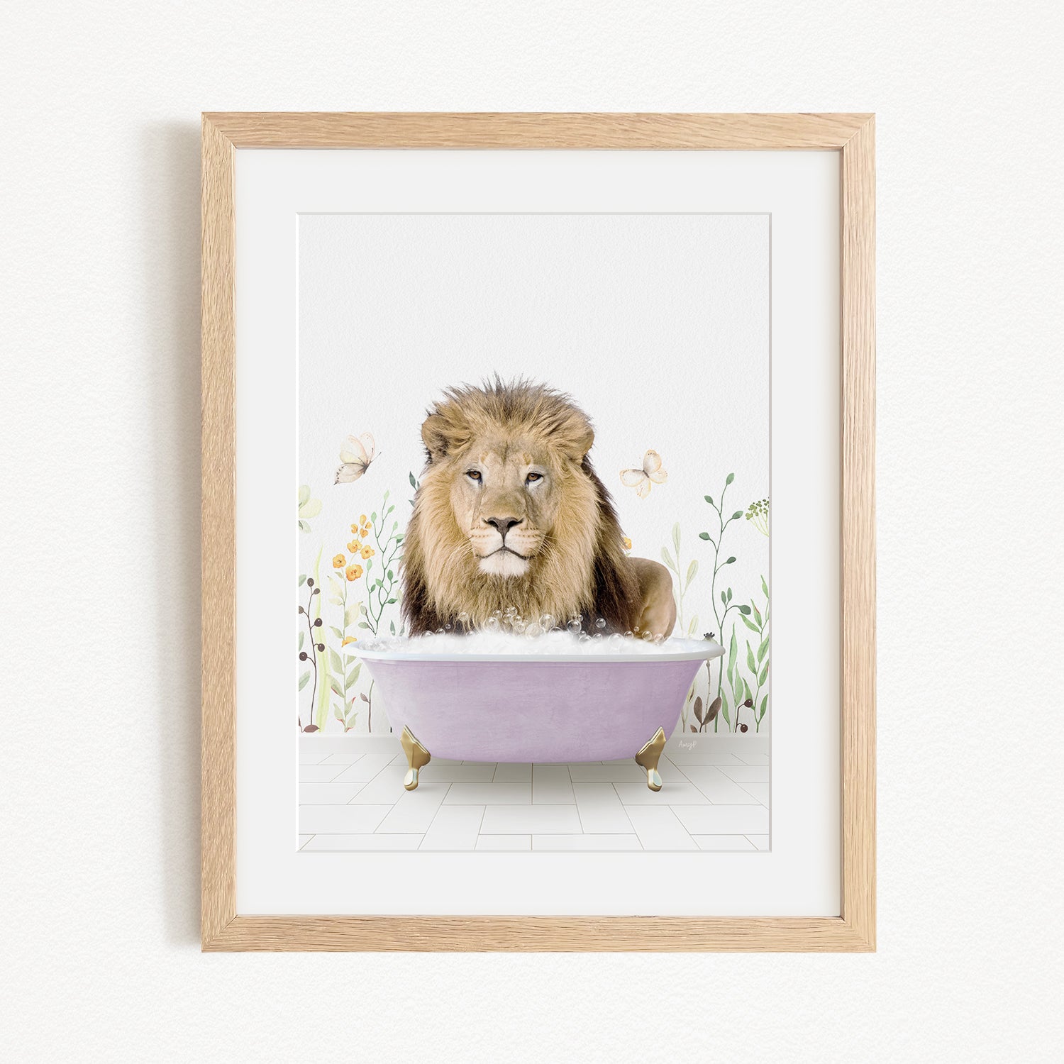 A lion is sitting in a bathtub filled with bubbles, surrounded by flowers and butterflies.