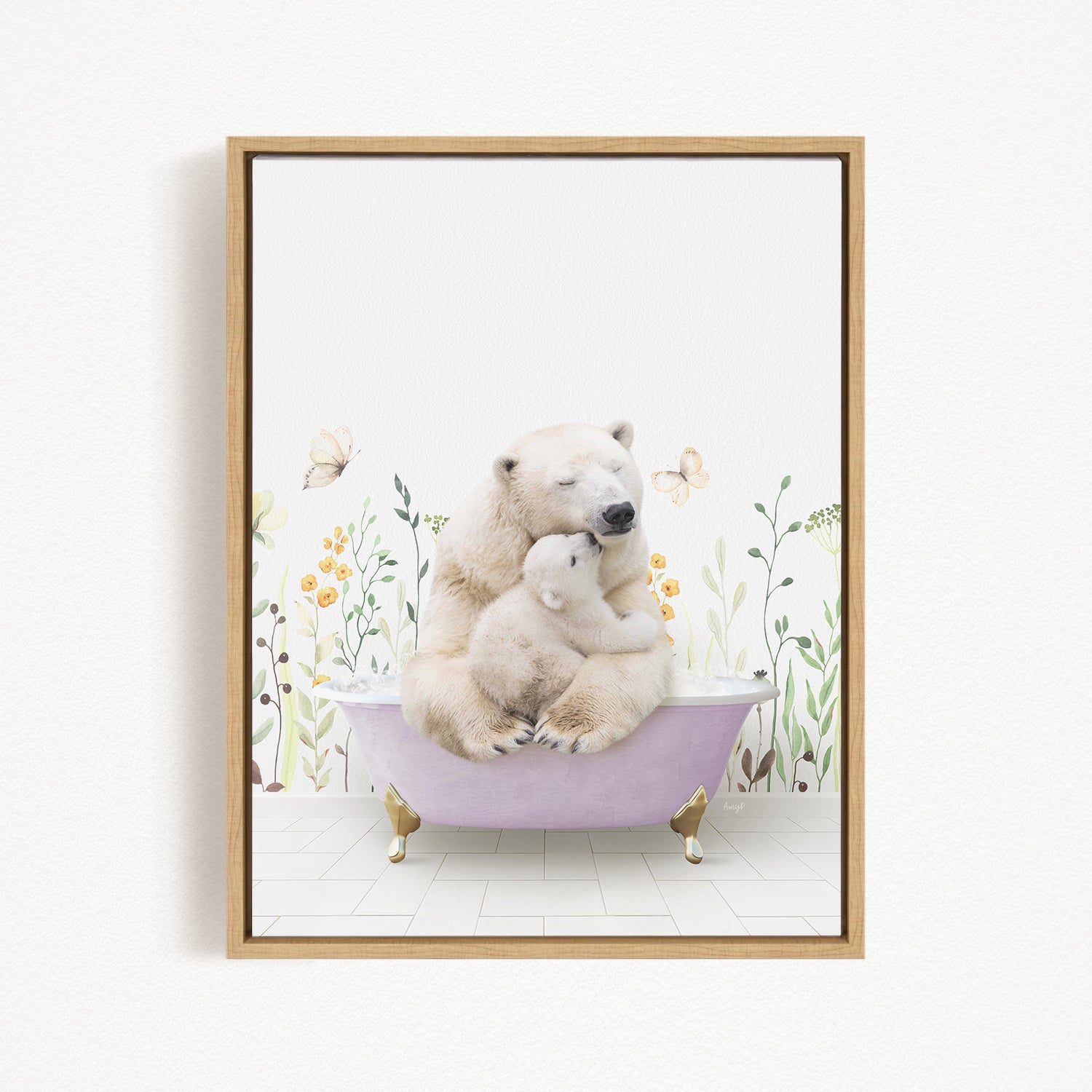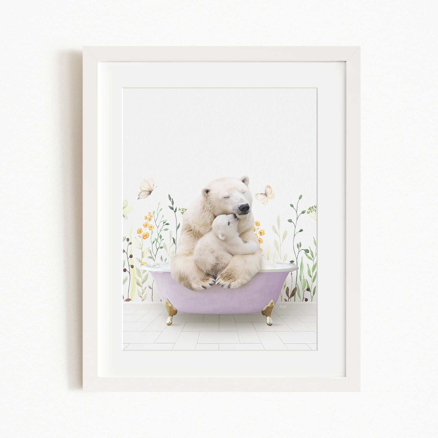 A framed image depicting a mother polar bear sitting in a bathtub, with her cub resting on her lap, surrounded by flowers and butterflies.