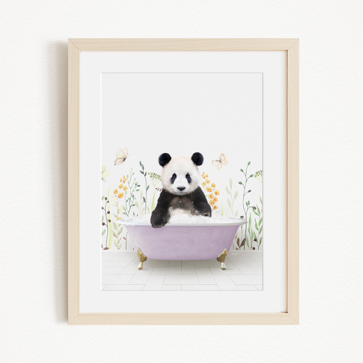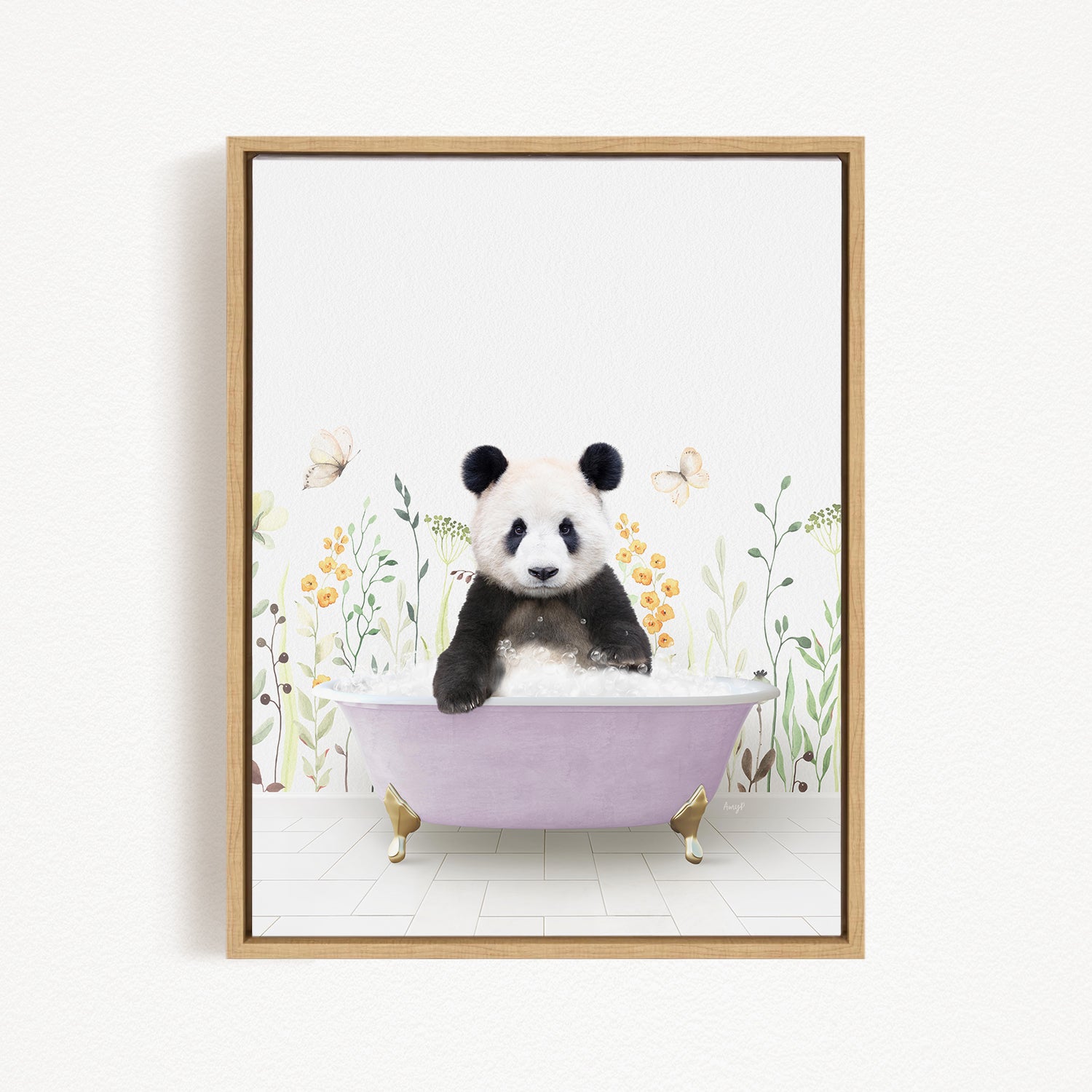 A panda bear sitting in a purple bathtub surrounded by flowers and butterflies.
