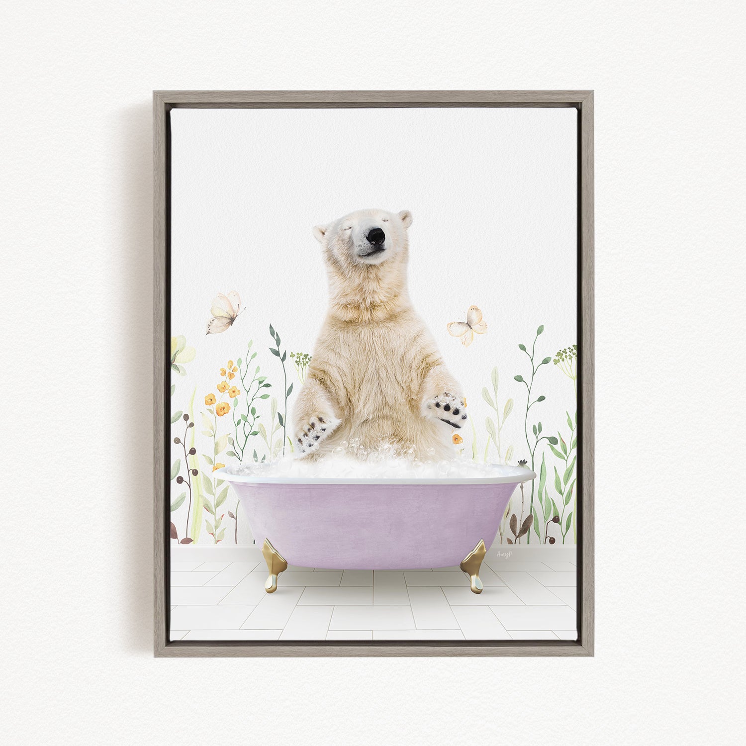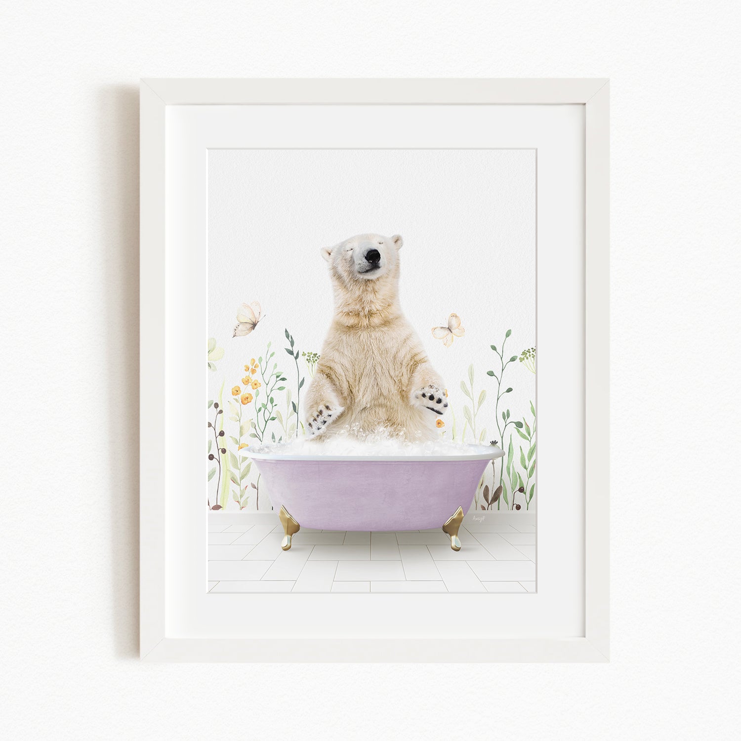 A polar bear sitting in a purple bathtub, surrounded by flowers and butterflies, creating a whimsical and playful scene.
