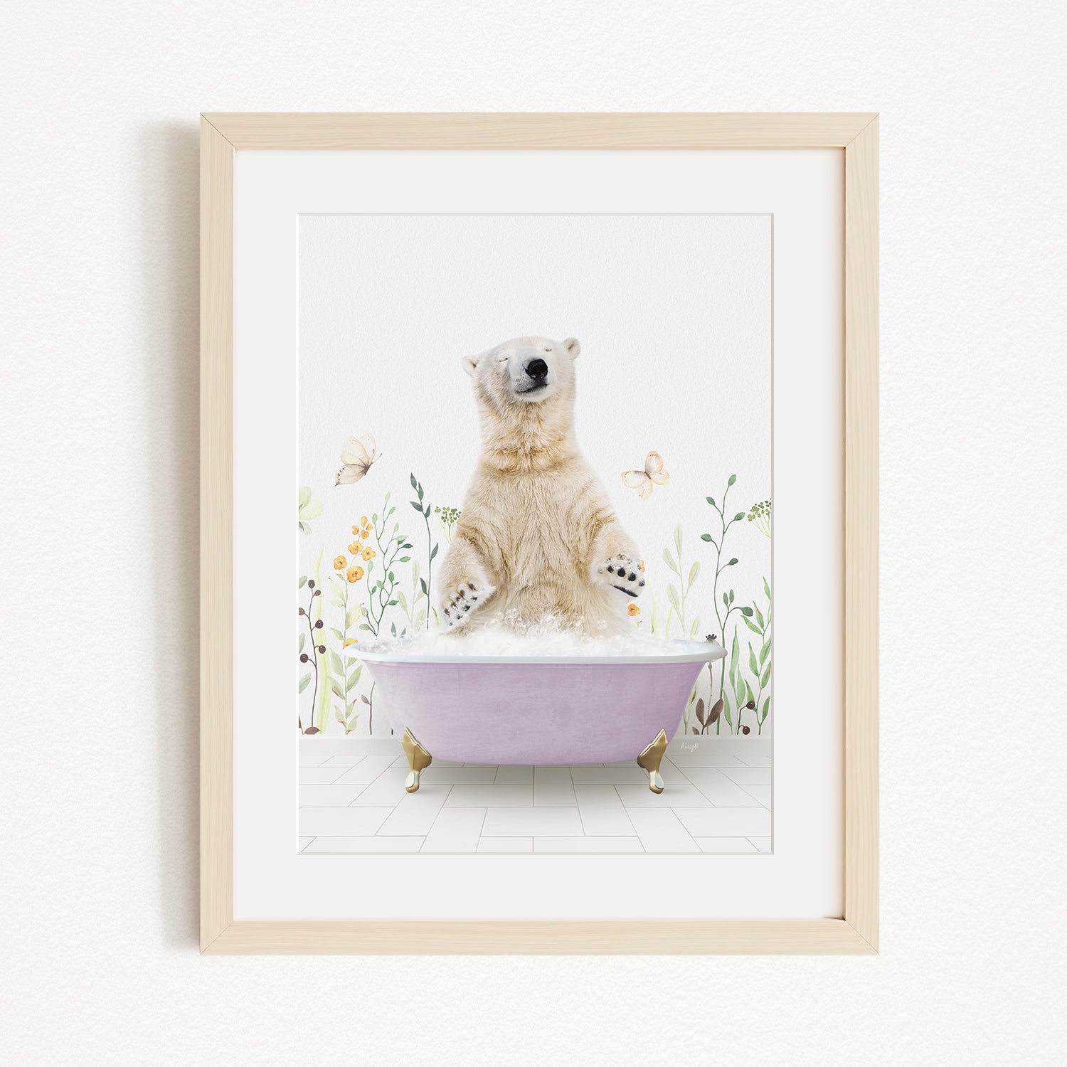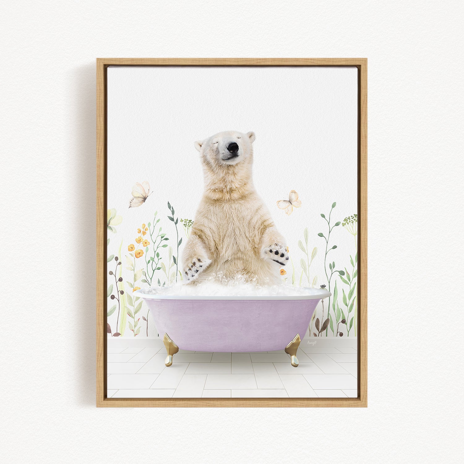 A polar bear sitting in a bathtub filled with bubbles, surrounded by flowers and butterflies.