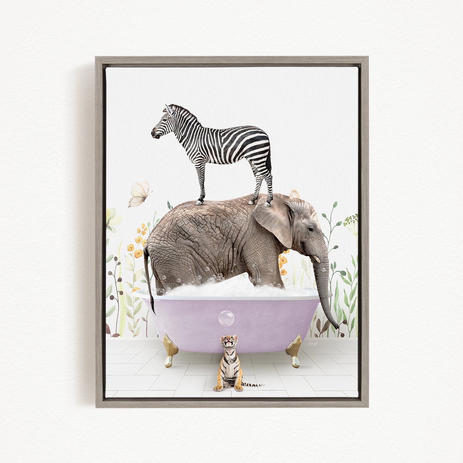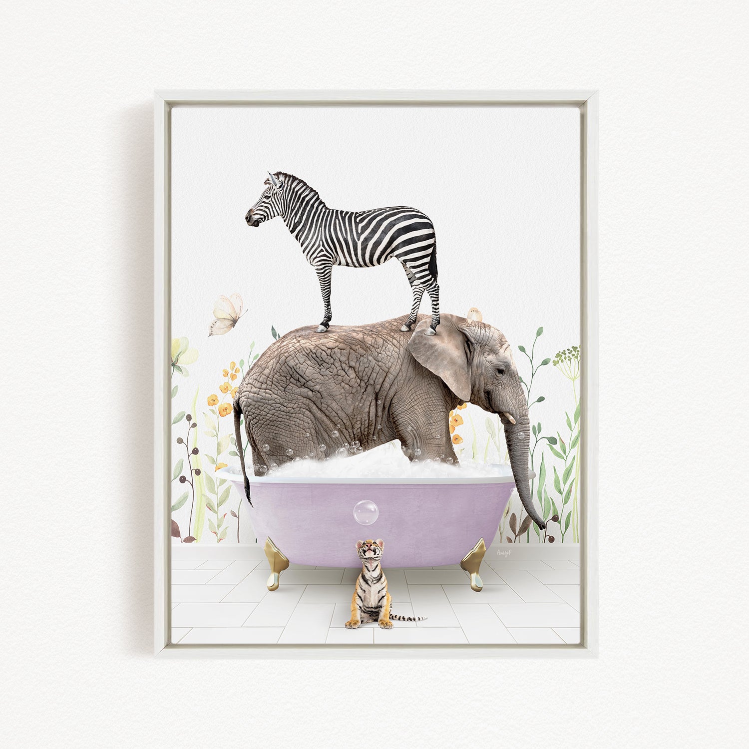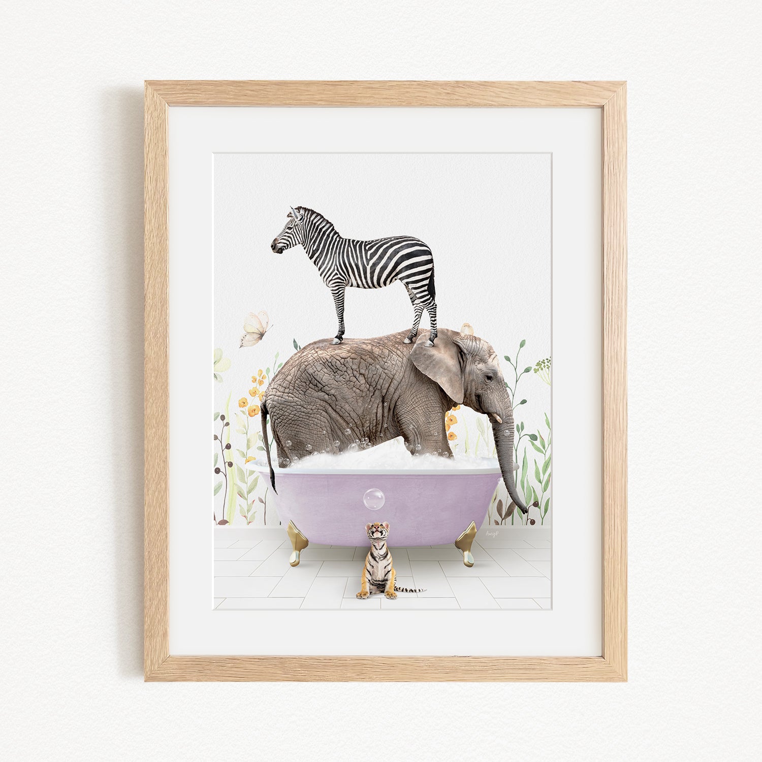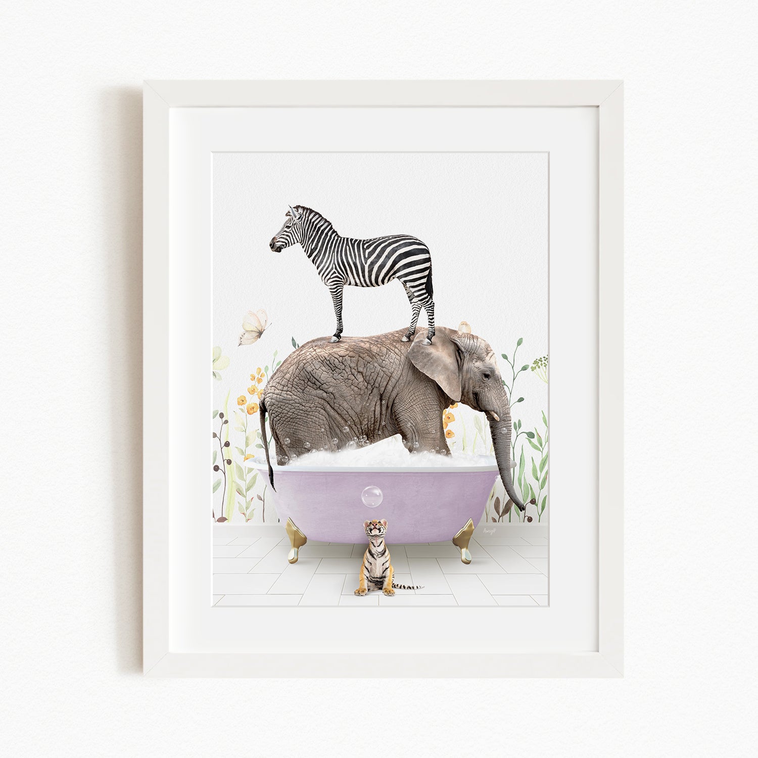 A zebra stands atop an elephant in a bathtub, surrounded by a tiger and butterflies, creating a whimsical and surreal scene.