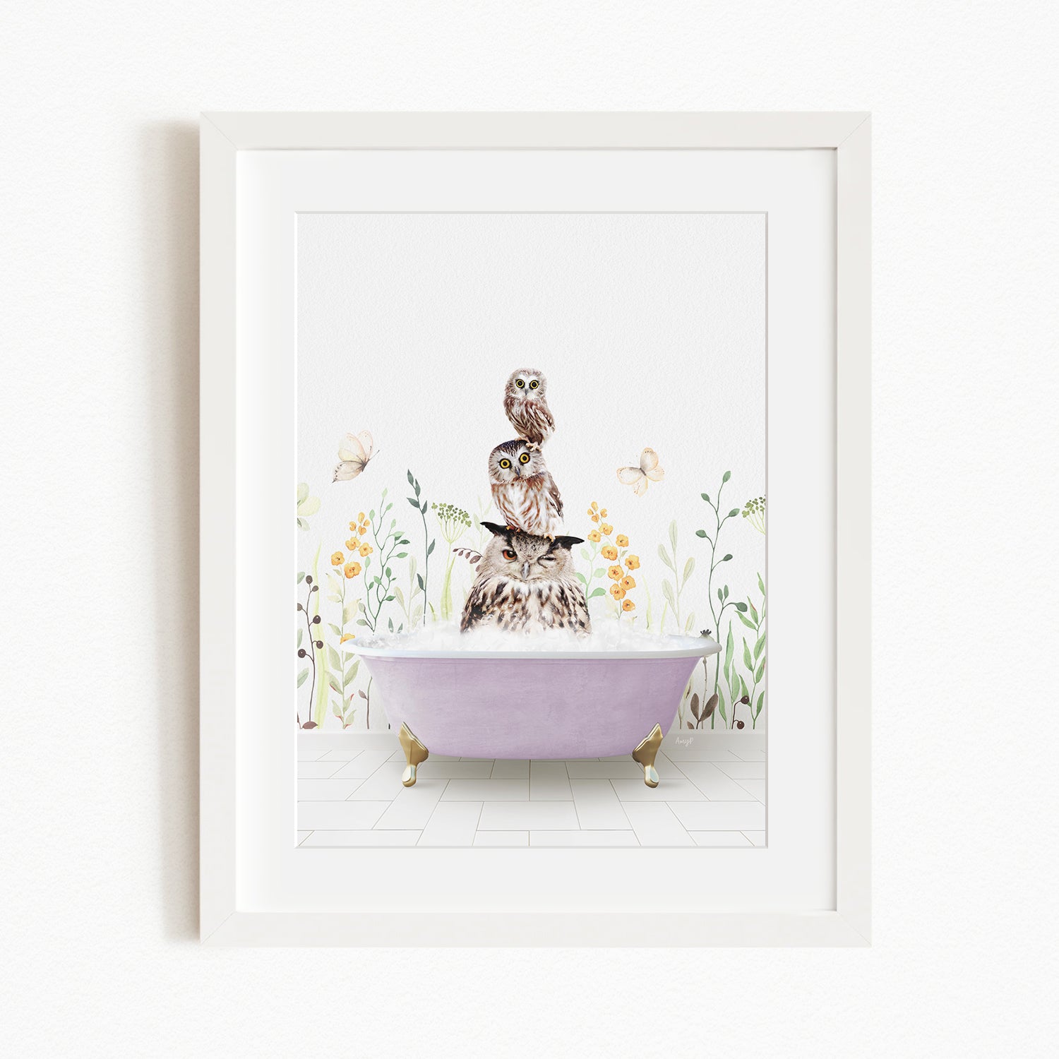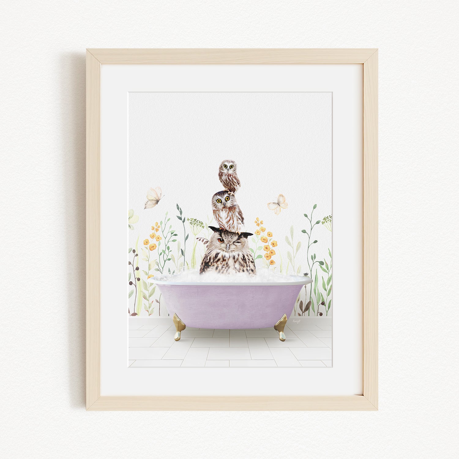 A framed print depicting a whimsical scene of three owls sitting on a purple bathtub, surrounded by flowers and butterflies.