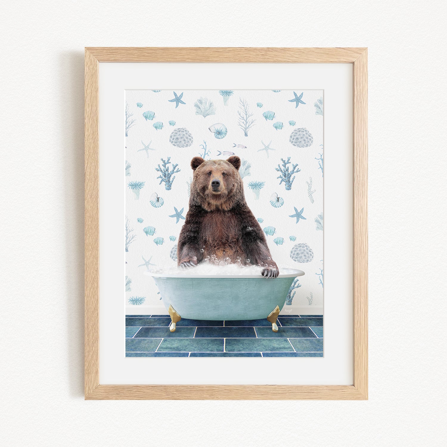 A brown bear sitting in a blue bathtub filled with bubbles, surrounded by a pattern of seashells and starfish on the wall behind it.