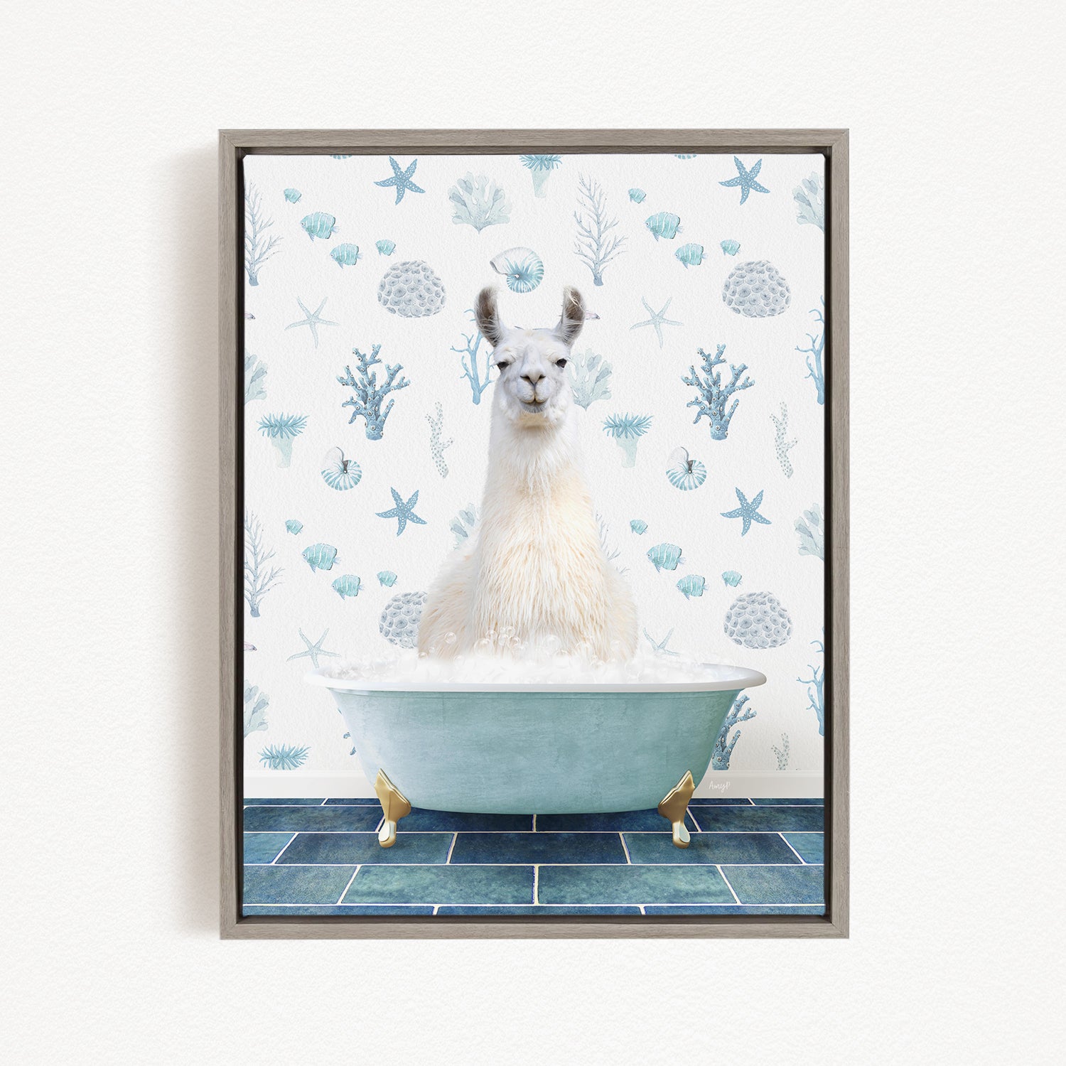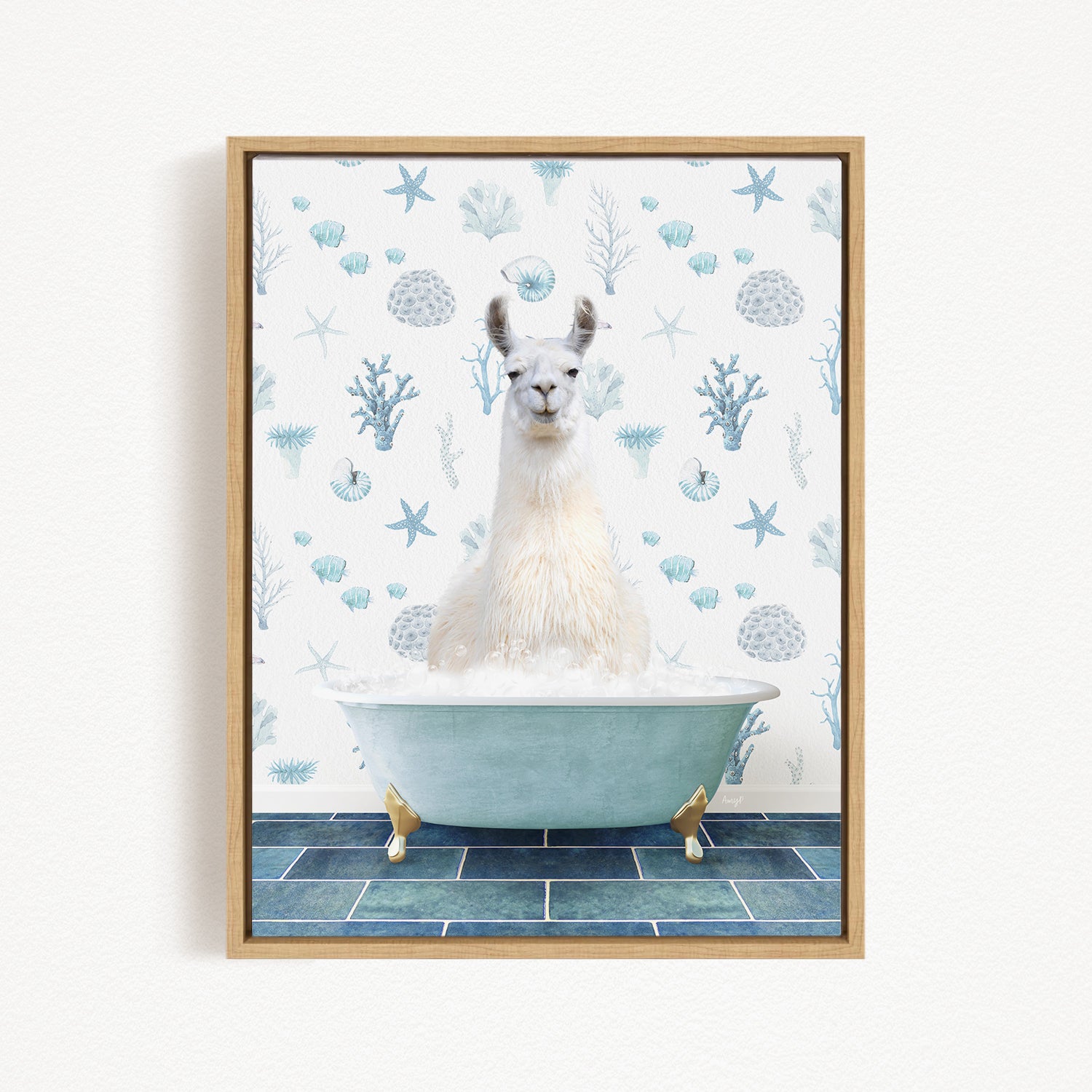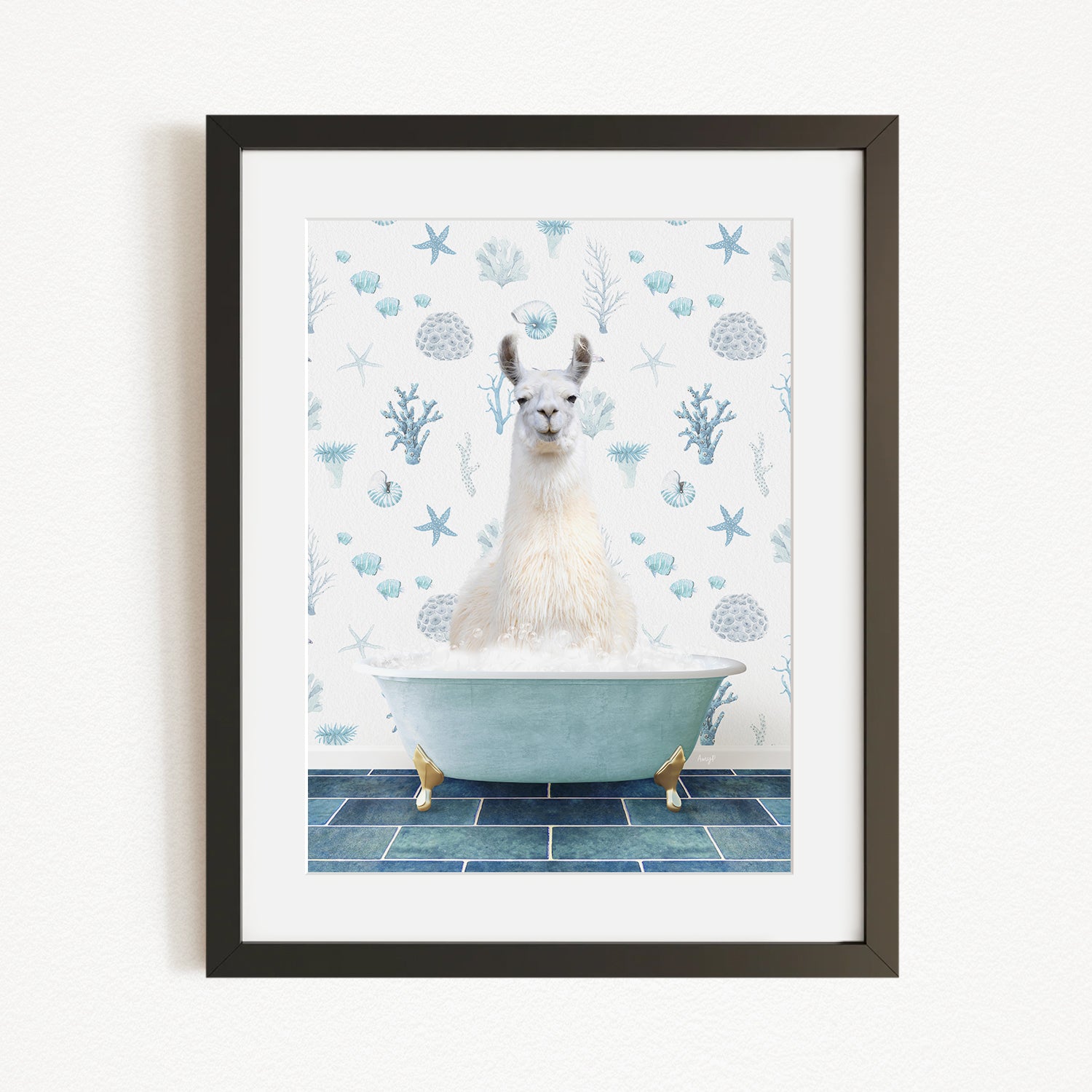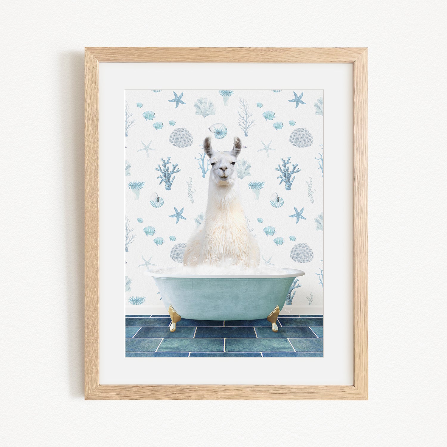 A white llama sitting in a blue bathtub filled with bubbles, surrounded by a pattern of blue and white seashells and starfish.