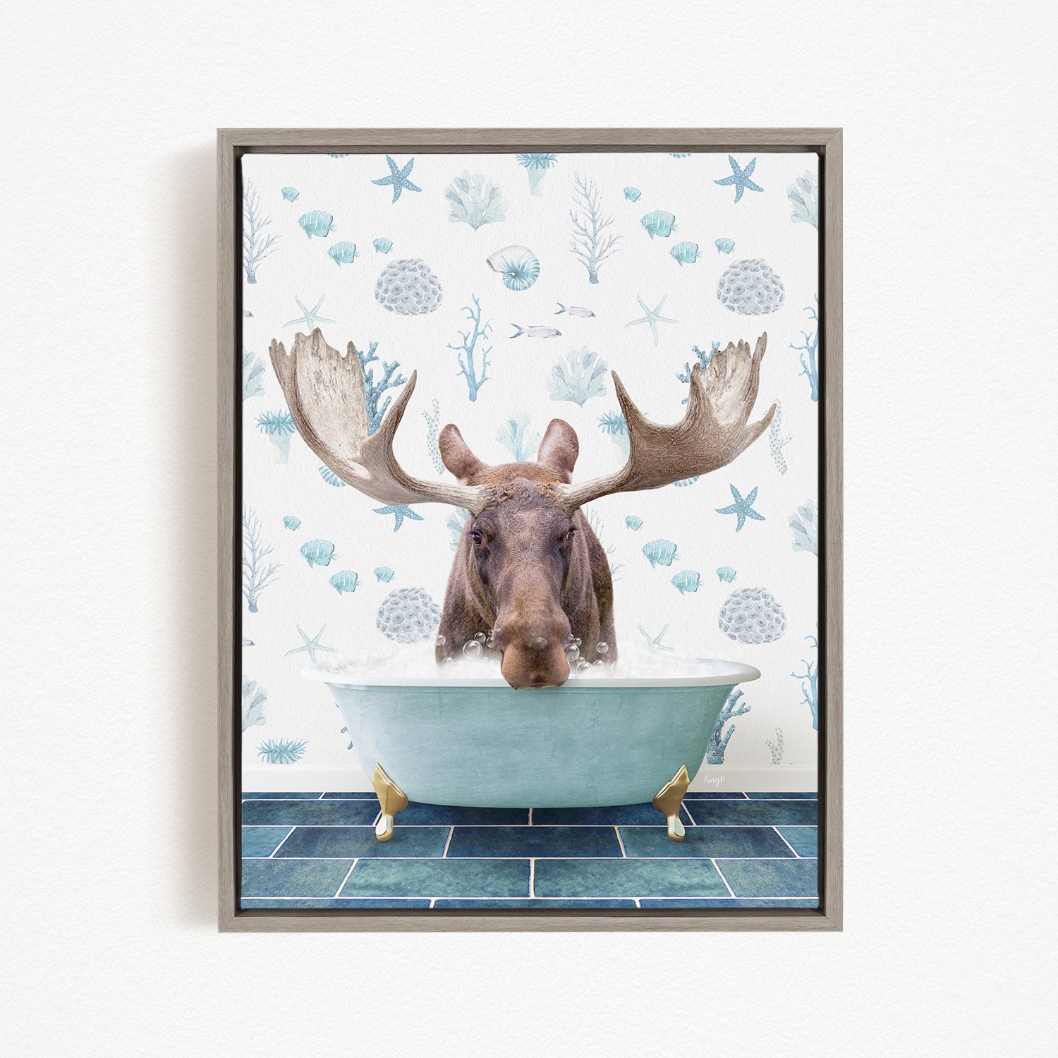A framed image depicting a moose with large antlers sitting in a bathtub filled with bubbles, surrounded by a blue and white ocean-themed background.