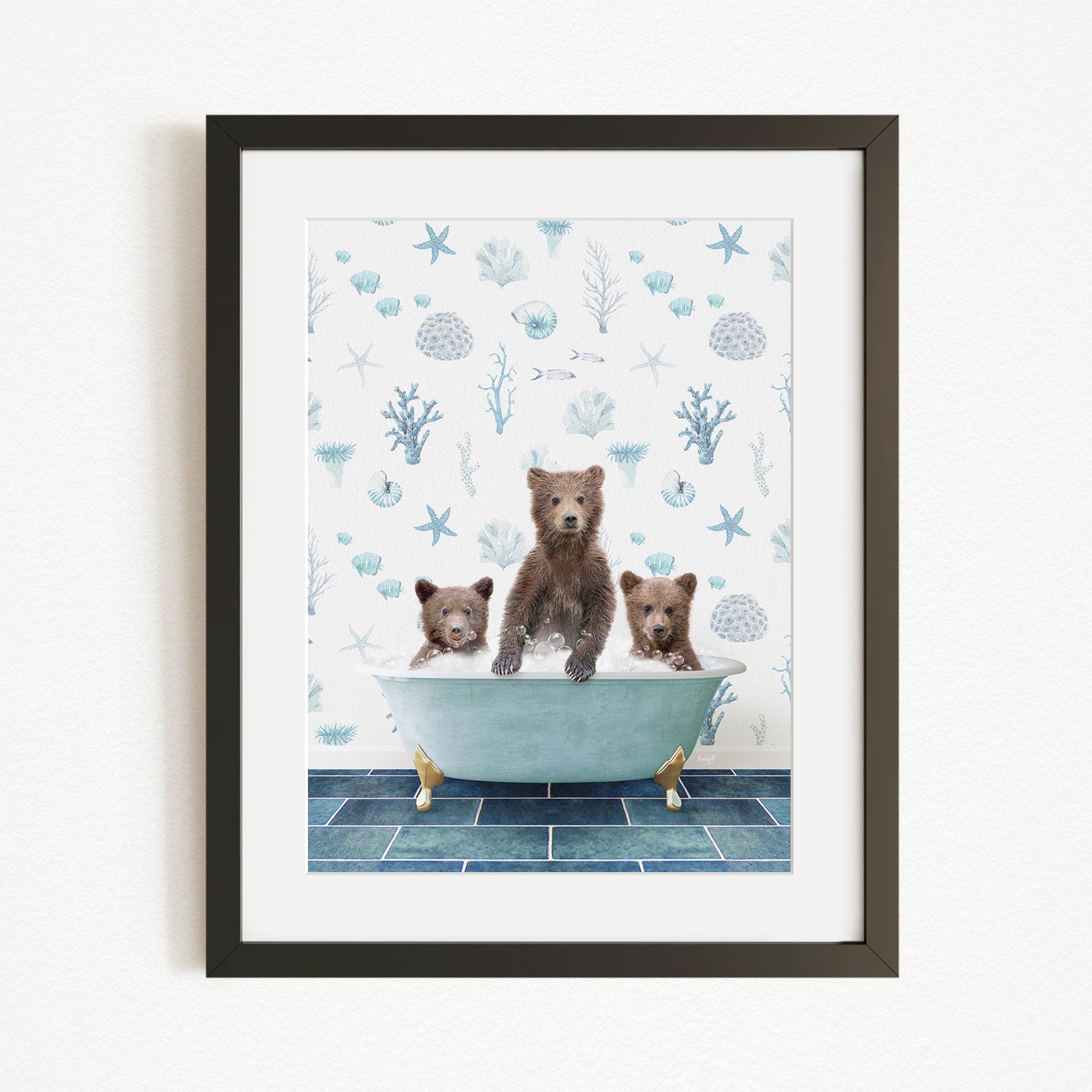 A framed image depicting three brown bears sitting in a bathtub filled with water, surrounded by a blue and white ocean-themed wallpaper.