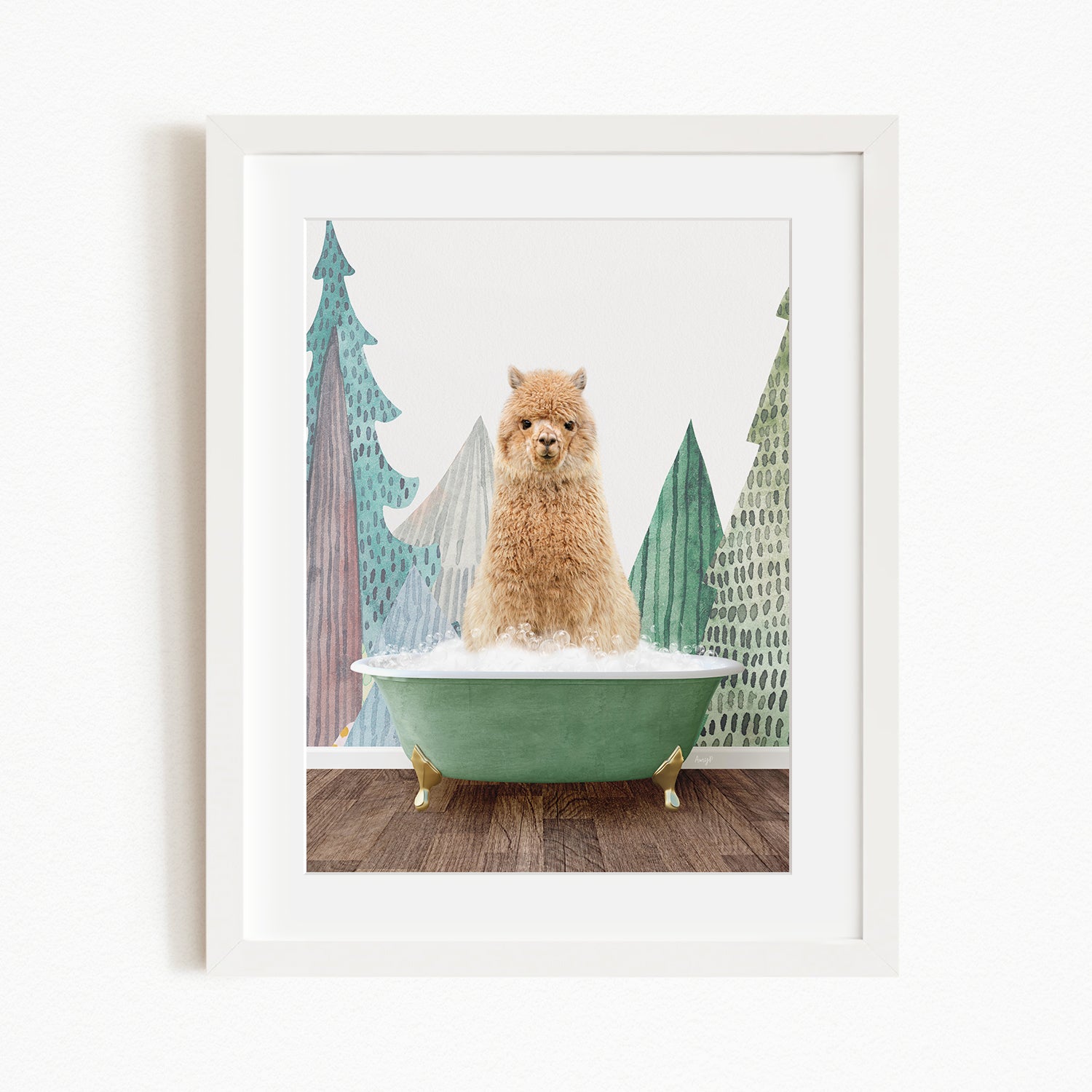 A small brown dog sitting in a green bathtub, surrounded by a forest-themed background.