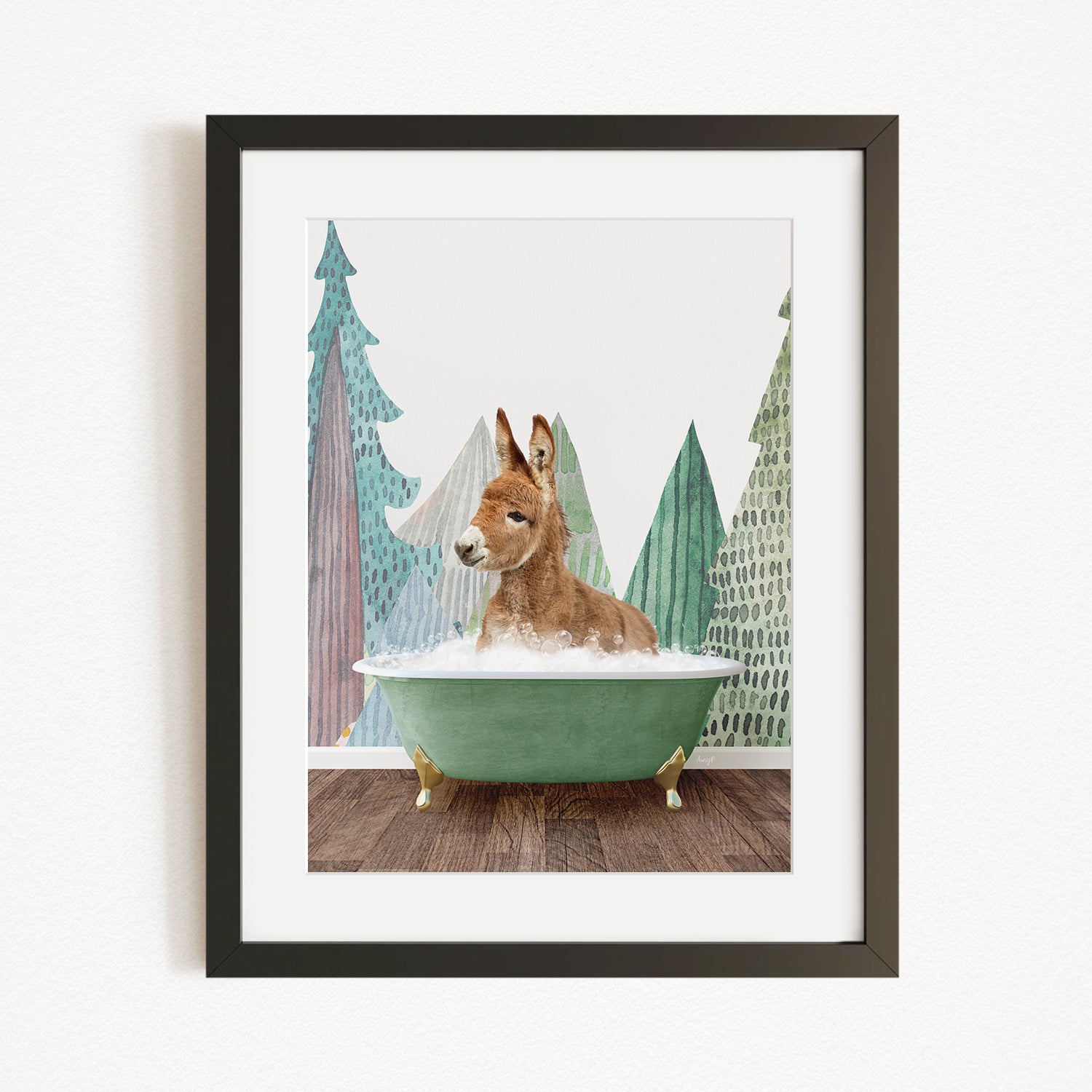 A donkey is sitting in a green bathtub, surrounded by a forest-themed background with trees and a snowy landscape.