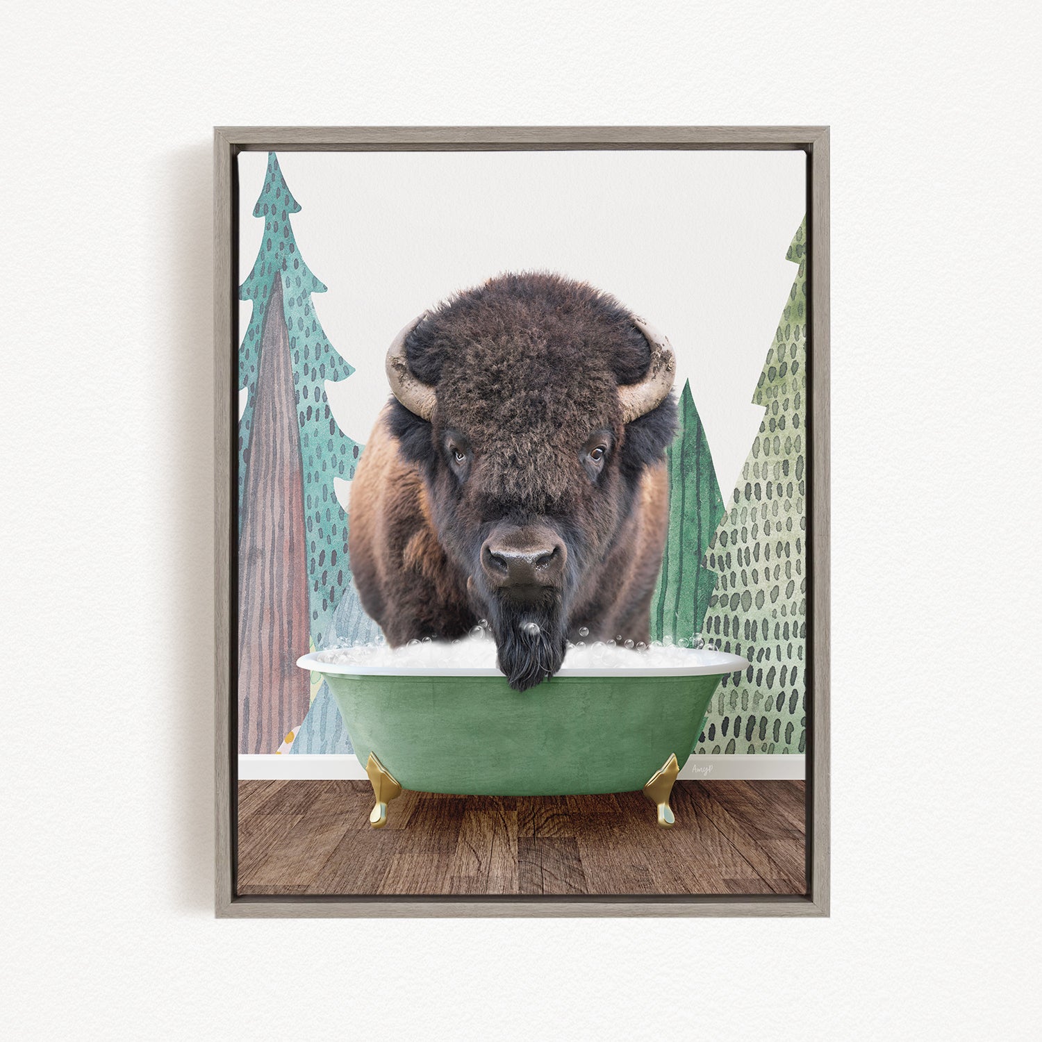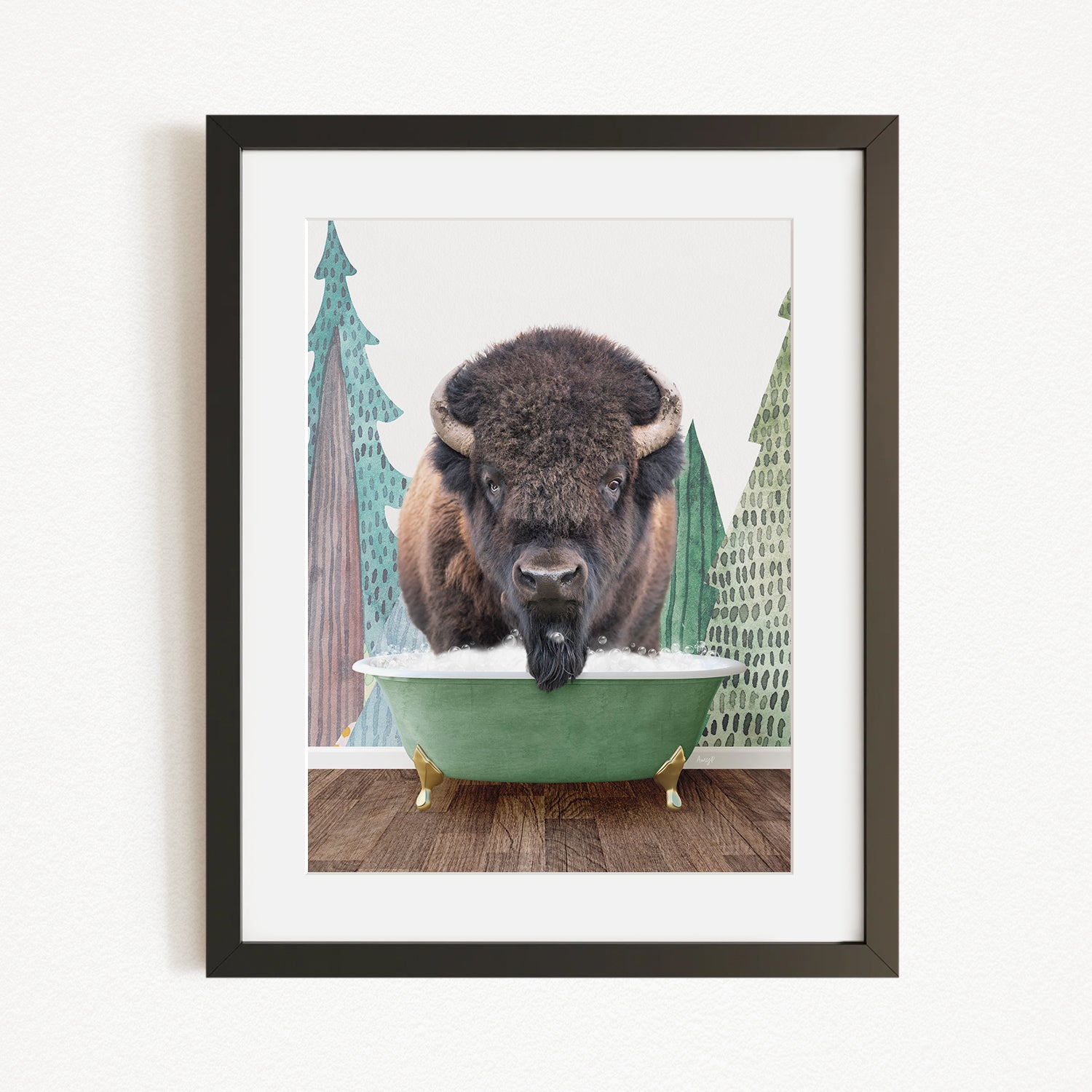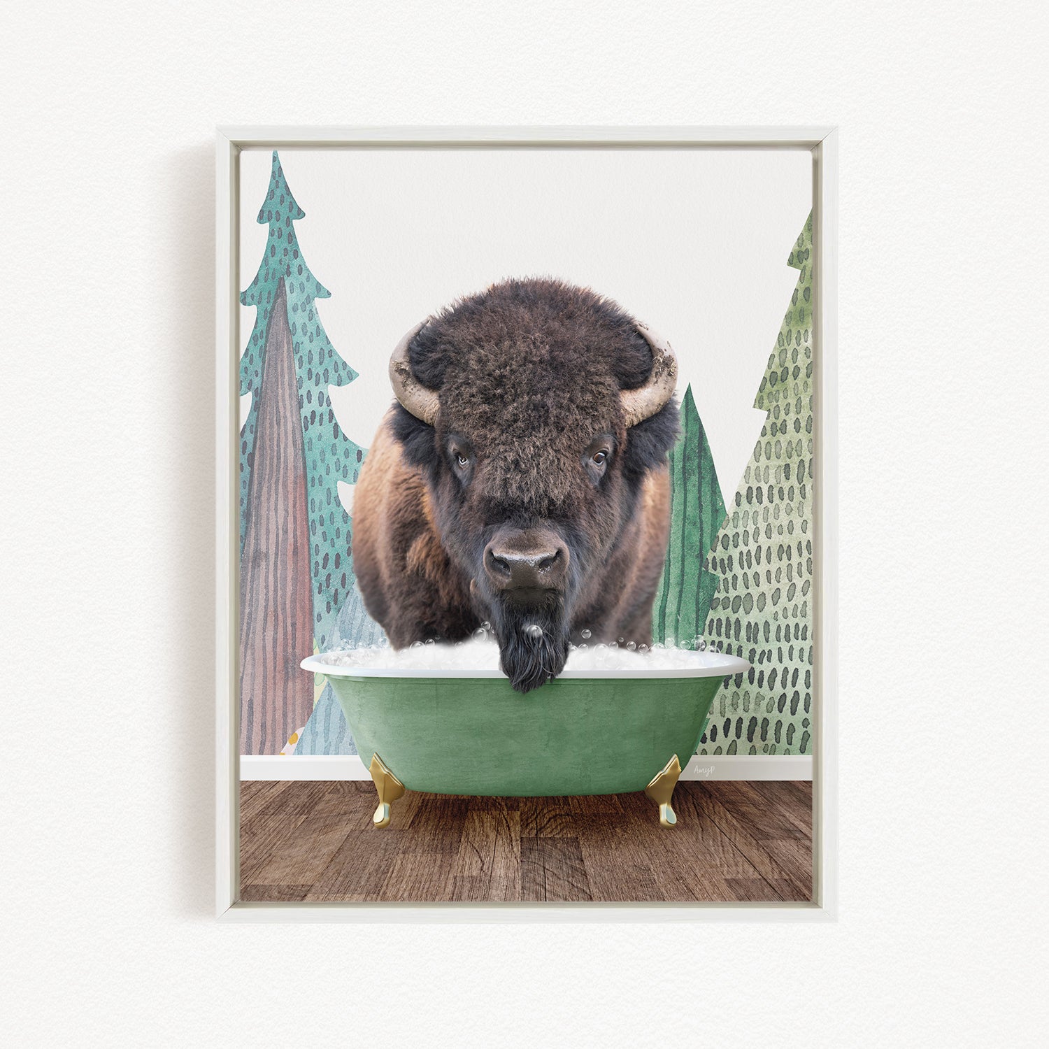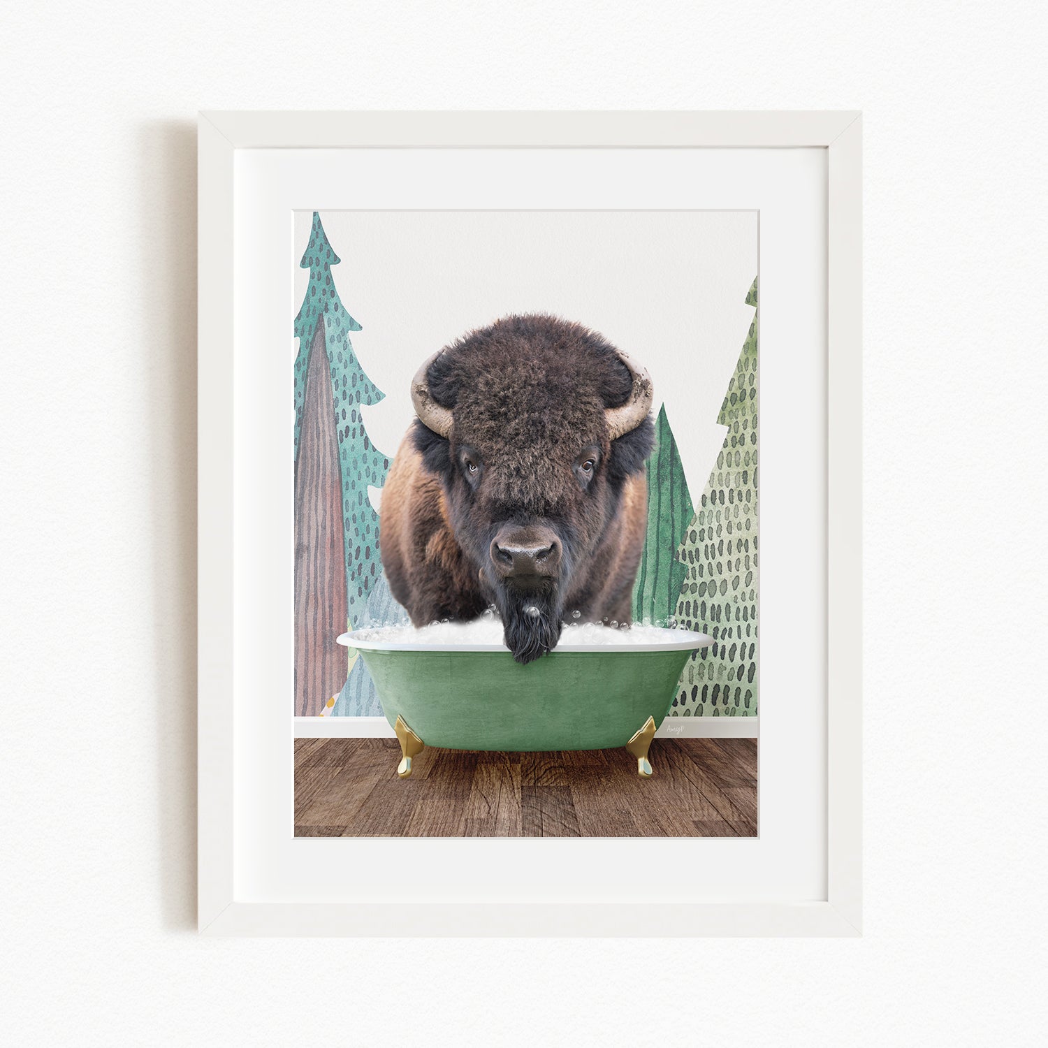 A bison with large horns is standing in a green bathtub, surrounded by pine trees and a snowy landscape.