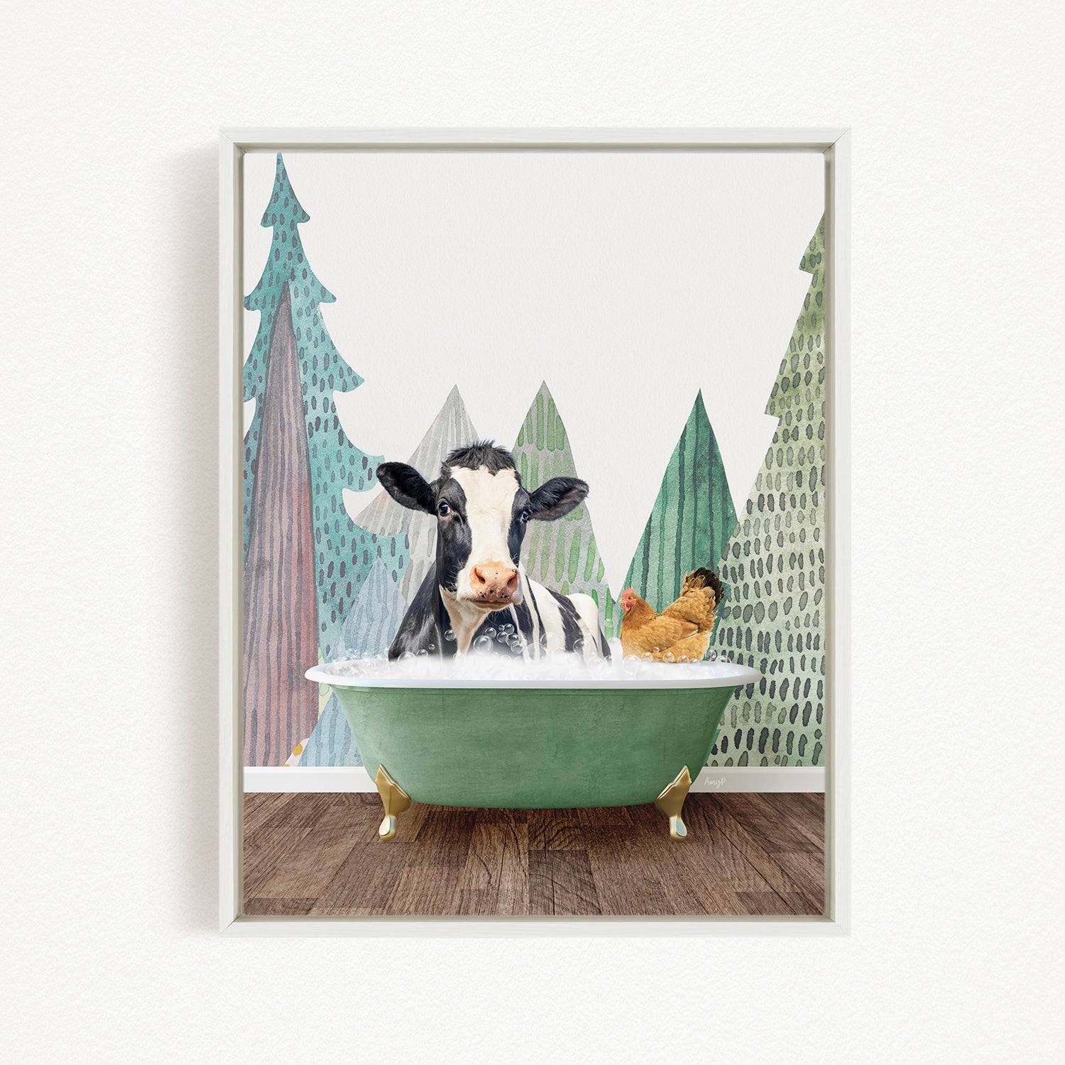 A black and white cow is sitting in a green bathtub, surrounded by a chicken and a bird, with a forest-like background.