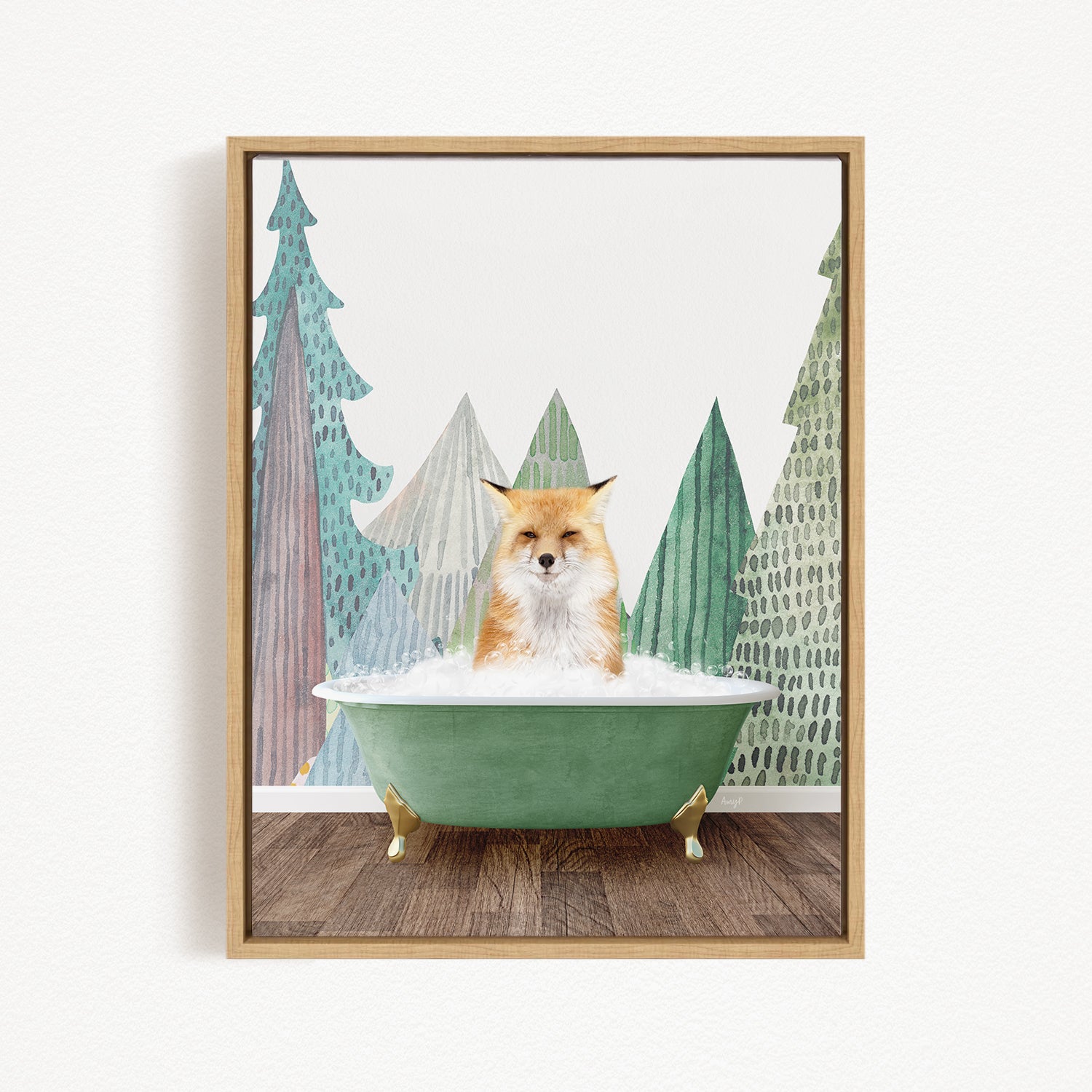 A fox is sitting in a green bathtub, surrounded by stylized trees in various shades of green and brown.